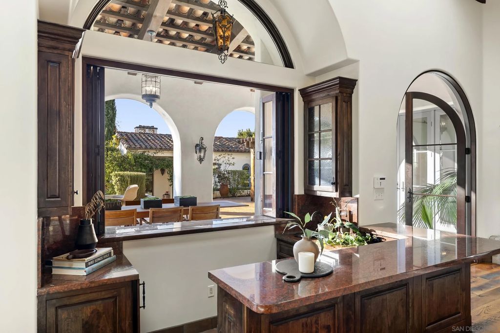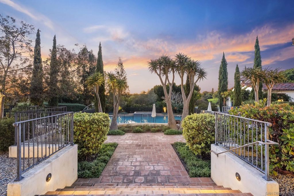 Located at the end of a quiet cul-de-sac in the heart of the Covenant, this exceptional Spanish Revival estate offers approximately 10,000 sq. ft. of luxury living on 1.77 private acres with sweeping western views. Designed and built with extraordinary attention to detail, the home seamlessly blends historic architectural integrity with modern functionality, creating a timeless Rancho Santa Fe retreat. The main residence features an oversized primary suite with dual bathrooms and walk-in closets, fireplace, coffee bar, and a covered veranda overlooking the backyard. Secondary bedroom suites are all generously sized and privately situated, each with convenient access to the state-of-the-art home theater. Custom finishes throughout include arched hallways, groin-vaulted ceilings with herringbone brick detailing, exposed wood beams, hand-carved stone fireplaces, reclaimed oak and chestnut flooring, leathered Saltillo tile, hand-painted Mexican tiles, and custom wrought-iron railings and gates. Intimate courtyards and covered loggias create seamless indoor-outdoor living in true California hacienda style. The resort-style grounds feature a 1 bd 1 bath guest house, resort style pool, sports court, chicken coop, expansive patios, manicured landscaping, and serene outdoor entertaining areas, all set within one of Rancho Santa Fe's most coveted and private Covenant locations.