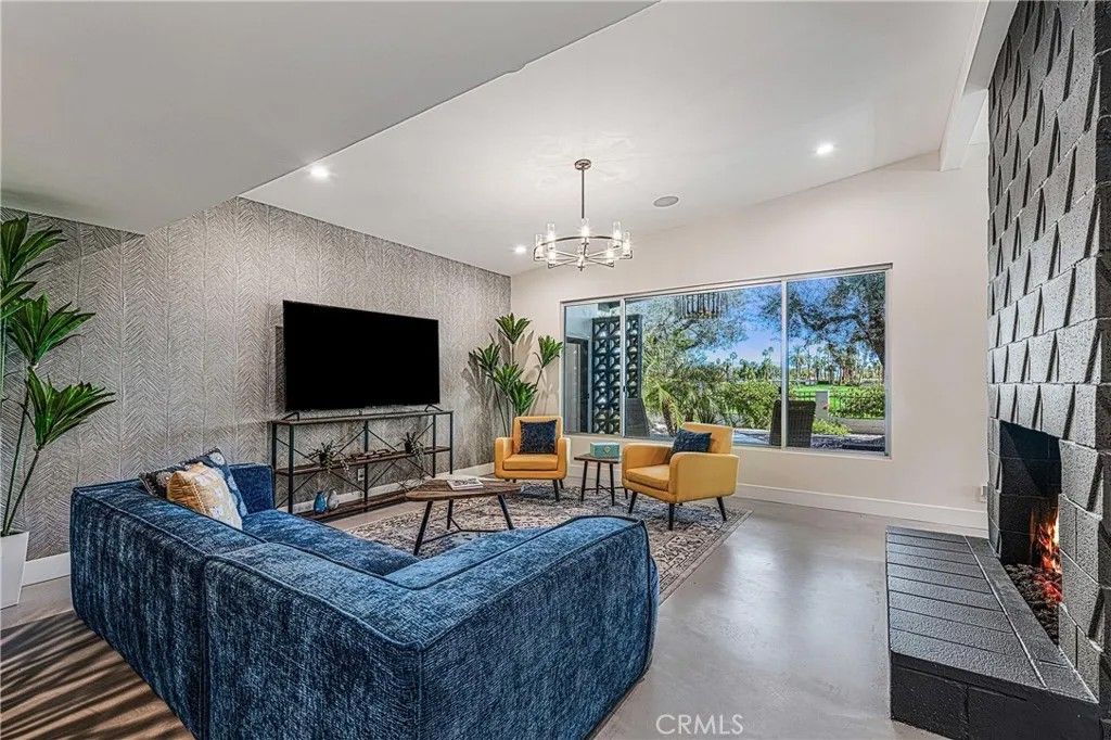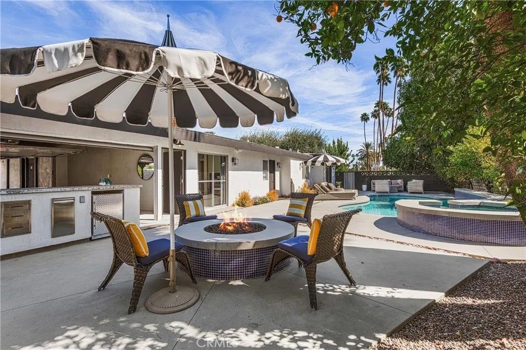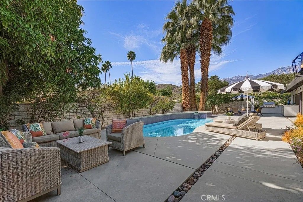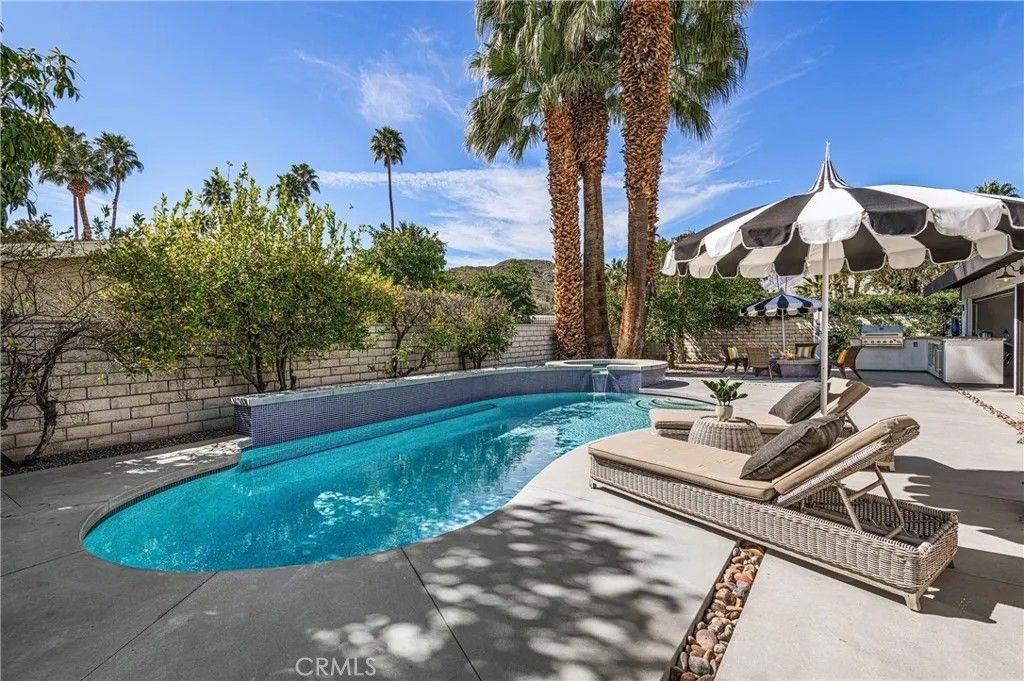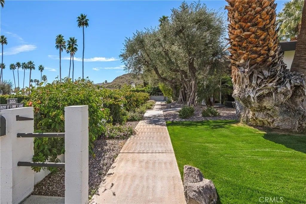 Discover timeless mid-century modern charm at 5155 East Bobolink Lane, a single-level desert retreat positioned between the 6th and 7th fairways of the Legend Course at Tahquitz Creek Golf Club. Built in 1962 and thoughtfully updated, this 4-bedroom, 3-bath home offers approximately 2,425 square feet of light-filled living with vaulted ceilings, a dual-sided vintage block fireplace, and an open chefs kitchen anchored by an oversized island and buffet with beverage fridgeideal for entertaining. The primary suite enjoys privacy and serene fairway views, a walk-in closet, and a spa-like bath with separate tub and shower. Step outside to resort-style grounds on a generous 10,454 sq ft lot: saltwater pool and spa with waterfall, new pool decking, circular fire pit, outdoor kitchen, shower, and multiple patios framed by swaying palms and mountain panoramas. Recent improvements include a new roof, updated HVAC, smooth stucco, upgraded electrical and lighting, and epoxied concrete floors, providing modern comfort with classic architectural character. With no HOA or land lease and current eligibility for a short-term rental permit, the property suits full-time residents, seasonal escapees, or investors seeking turnkey desert lifestyle income. Two-car garage, covered parking and flexible workshop/golf-cart space complete the package. Experience effortless indoor-outdoor living, dramatic views, and rare golf-course frontageschedule a private showing today and make this Palm Springs classic your own. Located minutes from downtown Palm Springs' vibrant dining, shopping and cultural scene, this iconic residence offers both peaceful solitude and easy access to city amenitiesan extraordinary opportunity in a coveted south-end neighborhood today.