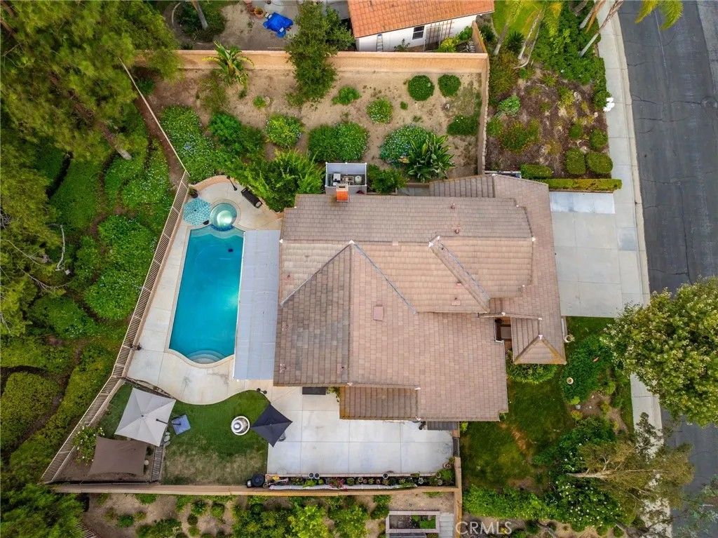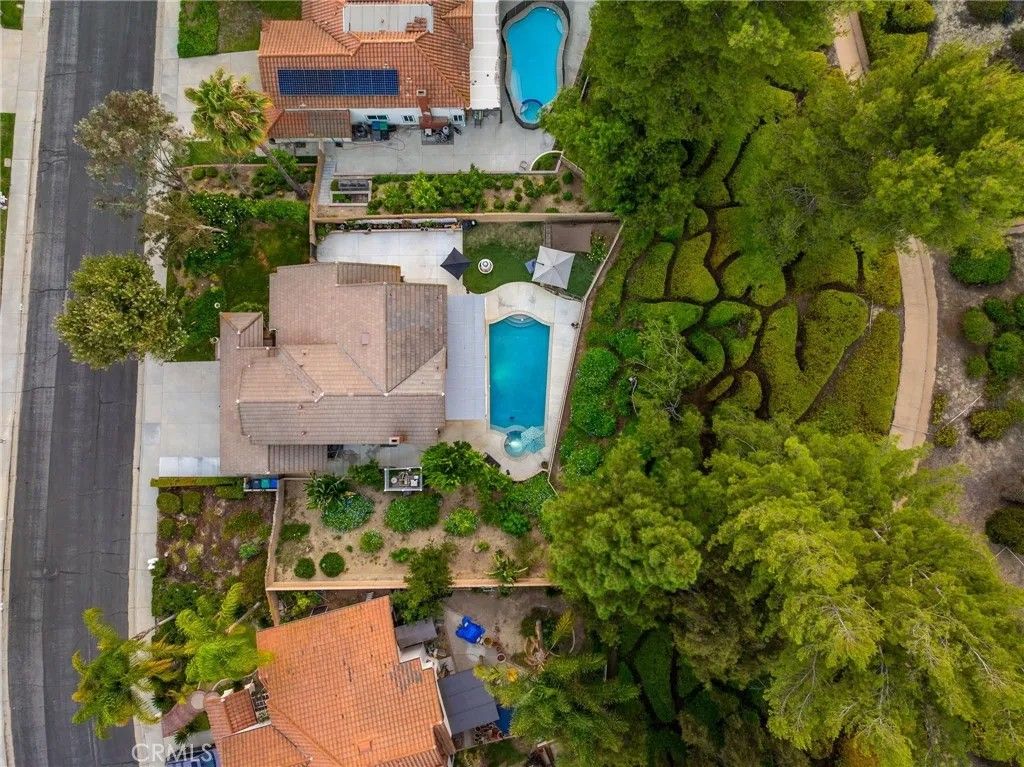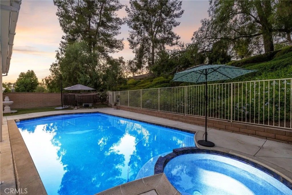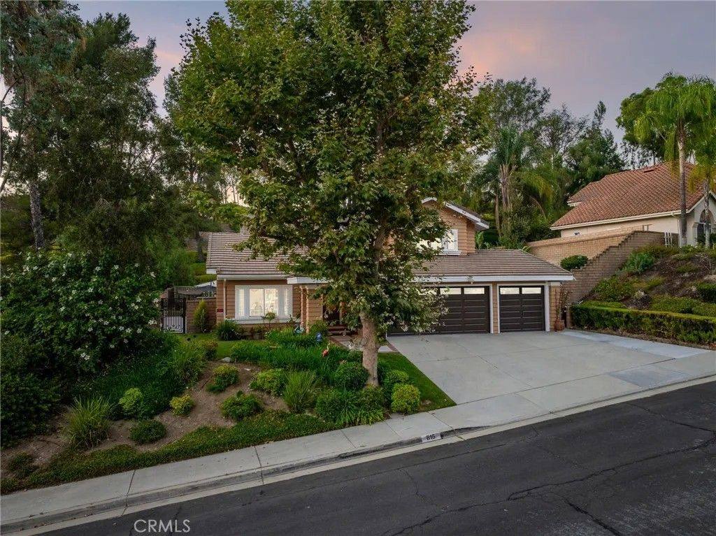 Completely remodeled and set on an elevated lot, this home showcases a beautiful pool and spa with a private backyard that opens to a manicured greenbelt. The front yard is nicely landscaped with mature trees, hedges, and a lush lawn. A brick-ribbon walkway leads to the elegant front door, opening to a marble entry and an open floor plan with soaring vaulted ceilings and a sweeping staircase. The living room features luxury vinyl plank flooring, a picture window overlooking the front yard, and flows into the formal dining room with backyard views. The remodeled kitchen offers custom cabinetry with gold hardware, quartz countertops, stainless steel appliances, a farmhouse sink with backyard views, LED lighting, and a breakfast nook. Open to the kitchen, the family room includes a brick fireplace with mantel and a sliding glass door to the backyard, filling the space with natural light and hillside views. The main level also includes a bedroom, a remodeled hall bath with designer finishes, and a laundry room with direct access to the finished three-car garage. Upstairs, the primary suite with vaulted ceilings and carpet flooring features double-door entry and serene hillside views. The luxurious bath offers dual vanities, a makeup counter, gold fixtures, a custom tiled shower with frameless glass enclosure, a soaking tub with matching surround, and a walk-in closet. Two additional bedrooms, including one with vaulted ceilings, share a beautifully remodeled hall bath. The backyard is designed for entertaining with a pebble-finished pool and spa, a high patio cover with LED lighting and ceiling fans, expansive concrete decking, a grass play area, fenced dog run, generous side yards, and peaceful hillside views.
