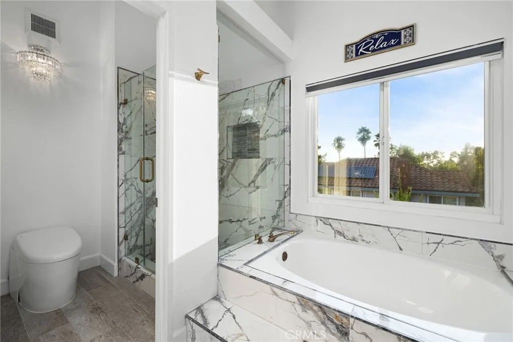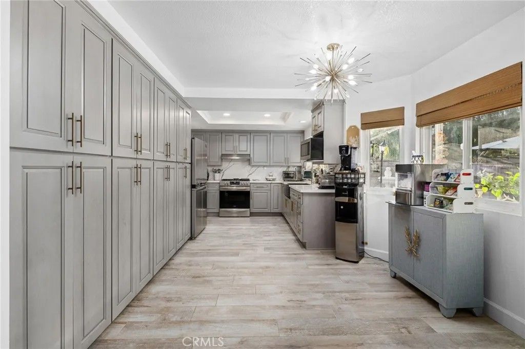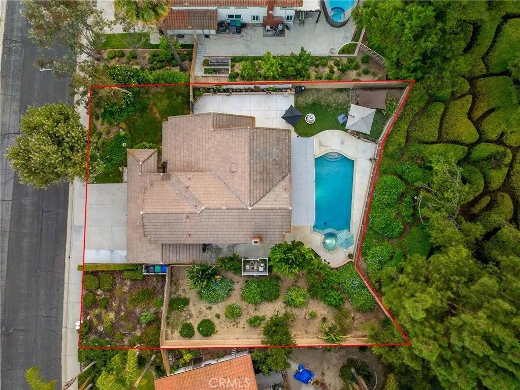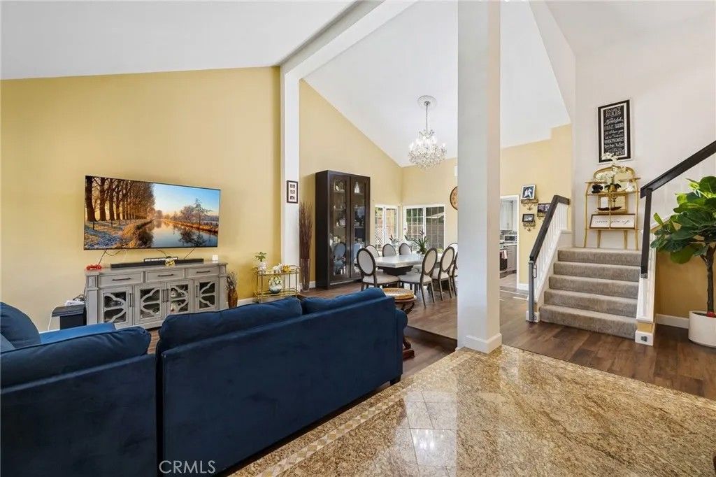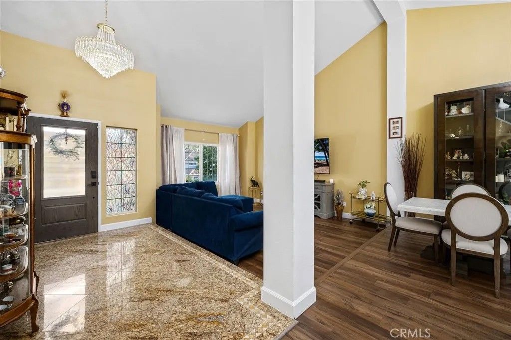 Completely remodeled and set on an elevated lot, this home showcases a beautiful pool and spa with a private backyard that opens to a manicured greenbelt. The front yard is nicely landscaped with mature trees, hedges, and a lush lawn. A brick-ribbon walkway leads to the elegant front door, opening to a marble entry and an open floor plan with soaring vaulted ceilings and a sweeping staircase. The living room features luxury vinyl plank flooring, a picture window overlooking the front yard, and flows into the formal dining room with backyard views. The remodeled kitchen offers custom cabinetry with gold hardware, quartz countertops, stainless steel appliances, a farmhouse sink with backyard views, LED lighting, and a breakfast nook. Open to the kitchen, the family room includes a brick fireplace with mantel and a sliding glass door to the backyard, filling the space with natural light and hillside views. The main level also includes a bedroom, a remodeled hall bath with designer finishes, and a laundry room with direct access to the finished three-car garage. Upstairs, the primary suite with vaulted ceilings and carpet flooring features double-door entry and serene hillside views. The luxurious bath offers dual vanities, a makeup counter, gold fixtures, a custom tiled shower with frameless glass enclosure, a soaking tub with matching surround, and a walk-in closet. Two additional bedrooms, including one with vaulted ceilings, share a beautifully remodeled hall bath. The backyard is designed for entertaining with a pebble-finished pool and spa, a high patio cover with LED lighting and ceiling fans, expansive concrete decking, a grass play area, fenced dog run, generous side yards, and peaceful hillside views.