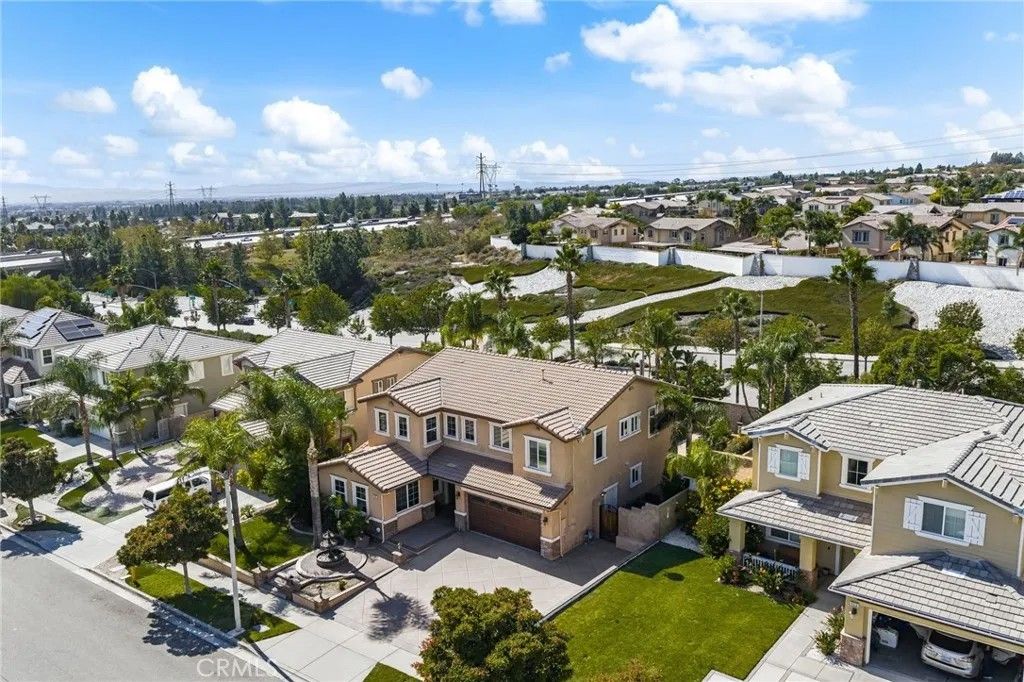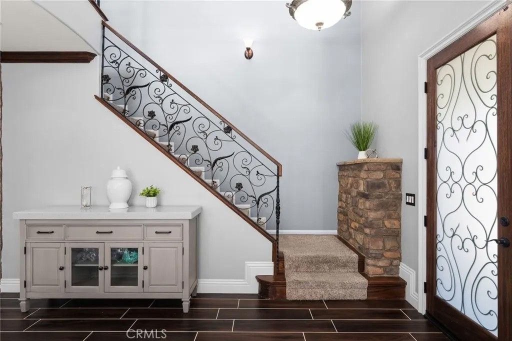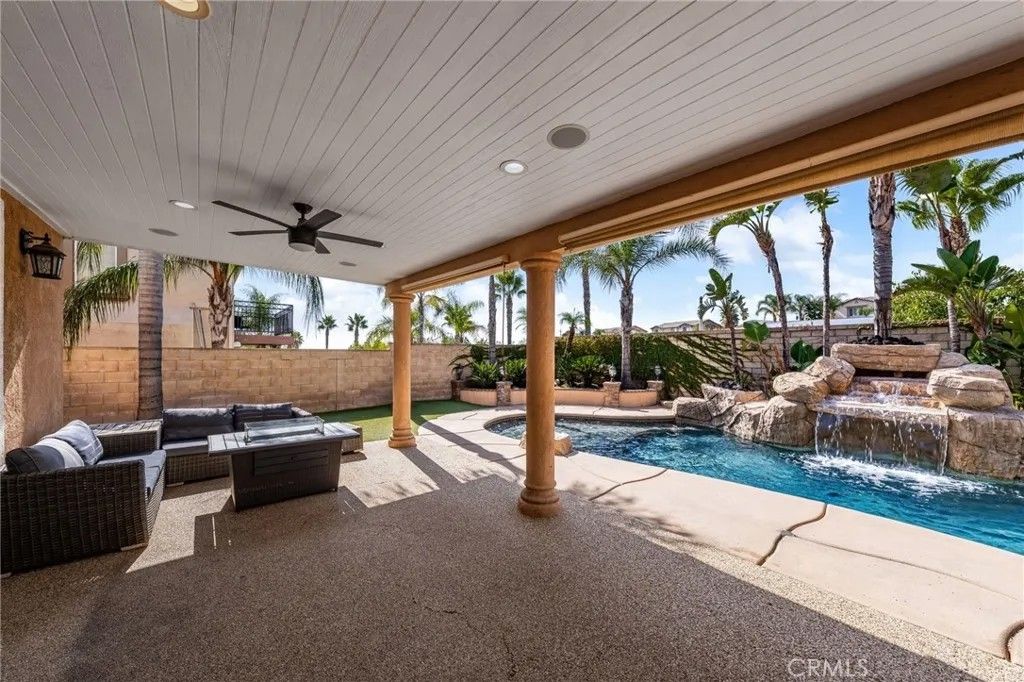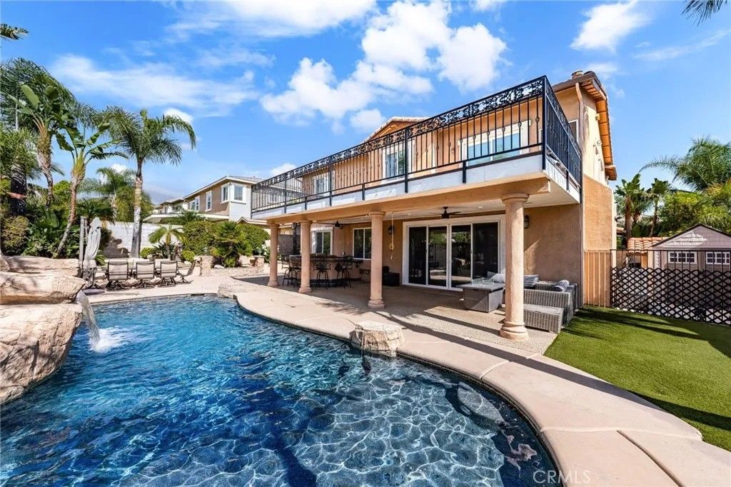 This is the one! Welcome to this stunning home featuring a beautiful open floor plan and exceptional curb appeal complete with a custom water fountain welcoming you at the front entry. As you step inside, youll be greeted by an elegant formal living room and dining room with porcelain tile flooring flowing throughout the downstairs. The spacious family room offers a built-in media center, cozy fireplace, and pool views through a custom 9-foot slider accented with designer window coverings. The gourmet remodeled kitchen is a chefs dreamfeaturing a breakfast bar island with pendant lighting, quartz countertops, built-in microwave, and ample cabinetry for storage. This versatile layout includes a main-level bedroom and full bathroom, ideal for guests or multi-generational living, as well as a large home office with built-in cabinetryperfect for remote work. Upstairs, retreat to the luxurious master suite with private access to an oversized deck offering breathtaking mountain and city lights views. The spa-like master bath showcases dual custom stone vanities with raised basins, a separate soaking tub, and a tiled walk-in shower with glass enclosure. The custom walk-in closet has been professionally designed for maximum organization. Additional highlights include crown molding, recessed lighting, custom window coverings, wood flooring upstairs, and a custom carpet runner along the staircase and hallway. The spacious game room features ceiling fans and plush carpet, while the secondary bedrooms are generously sizedone even rivaling a master suite in size. Step outside to your private resort-style backyard! Enjoy the custom saltwater pebble-finish pool with Baja ledge, rock waterfall, and dazzling lava rock fire featurean entertainers dream. The deck and covered patio include a built-in BBQ, lighting, ceiling fan, and outdoor surround sound system. The exterior is equally impressive with stone planters, stamped concrete driveway and lush landscaping. No HOA and conveniently located above the 210 freeway! Dont miss the chance to make this incredible home yours!