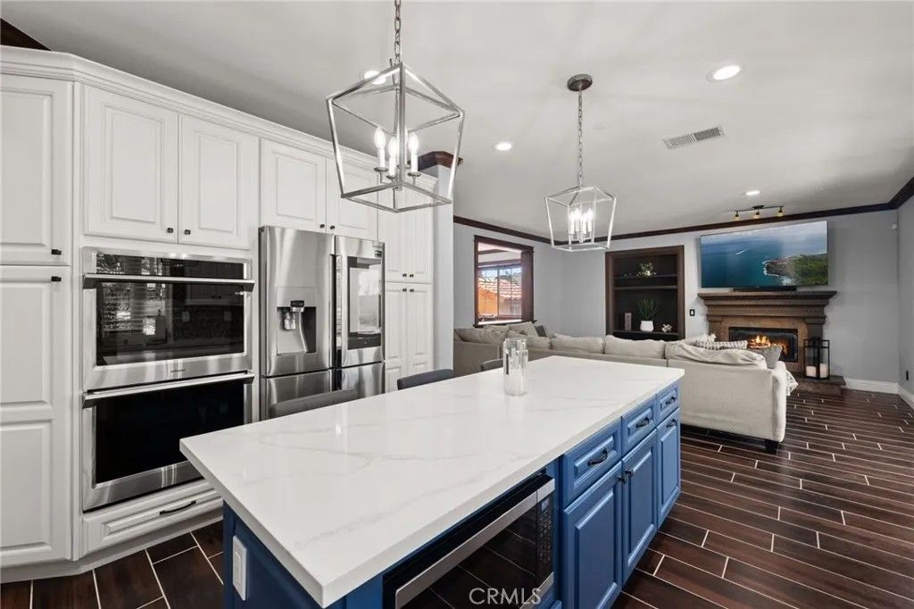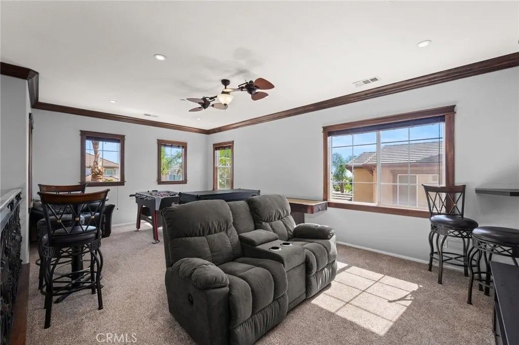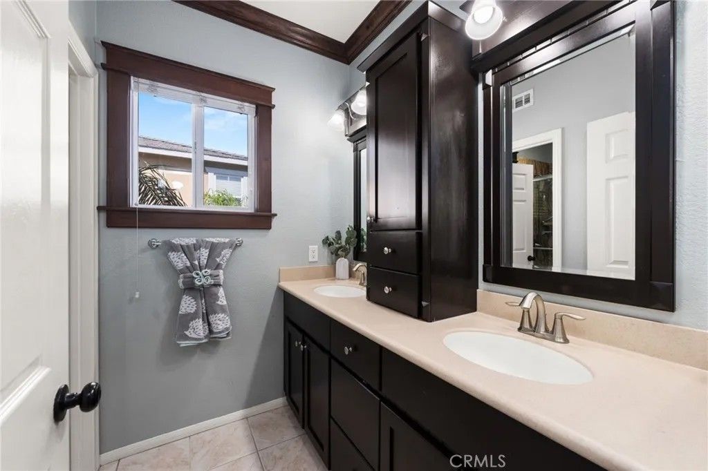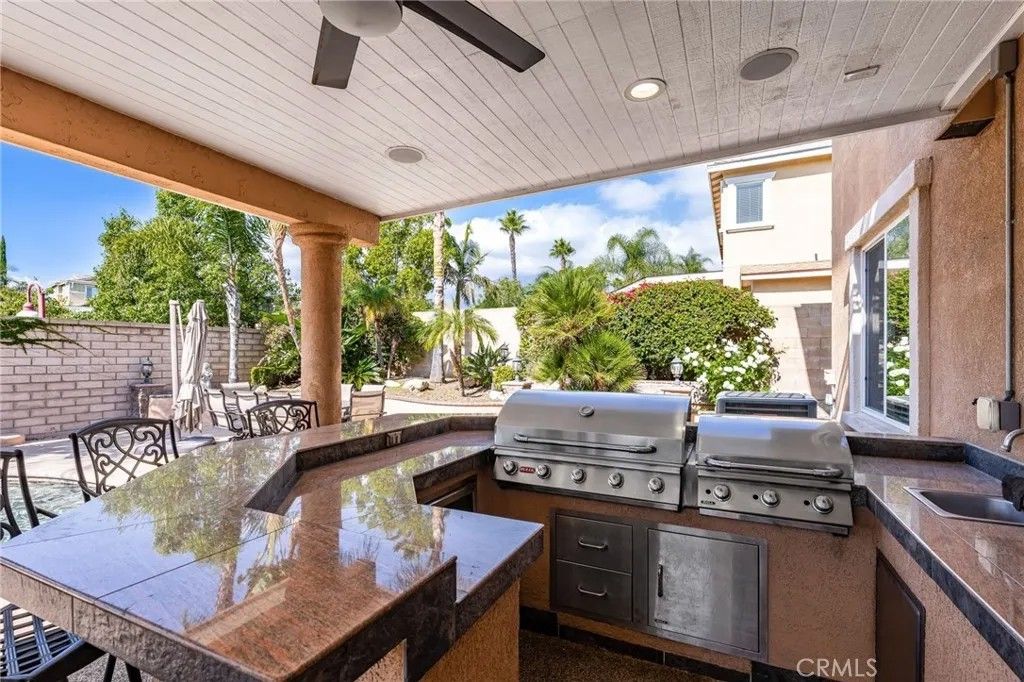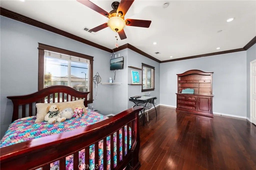 This is the one! Welcome to this stunning home featuring a beautiful open floor plan and exceptional curb appeal complete with a custom water fountain welcoming you at the front entry. As you step inside, youll be greeted by an elegant formal living room and dining room with porcelain tile flooring flowing throughout the downstairs. The spacious family room offers a built-in media center, cozy fireplace, and pool views through a custom 9-foot slider accented with designer window coverings. The gourmet remodeled kitchen is a chefs dreamfeaturing a breakfast bar island with pendant lighting, quartz countertops, built-in microwave, and ample cabinetry for storage. This versatile layout includes a main-level bedroom and full bathroom, ideal for guests or multi-generational living, as well as a large home office with built-in cabinetryperfect for remote work. Upstairs, retreat to the luxurious master suite with private access to an oversized deck offering breathtaking mountain and city lights views. The spa-like master bath showcases dual custom stone vanities with raised basins, a separate soaking tub, and a tiled walk-in shower with glass enclosure. The custom walk-in closet has been professionally designed for maximum organization. Additional highlights include crown molding, recessed lighting, custom window coverings, wood flooring upstairs, and a custom carpet runner along the staircase and hallway. The spacious game room features ceiling fans and plush carpet, while the secondary bedrooms are generously sizedone even rivaling a master suite in size. Step outside to your private resort-style backyard! Enjoy the custom saltwater pebble-finish pool with Baja ledge, rock waterfall, and dazzling lava rock fire featurean entertainers dream. The deck and covered patio include a built-in BBQ, lighting, ceiling fan, and outdoor surround sound system. The exterior is equally impressive with stone planters, stamped concrete driveway and lush landscaping. No HOA and conveniently located above the 210 freeway! Dont miss the chance to make this incredible home yours!