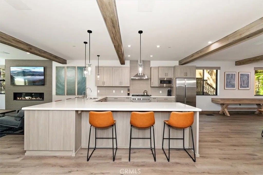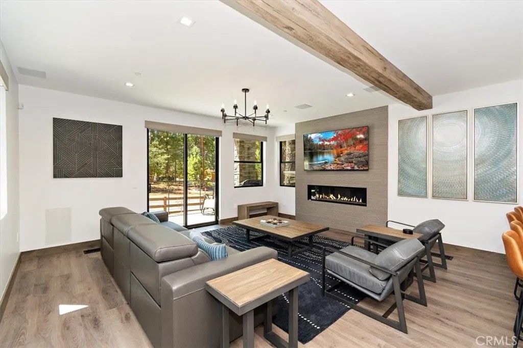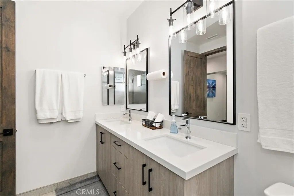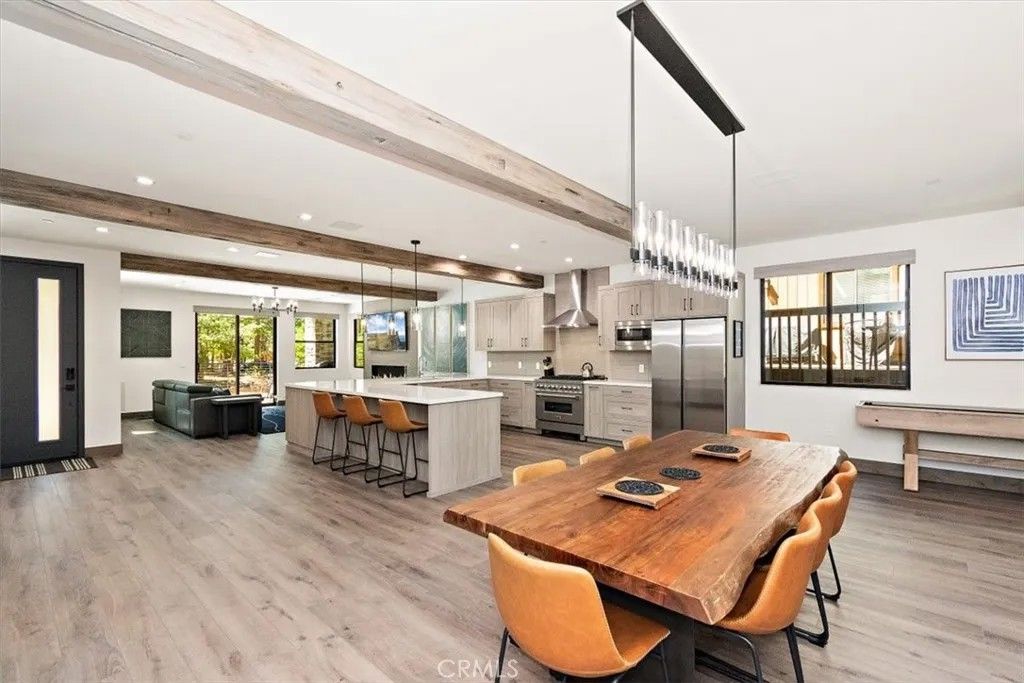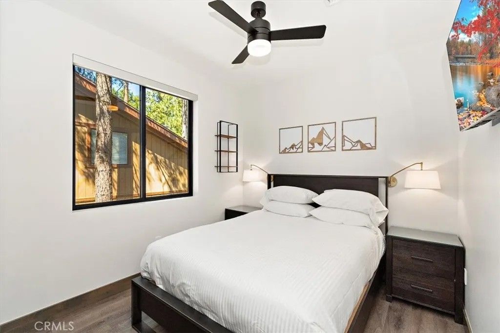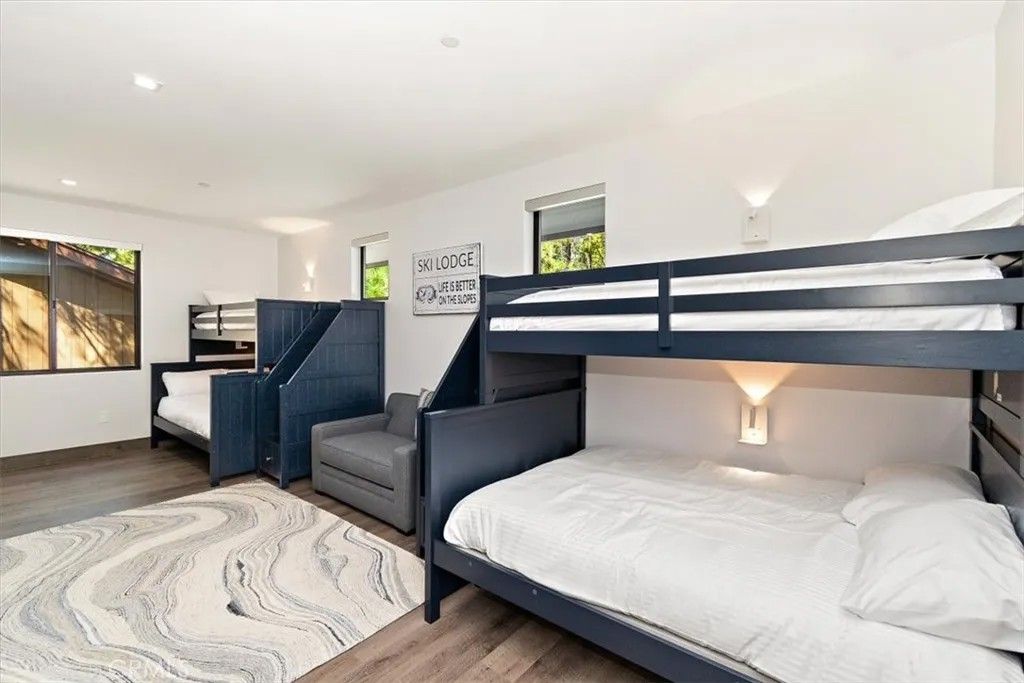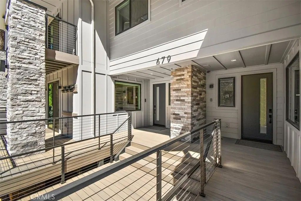 LOCATION, LOCATION, LOCATION! This stunning, modern, brand new single family residence laid out in versatile duplex fashion is only a 5 MINUTE WALK from Snow Summit Mountain Resort! Able to be split into multi-units, use it for income-producing vacation rentals, live in one and rent the other, or use them both for yourself and family; the possibilities are endless! The open floor plan blends game room, dining, and living room and has something for everyone - shuffleboard, electronic gaming table, cozy fireplace and oversized large screen TV, and a gourmet kitchen complete with custom cabinets, sleek quartz countertops, high-end stainless steel appliances, and reverse osmosis water filtration. In addition, this custom designed home features separate, dedicated central heating and air conditioning systems for each unit, ensuring year-round comfort. Both units feature dual primary suites, each with its own en-suite bathroom, ensuring ample space and privacy. As well, both sides are equipped with touchscreen smart units and all rooms have motorized shades and one touch light control. Each unit has an oversized 2-car attached garage with epoxy-coated floor, and ample, lockable storage, commercial-grade tankless water heaters and universal EV charging stations installed. Experience the perfect blend of modern amenities and mountain charm in this exceptional duplex, masterfully designed and no expense spared to cater to your every need and to surround you in comfort and luxury.