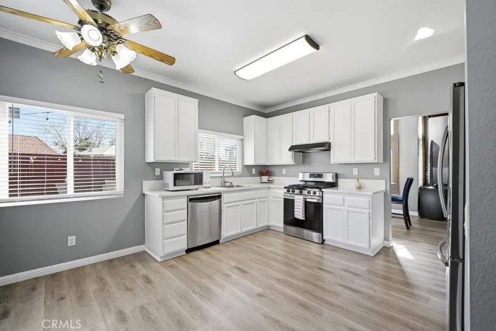 Welcome to 45664 Balmoral Court, Lancaster, CA a thoughtfully re-imagined residence located on a quiet cul-de-sac, where refined upgrades meet everyday livability. This beautifully updated home showcases engineered flooring throughout the entire first level, paired with new plush carpeting upstairs, creating a seamless blend of sophistication and comfort. The fully remodeled downstairs kitchen serves as the heart of the home, offering timeless finishes, clean lines, and functionality designed for both entertaining and daily living. Extensive improvements deliver true peace of mind, including new windows, new mechanical systems, a new garage door, and all-new main line plumbing upgrades rarely found and highly valued by todays discerning buyers. Adding to its appeal, the property features fully paid solar, providing long-term energy efficiency and meaningful savings. The outdoor space has been meticulously curated with new pavers, a partially new perimeter fence, and a detached storage shed, creating a private and versatile backyard ideal for entertaining, relaxing, or future customization.