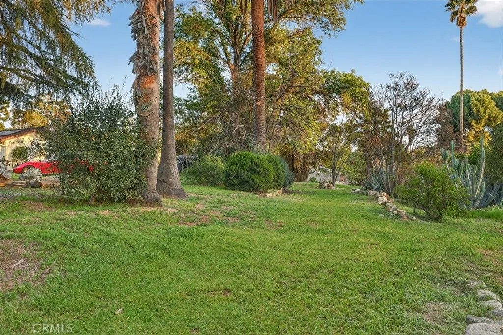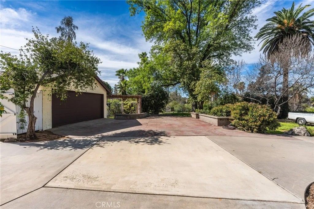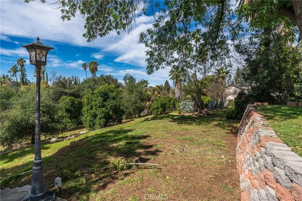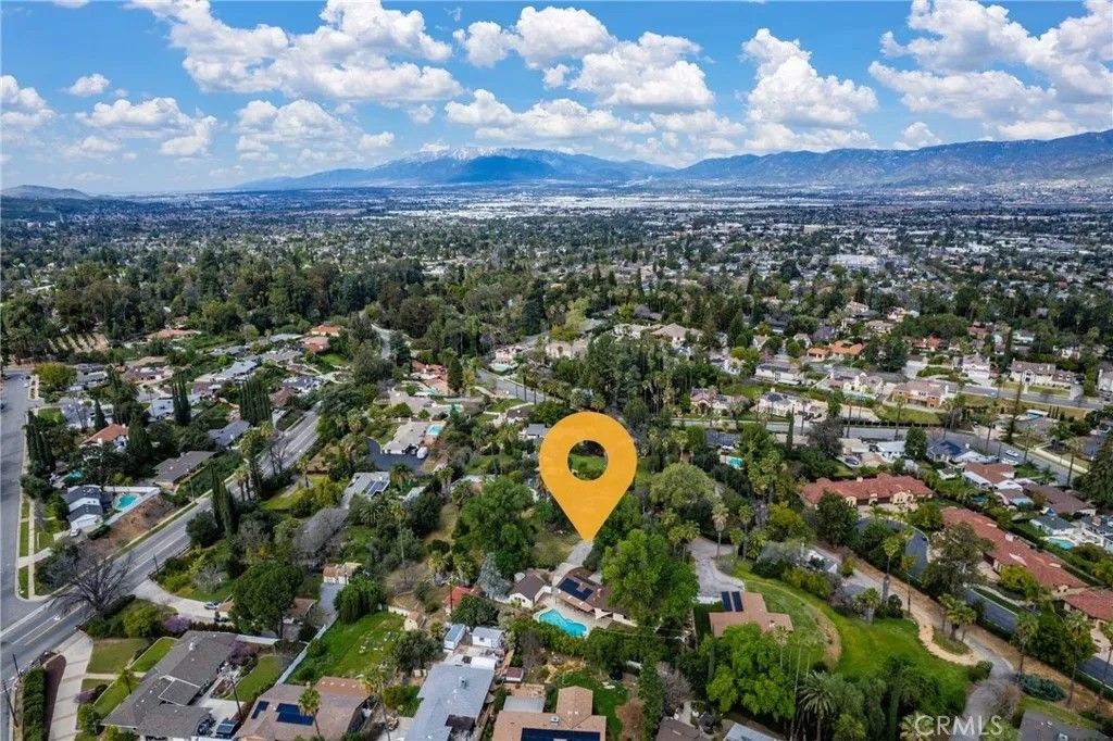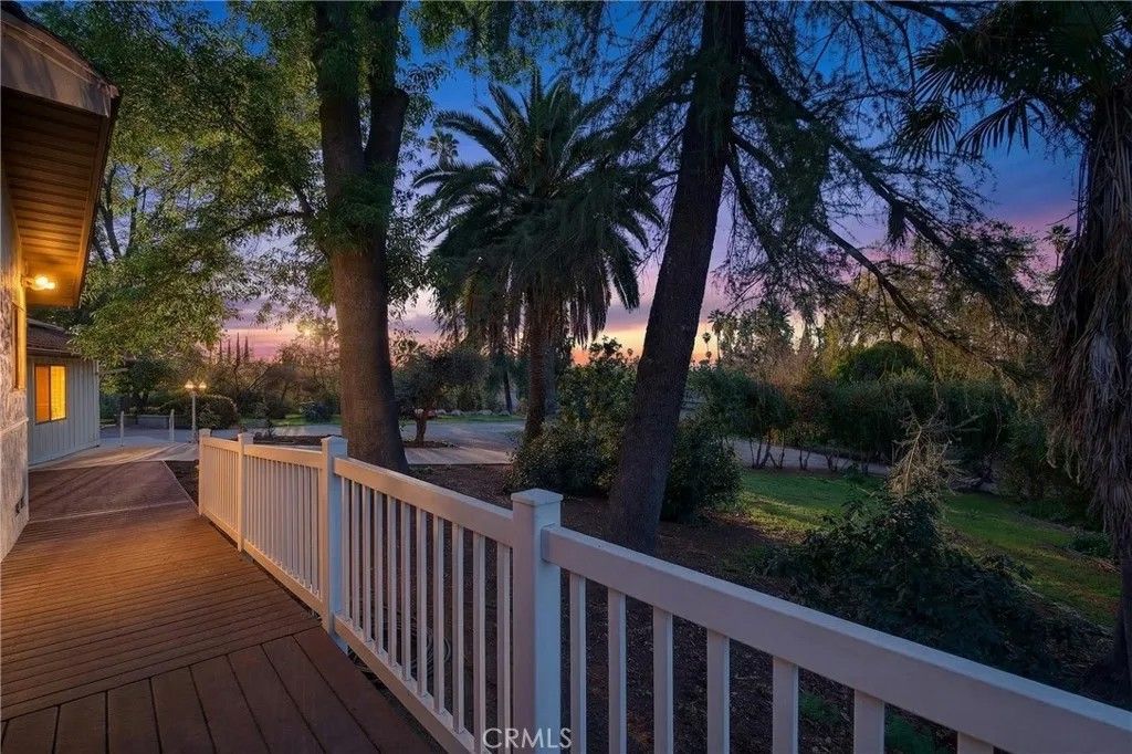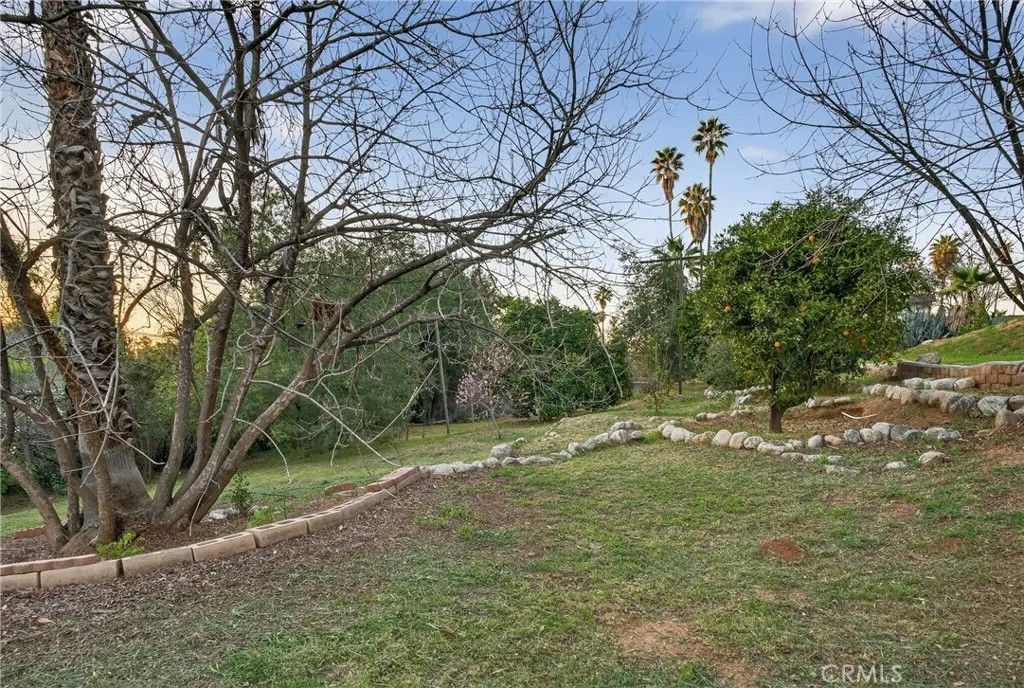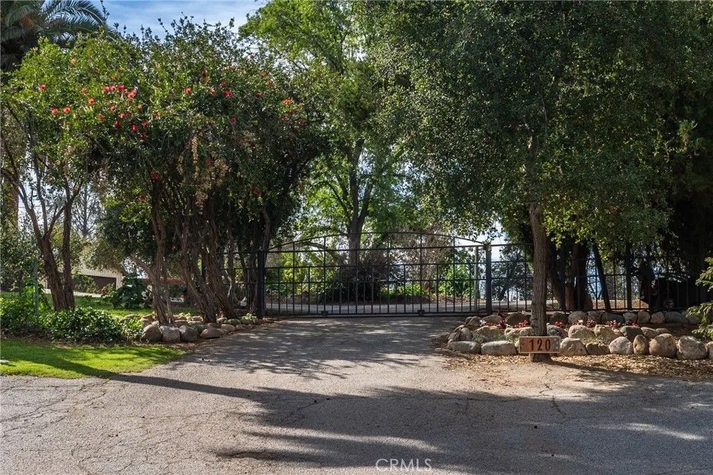 A single-story ranch-style estate nestled on 1.4 acres of sprawling gardenscapeyour own private park in South Redlands. Enjoy stunning sunset and mountain views with a direct sightline to the Redlands R. A private road leads to a gated circular driveway that, along with two garages and an RV space, significantly expands parking. The house has been newly painted! Inside, find warm wood tones and spacious living areas that flow seamlessly. The kitchen is equipped with ample cabinet space and high-end Viking stainless steel appliances, including a professional-grade six-burner stove and a refrigerator. Your primary bedroom features an ensuite bath and patio access via a sliding door. Includes a recently installed high-efficiency HVAC system and solar panels for significant energy savings! Whats more, the home is wired for a generator (generator included at buyers request), which can power the fridge, lights, and outlets in case of an outage. In the peace and solitude of your private sanctuary, discover an organic orchard of fruit trees, including six grapefruit trees, navel & valencia oranges, blood orange, meyer lemon, key lime, kumquat, Santa Ana plum, nectoplum, Double Delight nectarine, Red Baron peach, pomegranate, pineapple guava, and quince. Your personal garden also boasts culinary herbs and numerous planting beds and terraces. The backyard offers even more places to relax and unwind throughout the season, whether you want to cozy up around the fire pit or under the misting system, find zen-like tranquility by the koi pond, or cannonball into a large in-ground pool. Several bird species frequent the grounds. Zoned for horses. Within walking distance of beautiful Prospect Park. Part of the highly-rated Redlands Unified School District.