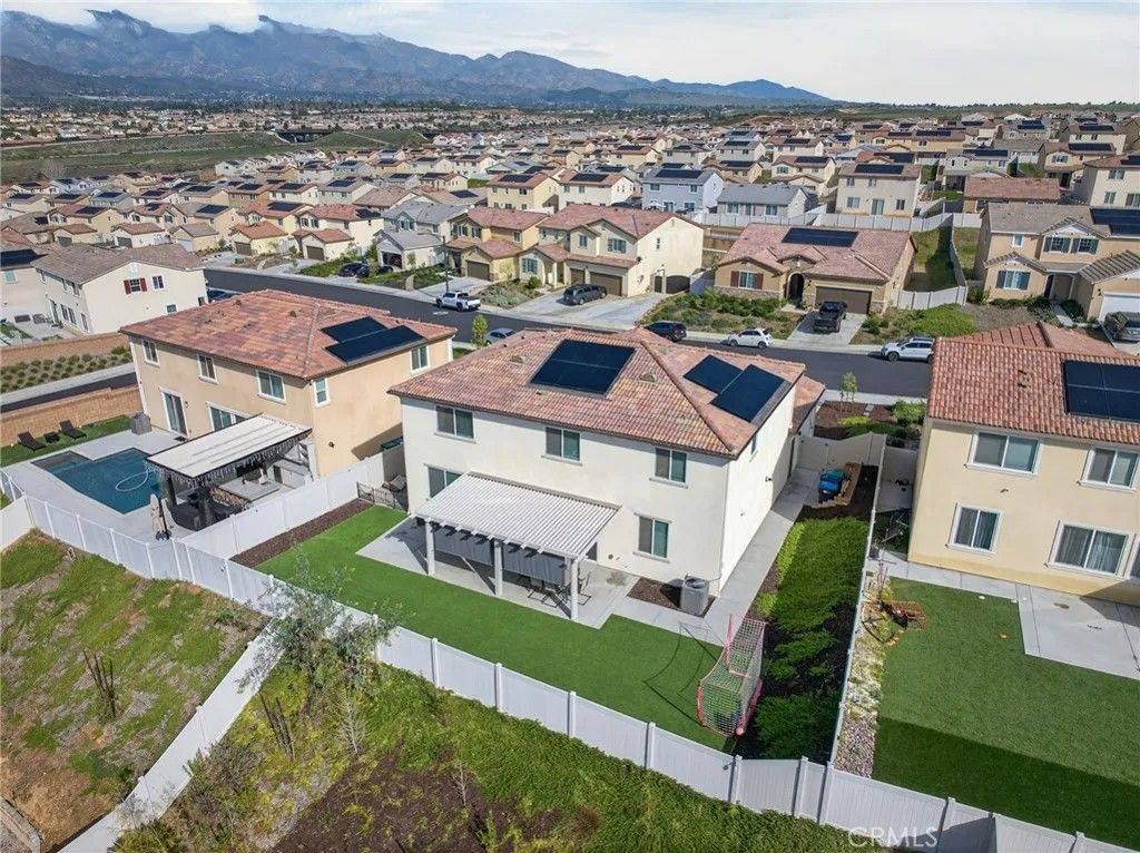 Stunning View Home with Owned Solar. This large home is located on a cul de sac and has been meticulously maintained. Upon entry the upgraded vinyl plank flooring that encompasses the first level will set the stage of the details this home offers. The large kitchen features an abundance of white cabinetry, quartz countertops with white subway tile backsplash, upgraded stainless steel appliances and a large center island. The dining area is open to the family room and adjacent to the kitchen for open concept living. This large space is perfect for large households and entertaining. The family room looks out to the rear patio and with all the windows to provide an abundance of natural light and views. The first level offers a large bedroom and full bathroom, perfect for multi-generational households. The laundry room is located just off the kitchen and provides additional storage. Upstairs the large loft is the perfect additional family room, game room or that "man cave" you have been dreaming of, the windows look out towards the view of the hills. The 2 additional bedrooms upstairs are located on one side of the loft and the primary on the other providing the privacy that is desired. The additional bedrooms are large and have great sized closets. The 3rd full bathroom is conveniently located adjacent to the loft and bedrooms. The primary suite is the perfect retreat, and the windows take advantage of the views. The primary bathroom has separate dual vanities, a soaking tub, shower and a large walk-in closet. This home has many upgrades including owned solar that adds to the overall affordability, a water filtration system along with decorator touches that allows you just unpack and move in. The rear yard features a beautiful, covered patio area, lush landscaping, side yard that provides space for a dog run, garden or additional play space. The views from the rear are stunning and the privacy of this location is great. The tandem garage allows for extra storage, space for large vehicles or even long enough to store a boat. The gated community rivals most resorts with community pool, walking trails, sport courts, parks and so much more. Beaumont is one of the fastest growing communities and conveniently located for those commuting for work or school. You can be in Palm Springs or towards Rancho Cucamonga and Riverside quickly and there are local shopping and restaurants nearby with more being built currently.