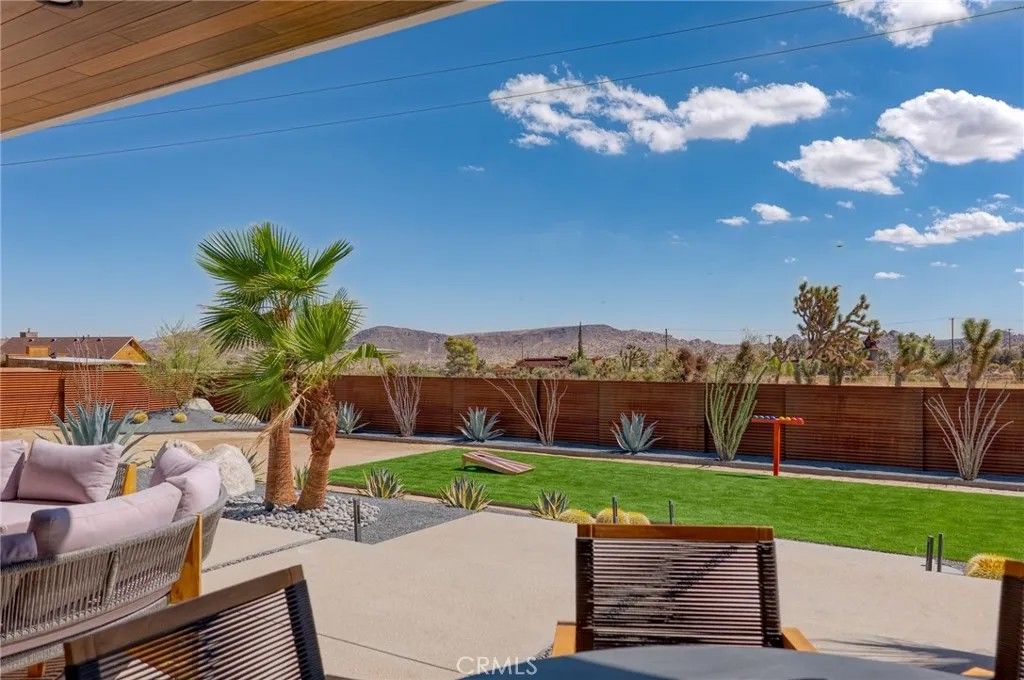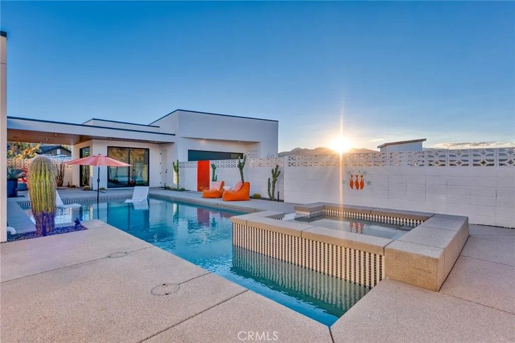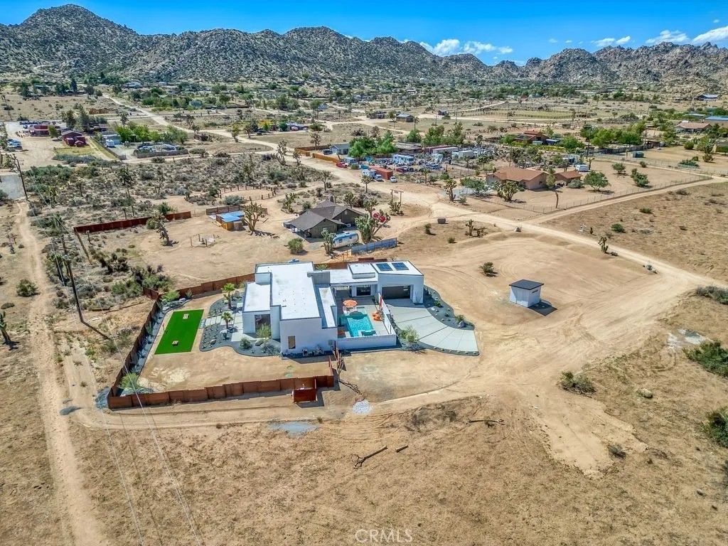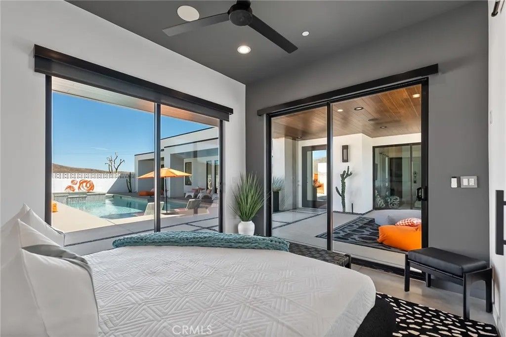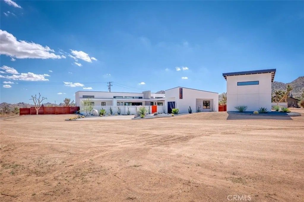 5165 Roy Rogers Road - Modern Desert Masterpiece. In the high desert, silence has texture, and light is its own architecture. At 5165 Roy Rogers Road, design and landscape move in harmony, a balance of modern form and natural stillness. Set on 1.26 acres in one of Pioneertowns most sought-after settings, this three-bedroom, three-bath residence redefines desert modern living. The bold white-and-black faade, framed by a breeze-block courtyard and signature orange gate, makes an unforgettable first impression, both grounded and sculptural. Inside, expansive glass walls and polished concrete floors invite the desert light to play across every surface. The open-concept great room and designer kitchen merge seamlessly, featuring bespoke cabinetry, waterfall-edge stone counters, and refined mid-century influences that bring warmth to the clean architectural lines. Each bedroom suite offers its own sense of calm and privacy, designed for rest, reflection, and effortless connection to the landscape beyond. The home is offered fully furnished and turn-key, blending curated design with comfort and livability. Outdoors, the private courtyard unfolds around a sleek in-ground pool and spa, framed by native landscaping, sunlit terraces, and a covered outdoor kitchen crafted for year-round enjoyment beneath endless desert skies. Positioned in the heart of Pioneertown, just moments from its iconic gathering spots, Pappy & Harriets and the Red Dog Saloon, this residence captures the spirit of modern design framed by desert history. 5165 Roy Rogers Road, where Palm Springs polish meets High Desert soul. A modern architectural statement, ready to be lived in, shared, and remembered.