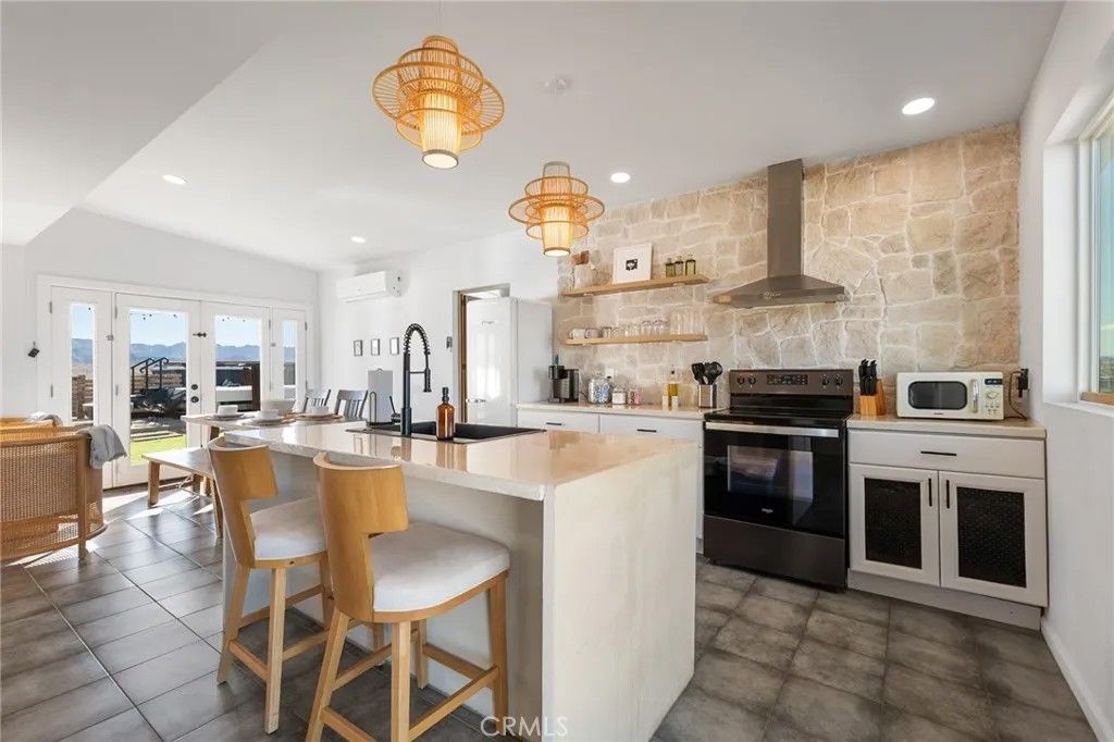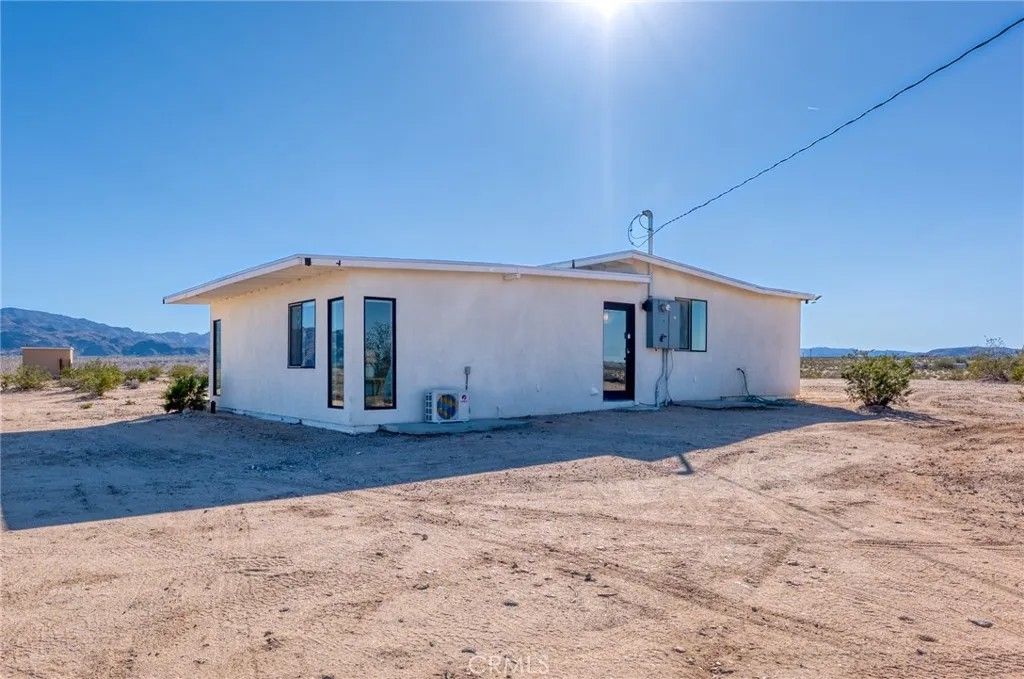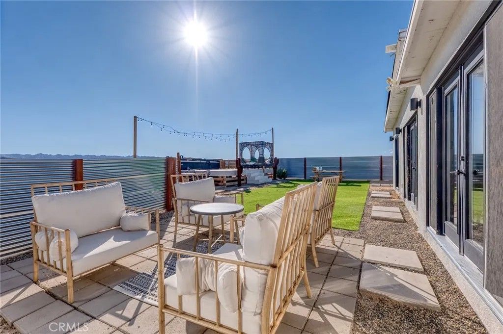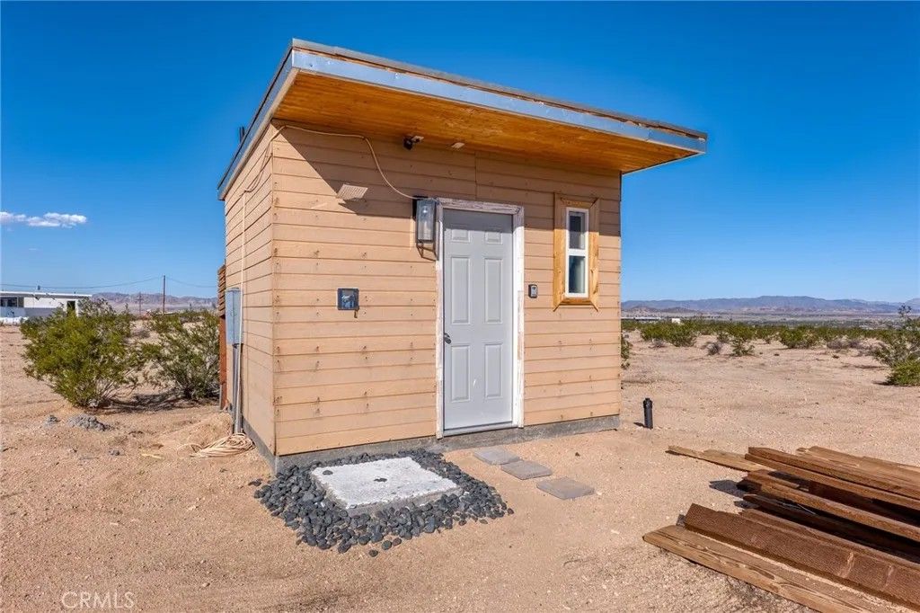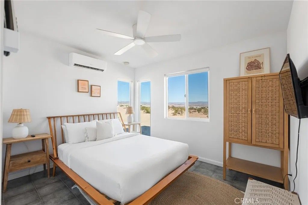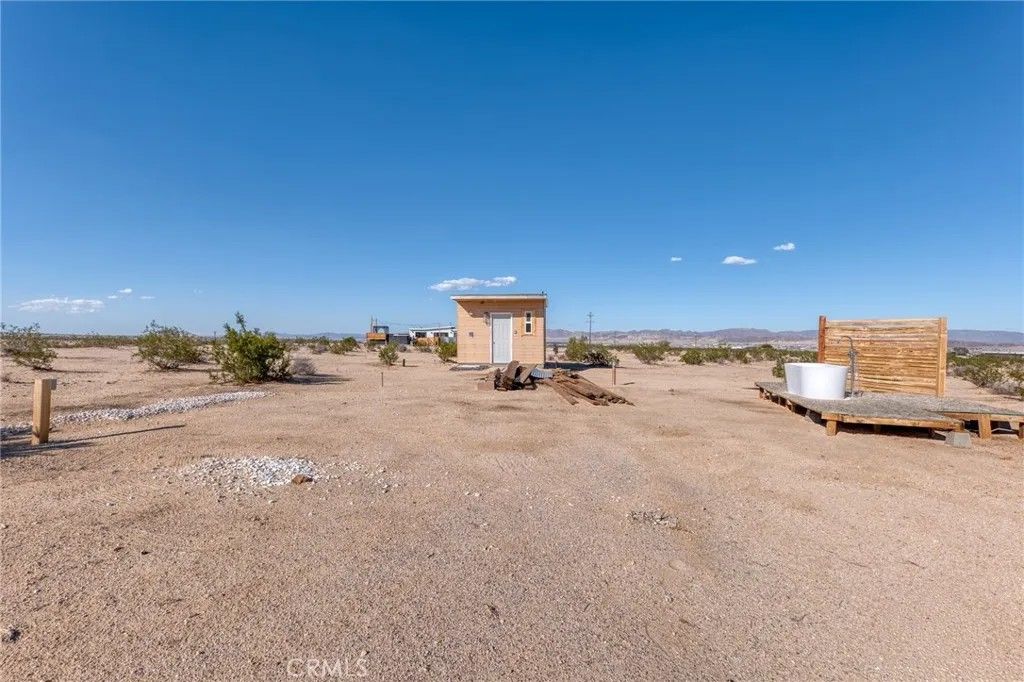 Experience the ultimate in refined desert living with this modern sanctuary, perfectly positioned on five private acres and surrounded by ninety acres of untouched government land that guarantees forever-protected views and complete tranquility. Thoughtfully remodeled, this two-bedroom, two-bath retreat embodies effortless sophistication, blending timeless design with the raw beauty of the high desert. The open-concept interior is bathed in natural light, highlighting designer furnishings, Leanne Ford pieces, and curated finishes that create a warm yet contemporary aesthetic. Custom Zia Tile, premium fixtures, and bespoke details bring elegance and craftsmanship to every space. The primary suite features a king bed and a spa-worthy bathroom with a dual-head shower, while the guest suite offers equal comfort and style, each room equipped with modern amenities for year-round enjoyment. Outside, the home transforms into a private resort experience. A heated swim spa, spa, fire pit, and expansive sun deck invite relaxation beneath endless desert skies, while the fully fenced yard provides both intimacy and immersion in the surrounding landscape. Perfect for entertaining or quiet reflection, every inch of this property is designed to embrace the serenity and grandeur of the Mojave. Ideally located just minutes from Joshua Tree National Park, the Marine Corps base, and the vibrant arts and culinary scene of 29 Palms and Joshua Tree Village, this residence offers the rare combination of seclusion and accessibility. Whether envisioned as a personal retreat or an exclusive investment property, this exceptional home captures the essence of luxury desert living where design, comfort, and nature exist in perfect harmony.