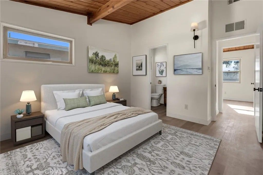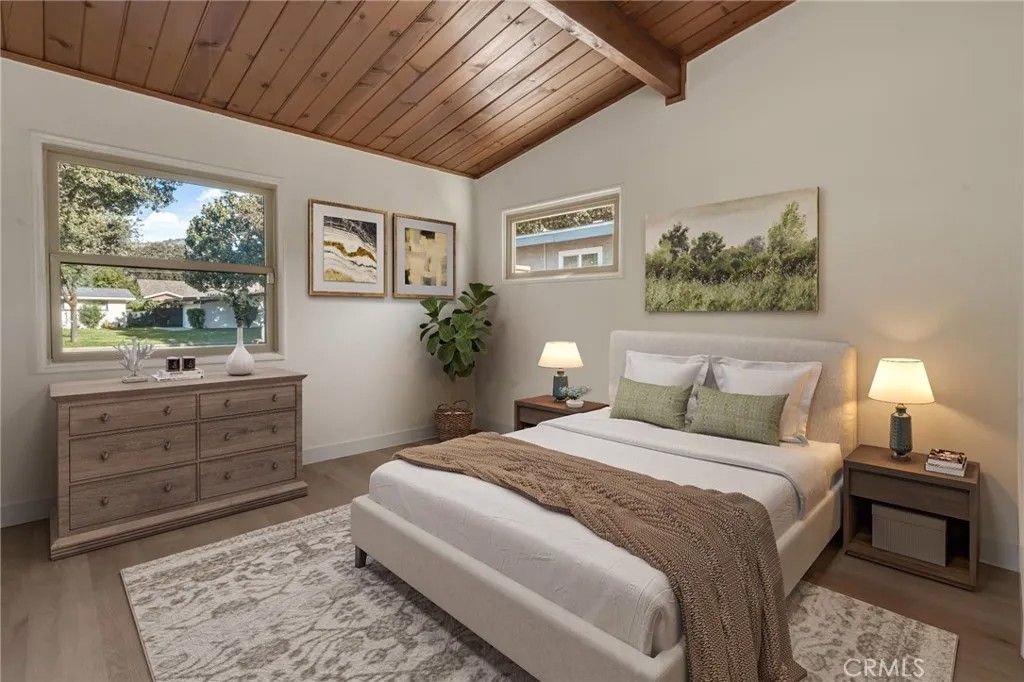 Welcome to the city of Azusa! Welcome to this beautifully refreshed 3-bedroom, 2-bath home that blends mid-century character with contemporary comfort. Set on an inviting lot with a lush front lawn, this light-filled retreat offers warm, natural finishes and an easy-flow layout perfect for everyday living. Inside, youre greeted by stunning vaulted wood-beam ceilings that create an airy and open feel. The spacious living room features large sliding doors that frame the private backyard and fill the space with sunlight. Just off the living area, the dining nook enjoys views of the yard and effortless access to the kitchen, making entertaining a breeze. The serene primary suite offers a peaceful escape with its own en-suite bath and calming natural light. Two additional bedrooms provide flexibility for family, guests, or a dedicated home office. Outside, the expansive backyard is a blank canvasready for weekend gatherings, a garden, or future enhancements. With its inviting curb appeal, modern neutral finishes, and architectural charm, this home truly checks all the boxes. Move-in ready and full of potential, this is the ideal place to settle in and make your own.