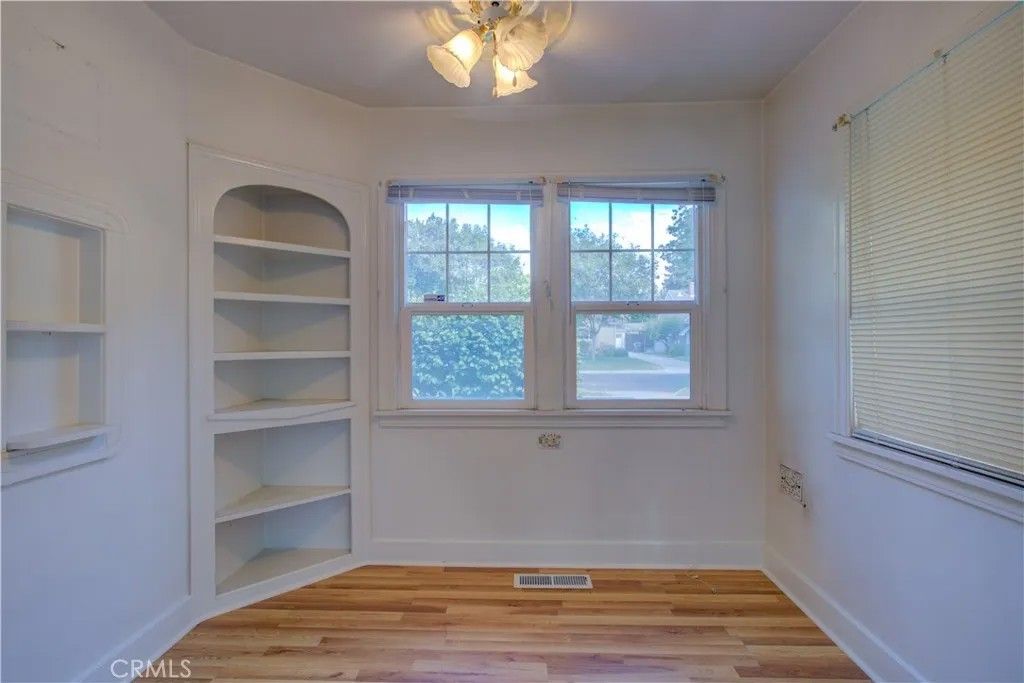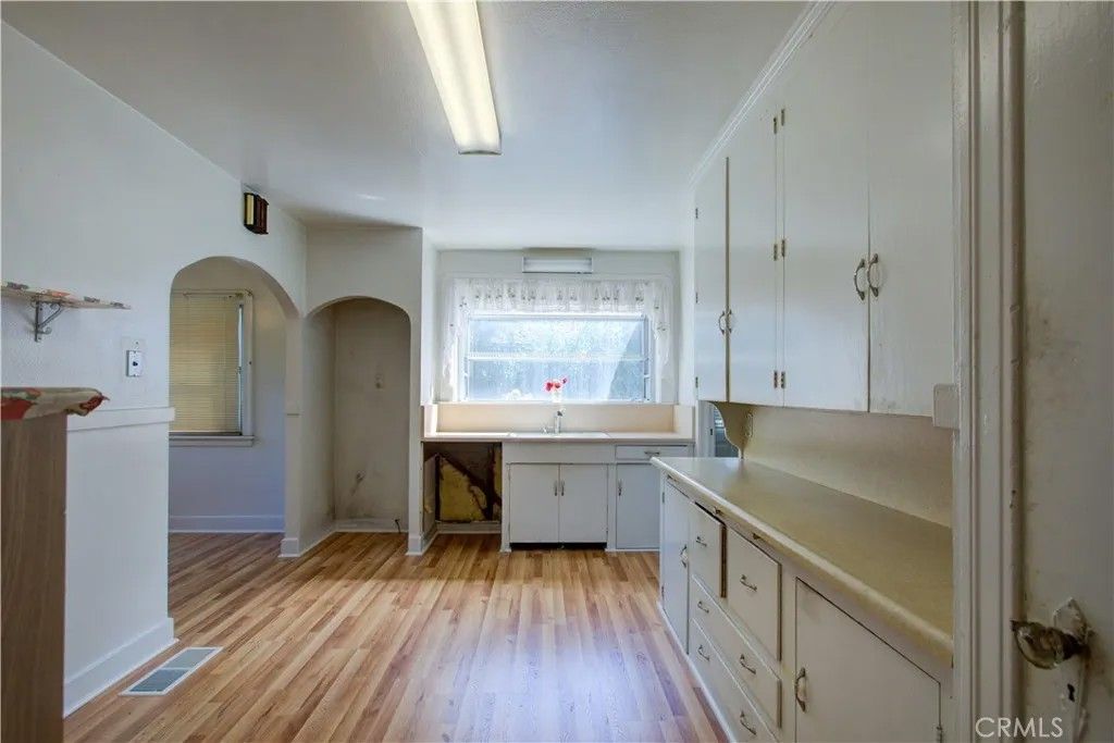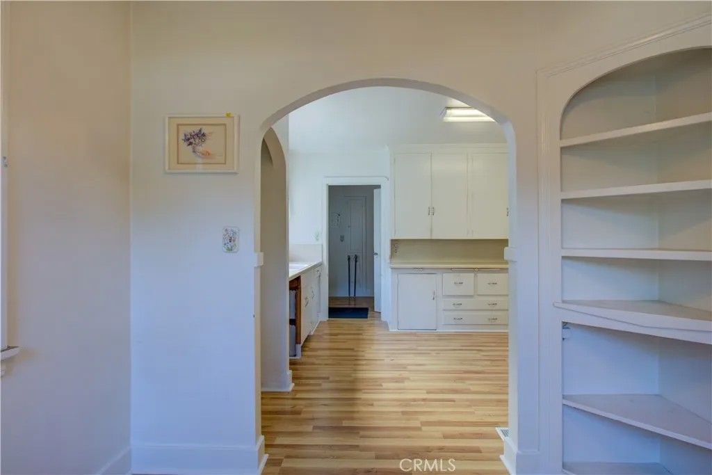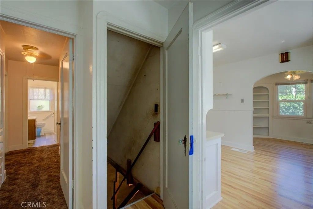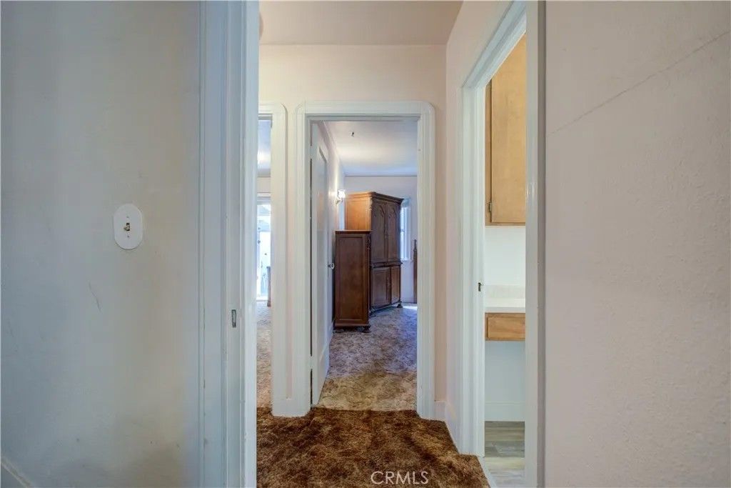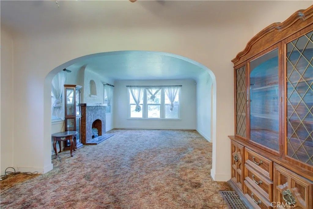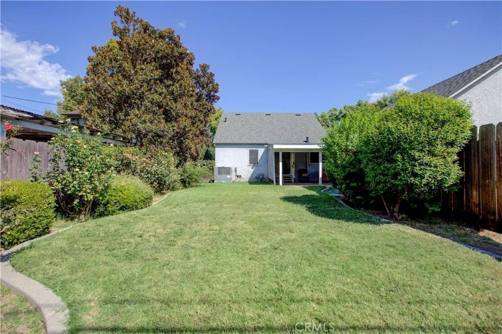 1214 E Marshall St in Turlock offers 5 bedrooms and 1 bathroom in a two-story layout with additional basement storage. The home features a family room with fireplace and raised hearth, a kitchen with pantry closet, and indoor laundry with built-in ironing board. Flooring includes both wood and carpet. A detached garage is accessible from the alley, and the backyard includes a covered patio for outdoor entertaining.