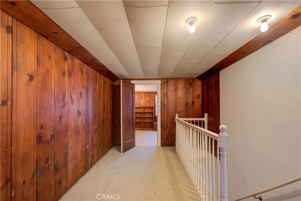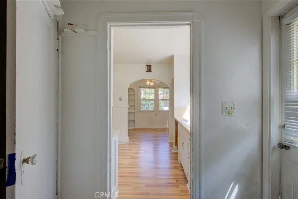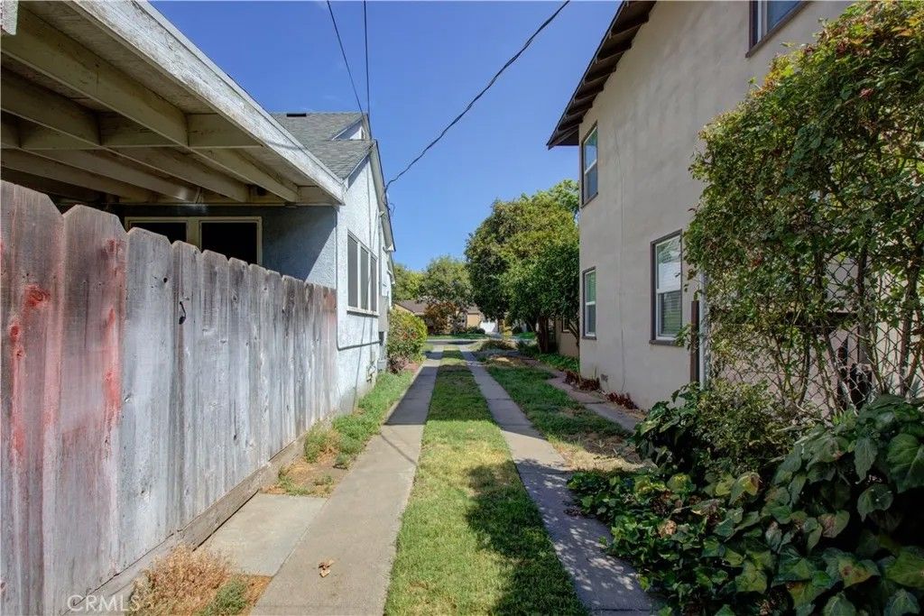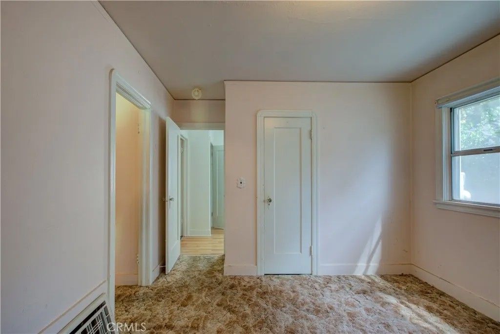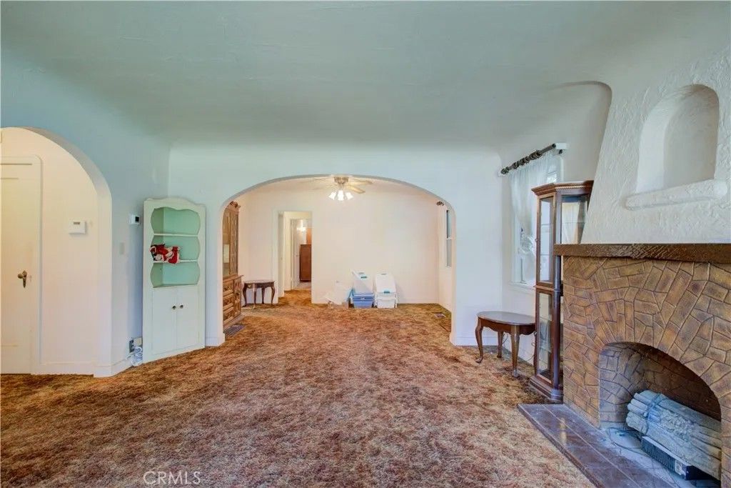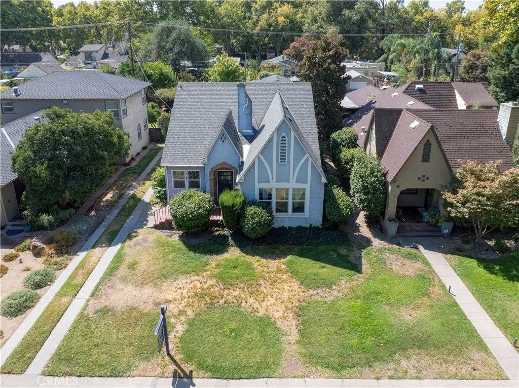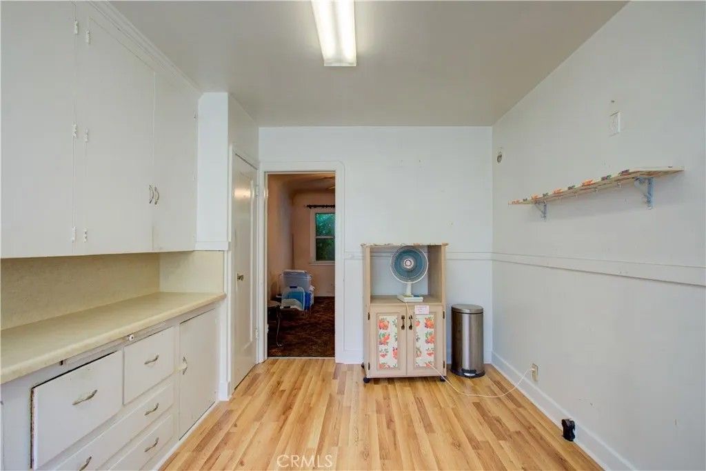 1214 E Marshall St in Turlock offers 5 bedrooms and 1 bathroom in a two-story layout with additional basement storage. The home features a family room with fireplace and raised hearth, a kitchen with pantry closet, and indoor laundry with built-in ironing board. Flooring includes both wood and carpet. A detached garage is accessible from the alley, and the backyard includes a covered patio for outdoor entertaining.