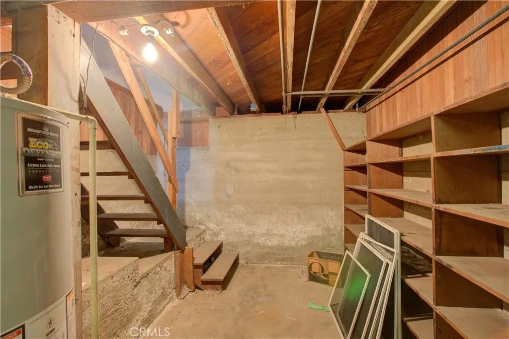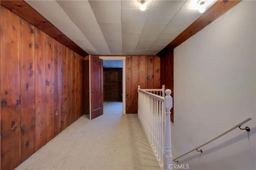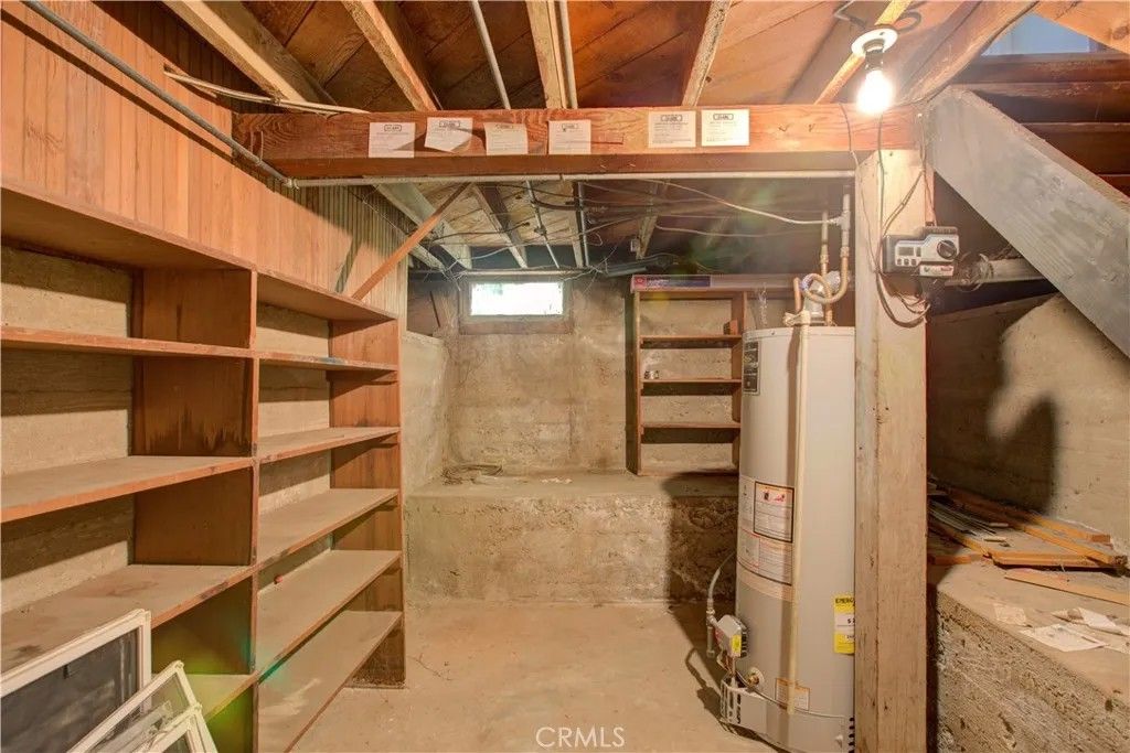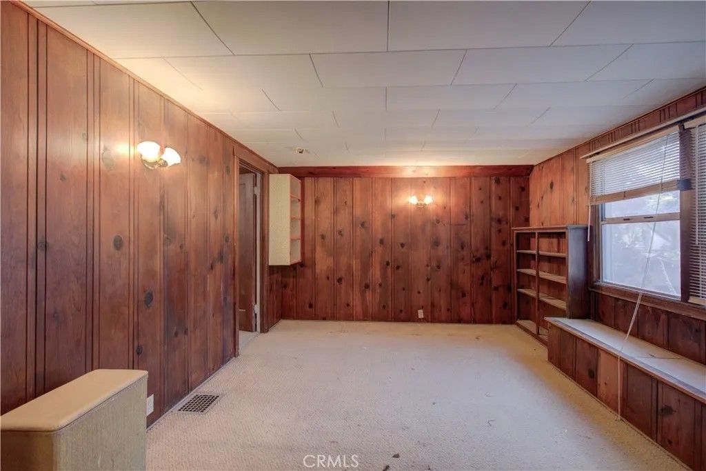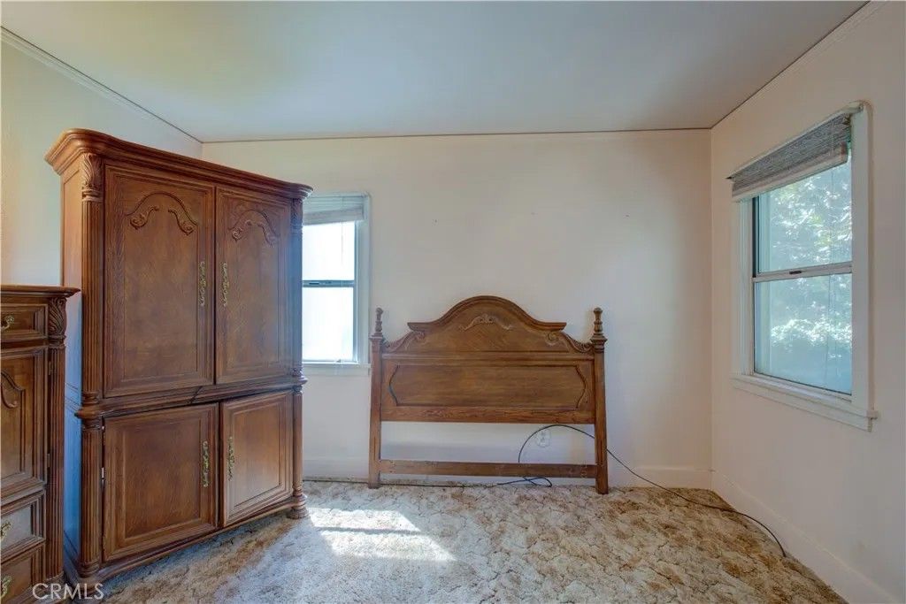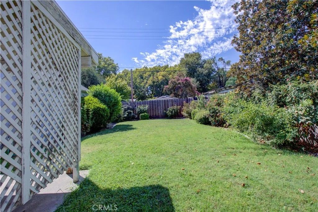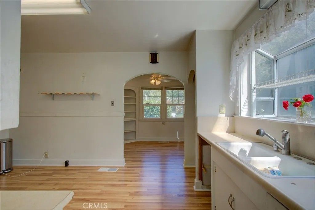 1214 E Marshall St in Turlock offers 5 bedrooms and 1 bathroom in a two-story layout with additional basement storage. The home features a family room with fireplace and raised hearth, a kitchen with pantry closet, and indoor laundry with built-in ironing board. Flooring includes both wood and carpet. A detached garage is accessible from the alley, and the backyard includes a covered patio for outdoor entertaining.