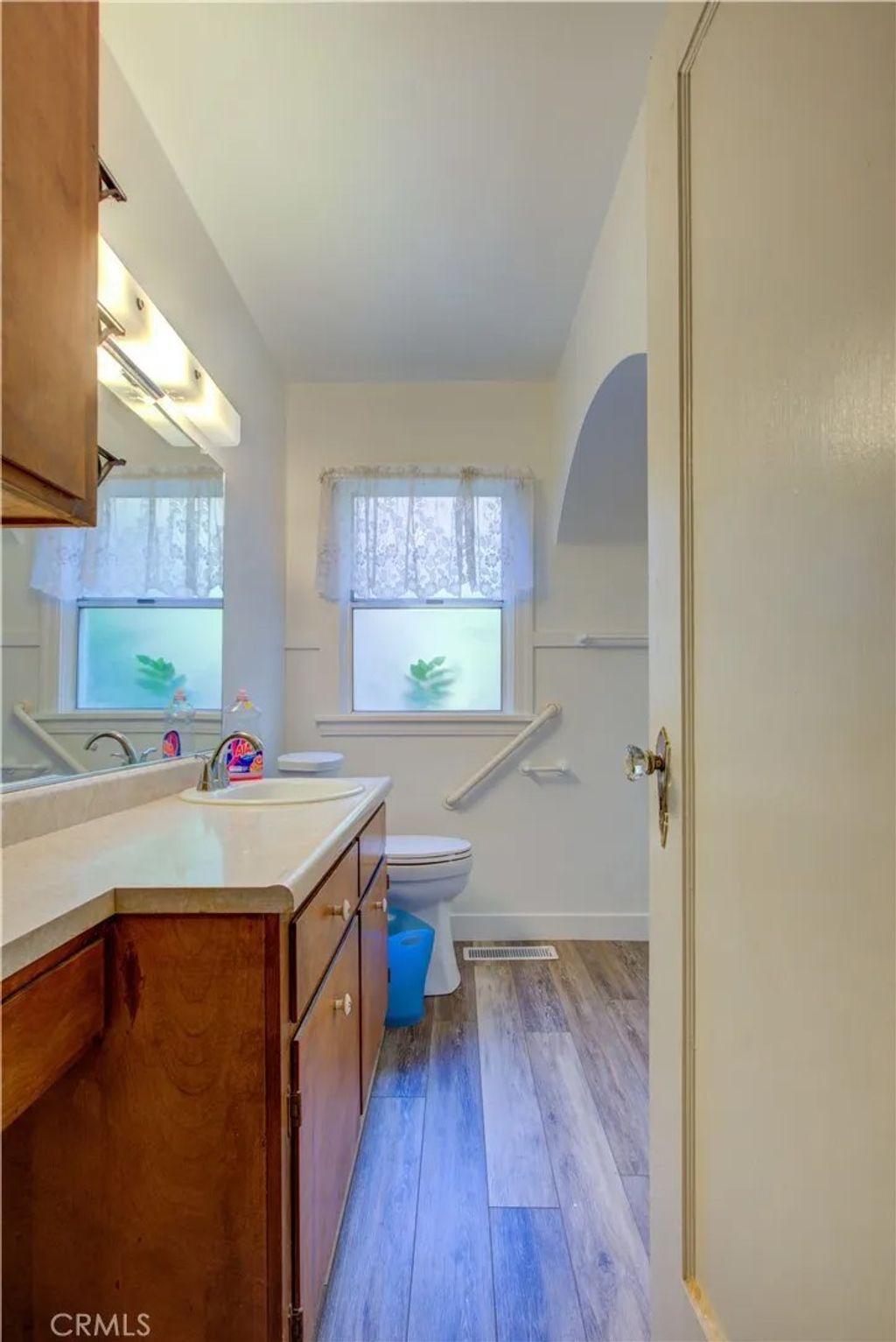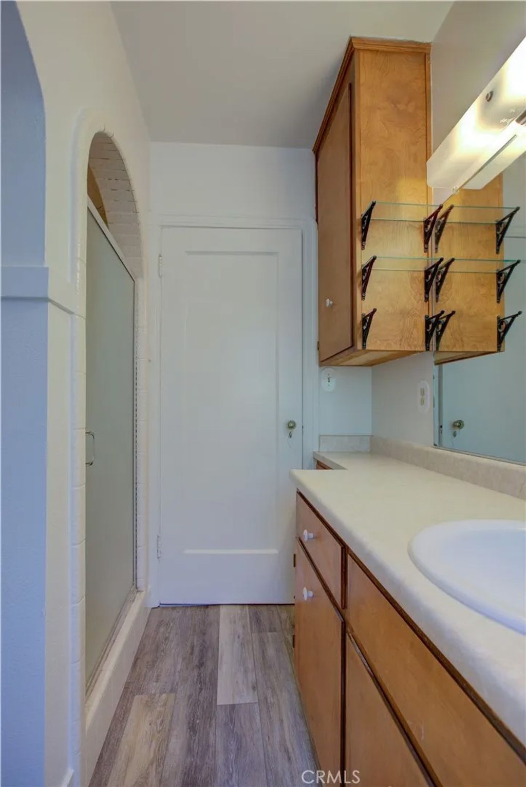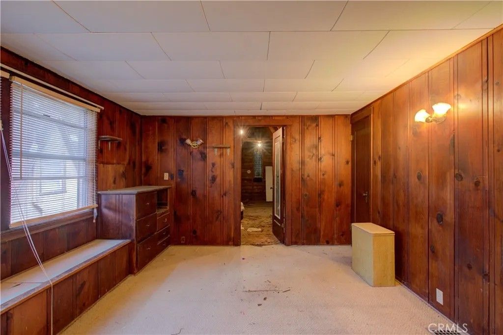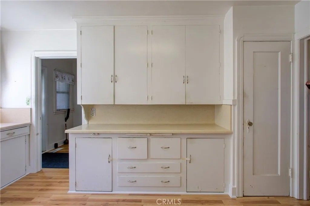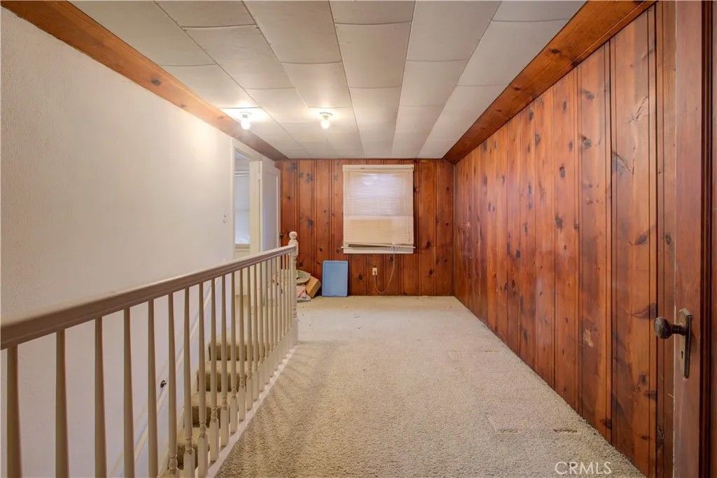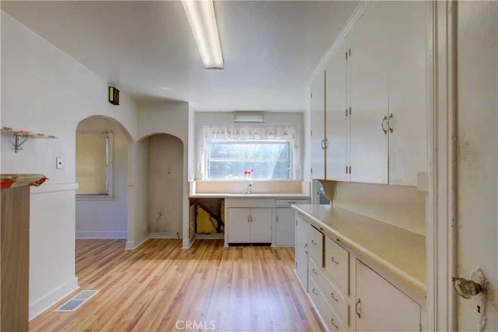 1214 E Marshall St in Turlock offers 5 bedrooms and 1 bathroom in a two-story layout with additional basement storage. The home features a family room with fireplace and raised hearth, a kitchen with pantry closet, and indoor laundry with built-in ironing board. Flooring includes both wood and carpet. A detached garage is accessible from the alley, and the backyard includes a covered patio for outdoor entertaining.