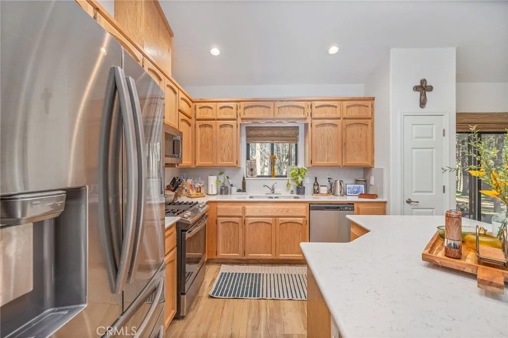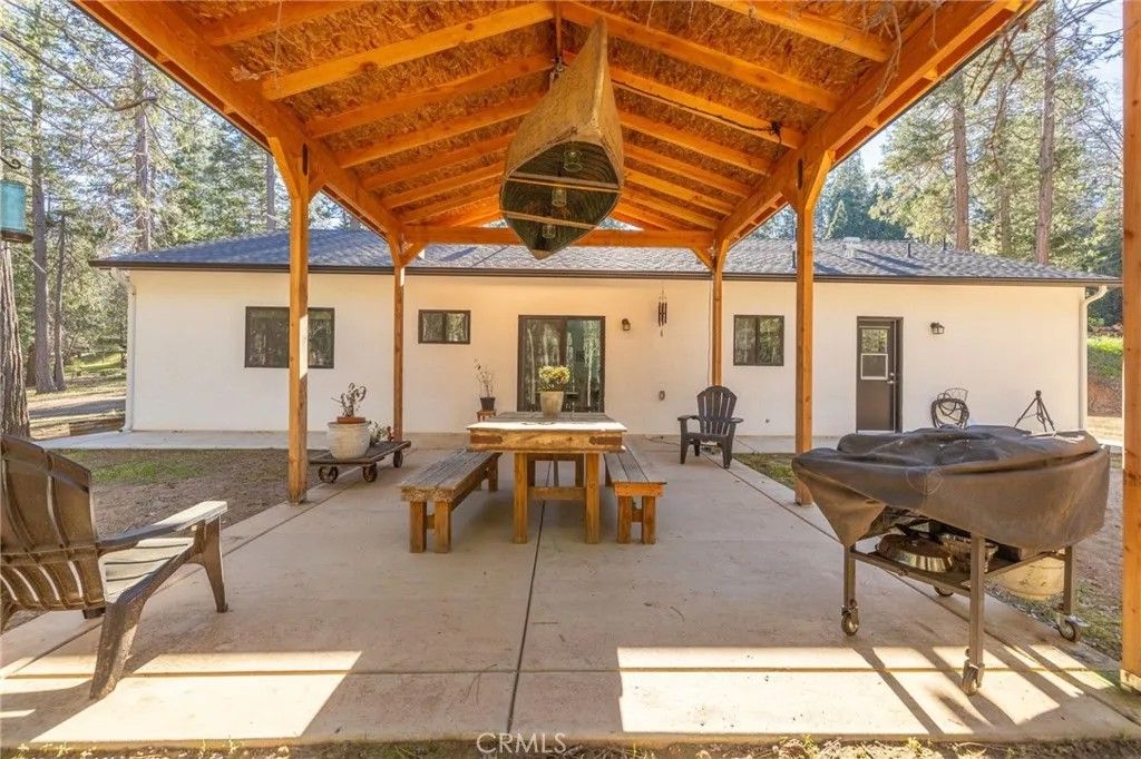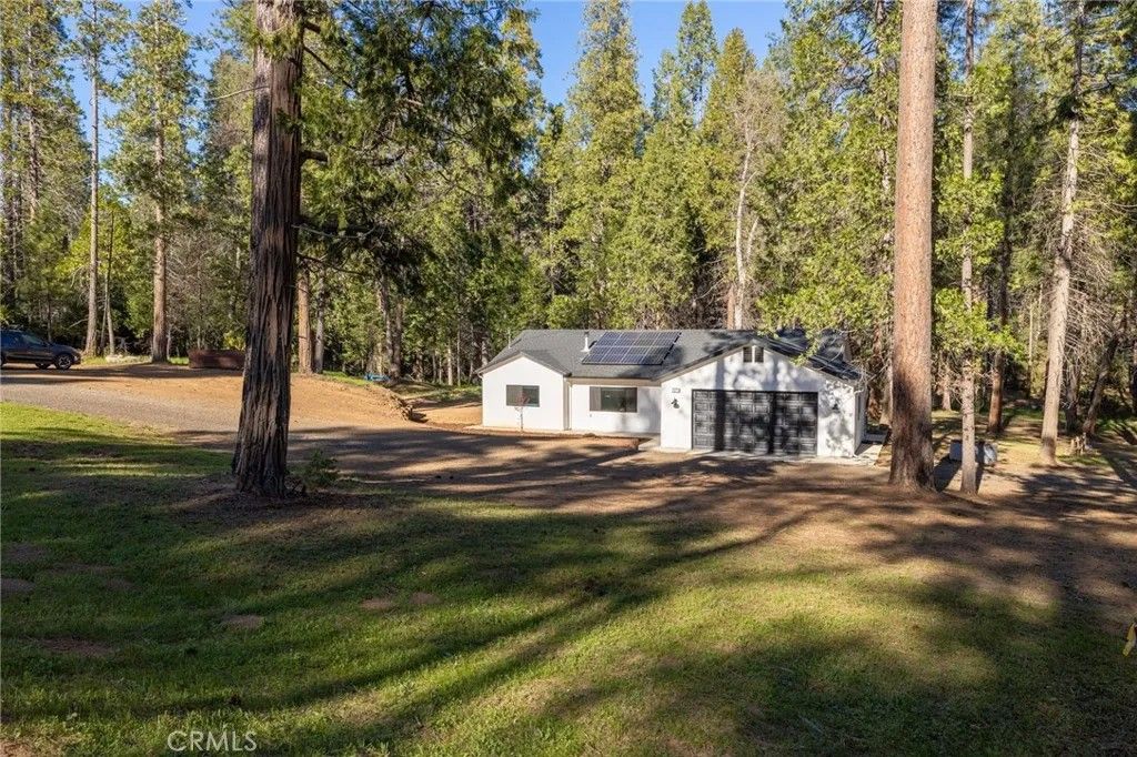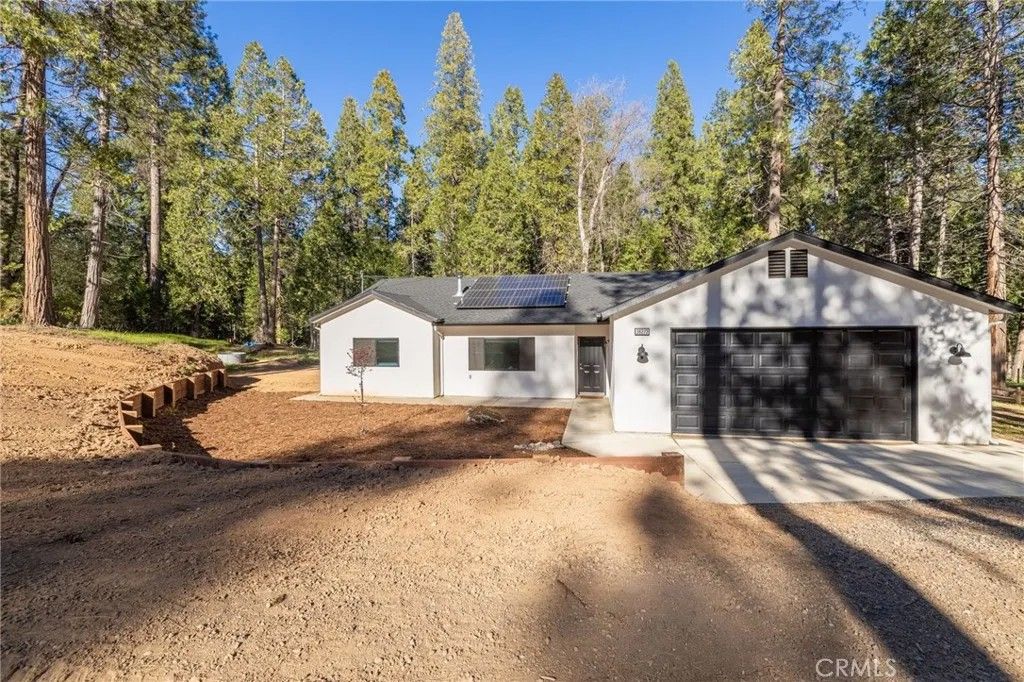 Welcome to this park-like setting featuring a beautifully upgraded Western-style home on 2.91 acres. Built in 2024, this single-story stucco home offers quality construction with closed eaves and interior fire sprinklers for added safety. The open floor plan provides comfortable living, while Finegold Creek runs behind and through a portion of the property, creating a peaceful natural backdrop. Located at approximately 3,560 ft elevation, youll enjoy cooler summers and the possibility of winter snow. Additional features include owned solar panels, an EV charger ready to hook up in the garage, private well and septic, and a 5,000-gallon water storage tank. A graded pad offers potential for additional use. This newer, well-maintained home and property make it easy to move in and start enjoying the beauty and tranquility of mountain living.