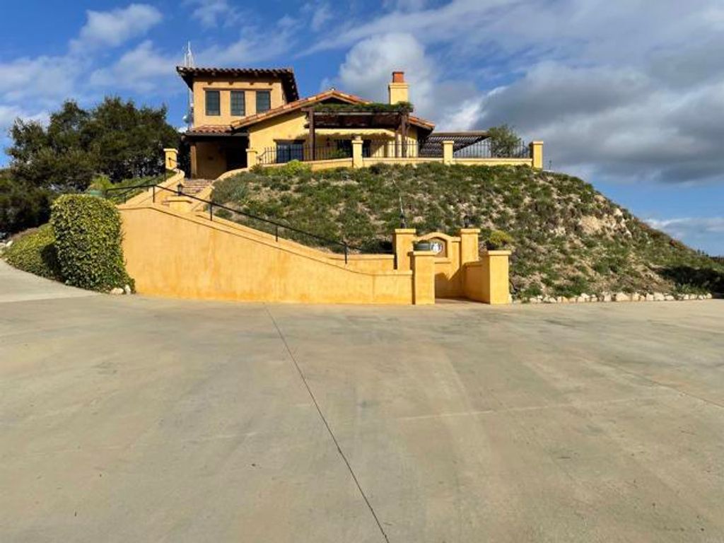 Stunning views from this eagle's perch with a Tuscan feel designed into an environmentally friendly constructed home. The home is built with insulated compound concrete forms, "Rastra" manufactured, that create 15" thick concrete highly insulated walls. Radiant heated floors make for cozy comfort as you enjoy the beautiful views from your living room while seated in front of the fireplace. A Tesla battery whole house electrical backup system coupled with solar panels maximize this home's efficiency and reliability.There is an approximately 120 avocado tree producing grove on the property. There are two additional pads on the property to construct a studio or additional living space.The backyard is fenced with wrought iron fencing. Enjoy the views and relax.
