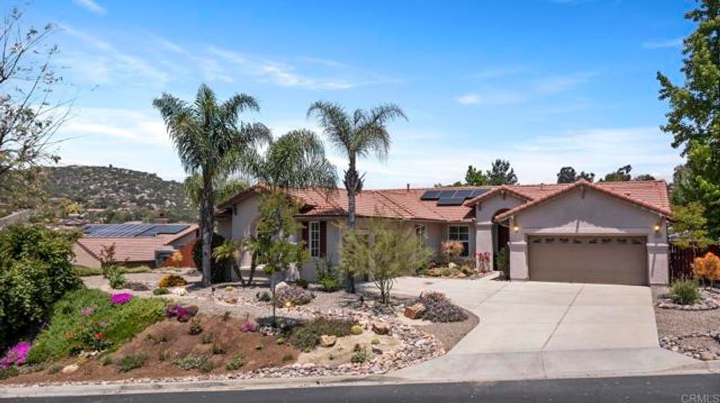 You won't want to miss this unique and beautiful home located in the highly desirable community of Rancho San Vicente, a Ryland Homes development. It sits on .51 of an acre with plenty of room for a pool, gorgeous front Xeriscape landscaping and a fenced,walled backyard designed for entertaining , relaxation , gardening and meditation. Framed garden beds with drip system, a family gathering place for nights around the fire, a covered patio, an outdoor kitchen and completing the ambiance, at the rear of the yard, is a pond along side a secluded wooden deck. A fully PAID FOR SOLAR, 17 panel system takes care of your needs with a true up month in May running approx $160 annually, subject to usage. New HVAC system and exterior painted in 2017. This 2778 Sqft home has a total of 5 bedroom and 3 full baths. a spacious and masterfully remodeled country kitchen with gas cooktop and pullout features in most cabinets, under counter lighting and separate Beverage/Wine refrigerator. The large center island boast a sold piece of designer quartz with breakfast bar , an abundance of storage and enhanced by pendant lighting. Adjacent to the kitchen and breakfast area is the large family room with a slider to the covered back patio and yard. Beyond the family room is the added 5th bedroom with attached full bath, and access to the backyard. As you enter the house you find the 4th Bedroom to the left, currently being used as an office. Stepping into the spacious living room/dining room you have a clear view of the back covered patio and the fabulous backyard. The primary bedroom is located o