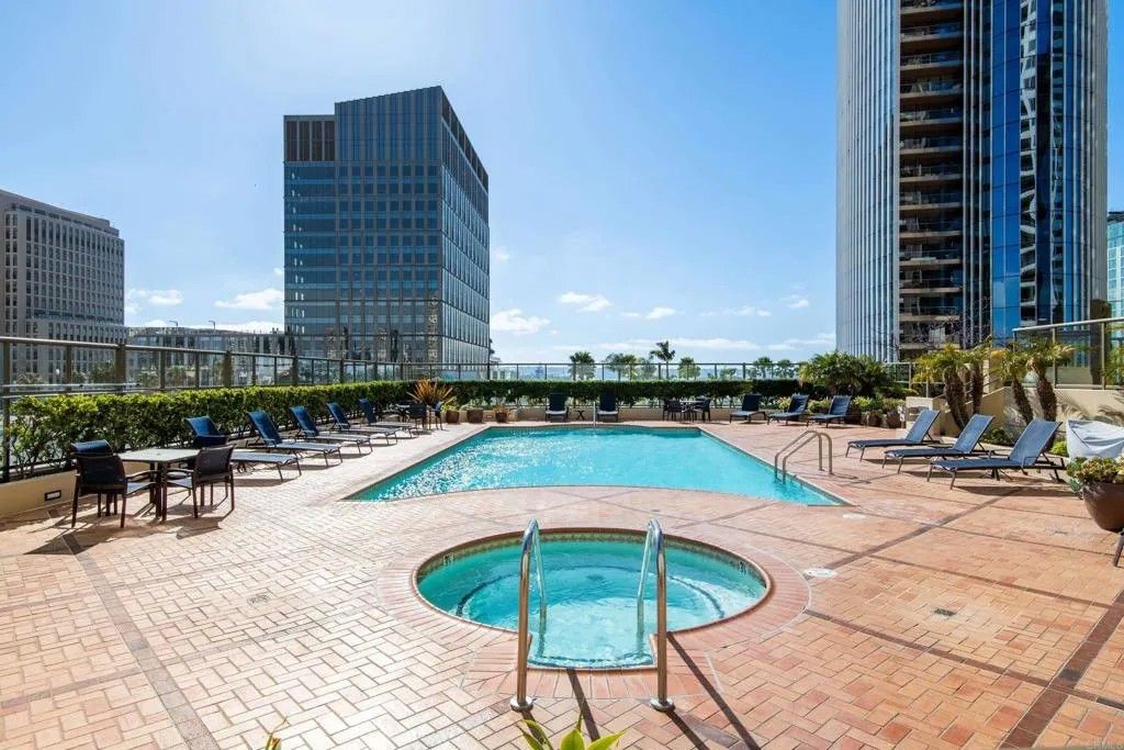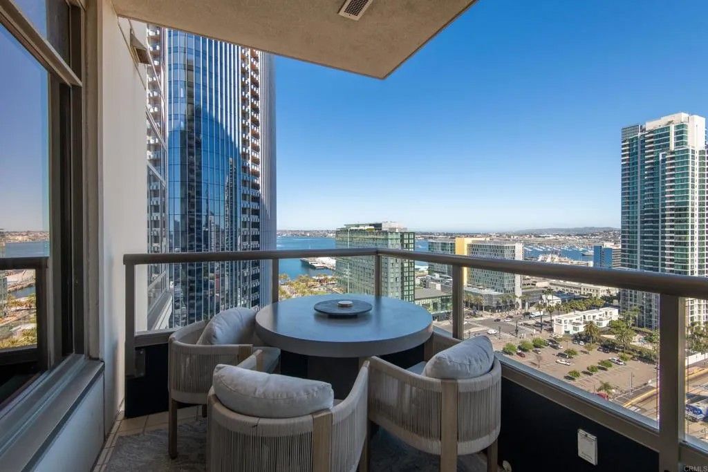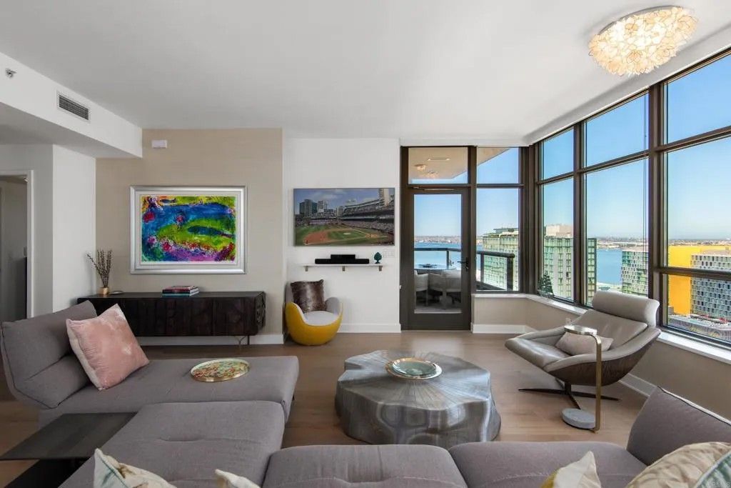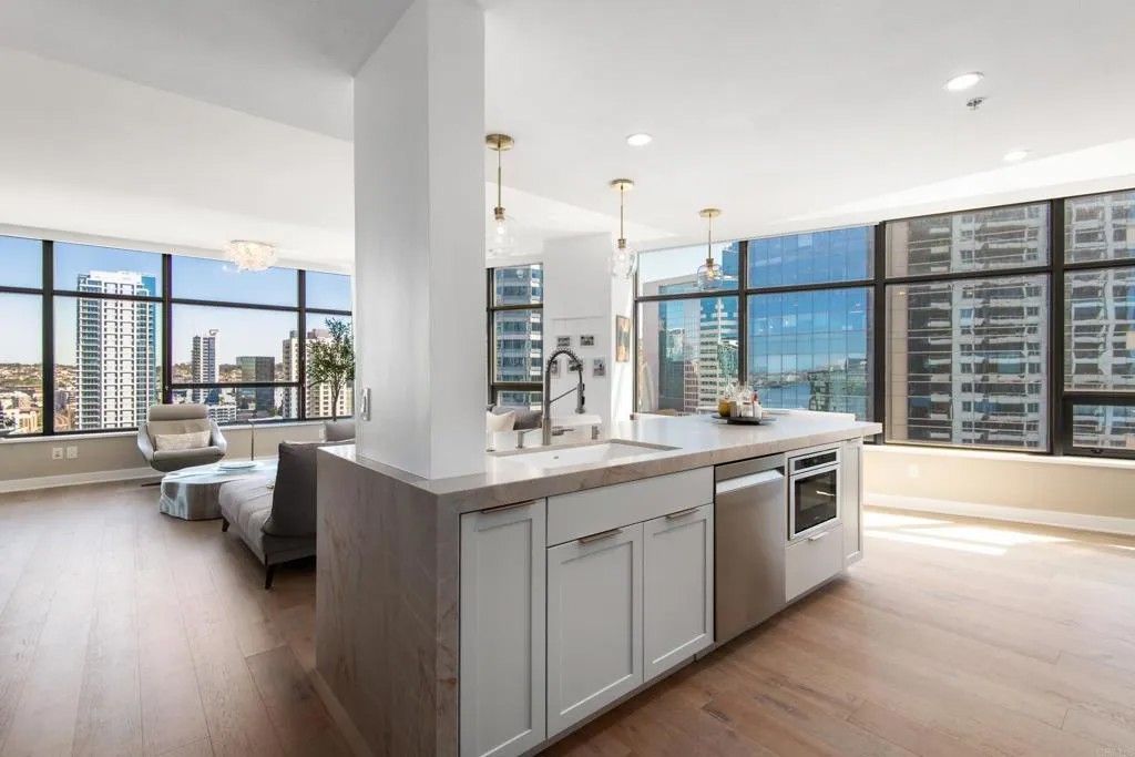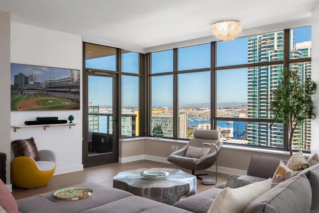 America's Finest City has never looked better from this stunning 19th floor Electra with picturesque views from every direction. Contemporary sophistication awaits you in this highly desired (04 stack location) luxury condo featuring 2 bedrooms, 2 bathrooms & 1468 square feet of living space with elite ocean, San Diego Bay, Coronado & twinkling cityscape views. The equally impressive interior boasts a custom designed kitchen with natural stone countertops & waterfall edge, Bosch appliances, designer dimmable pendant lighting, high quality hardwood flooring, smart home features, 2 beautiful view balconies, full sized LG stacked washer/dryer, dual zoned HVAC & 2 parking spaces next to an electric charging station. Electras top-tier resident amenities include 24 hour concierge & top notch security. Luxuriate in the resort-style pool, spa, steam room, fitness center & romantic outdoor fireplace. A short walk to Waterfront Park, Seaport Village, historic train station, Little Italy, The Radys Shell, Petco Park & fabulous restaurants & shopping.