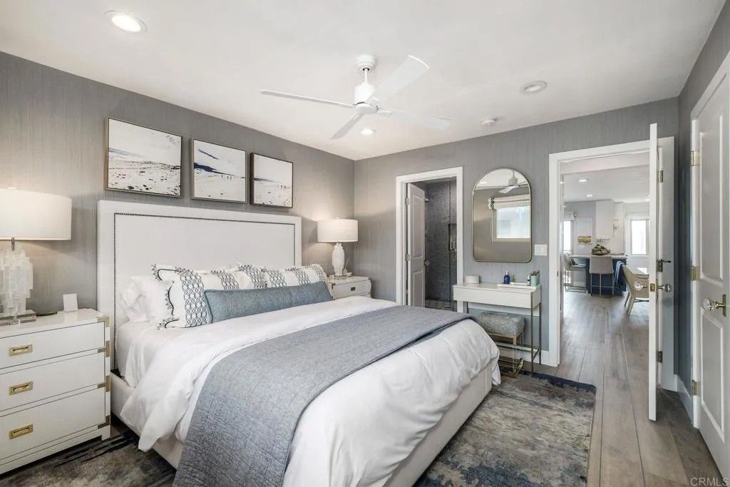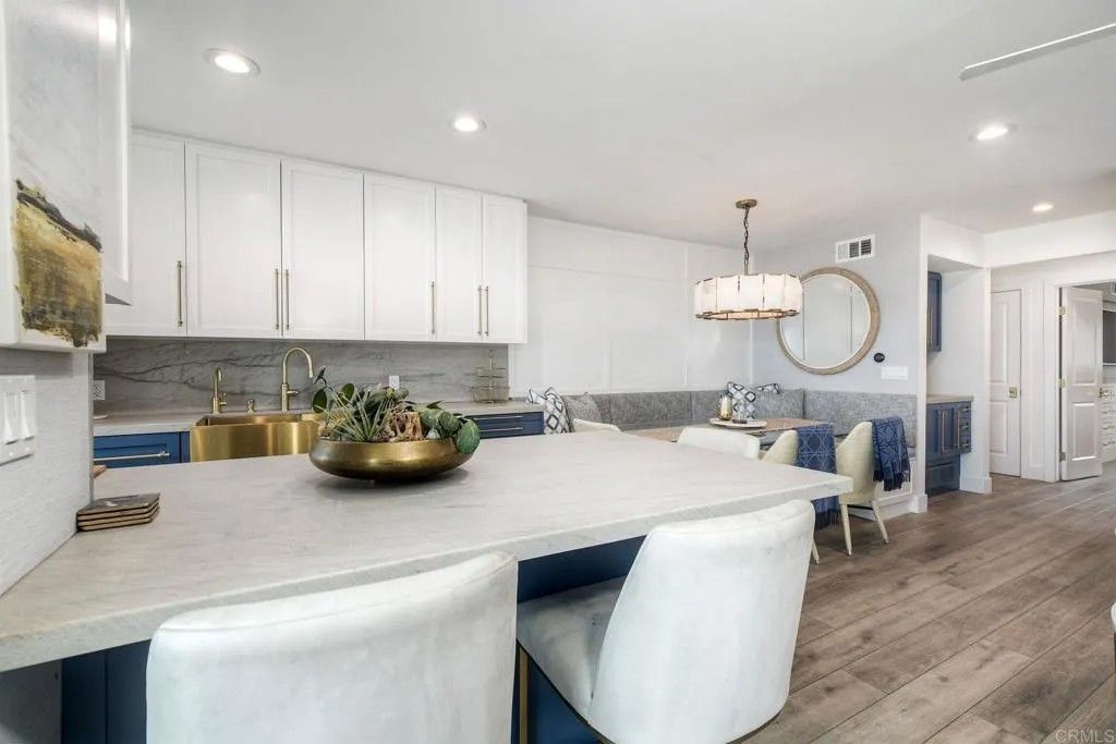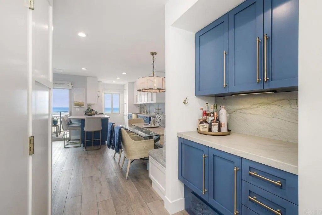 This extraordinary ocean-view home, fully renovated by renowned Beverly Hills designer Christopher Grubb, is nothing short of exquisite. Though just a one-bedroom, every inch of this residence has been thoughtfully curated with luxury and functionality in mind. With no one above you, the open-concept, sun-drenched layout showcases wood flooring, state-of-the-art appliances and custom built-ins throughout including an integrated refrigerator and dishwasher and Picture Televisions in both the living room and bedroom. The spacious dining area easily accommodates family and guests, while the serene bedroom features generous closet space and a beautifully appointed en-suite bathroom with walk-in tiled shower and dual vanities. Step onto your private balcony to take in unobstructed, panoramic ocean views, the perfect spot to relax and unwind. The community offers resort-style amenities including a heated pool and spa, BBQ area, elevators, laundry on every floor, gated parking and guest access. Ideally located near the Harbor, beaches, restaurants, and shops, this property captures the very best of coastal Oceanside living. With HOA-approved short-term rentals, this is an ideal choice for a primary residence, vacation rental or investment property.