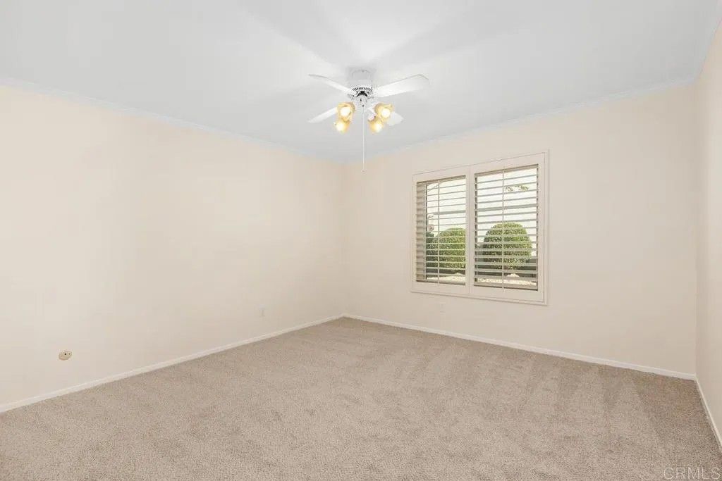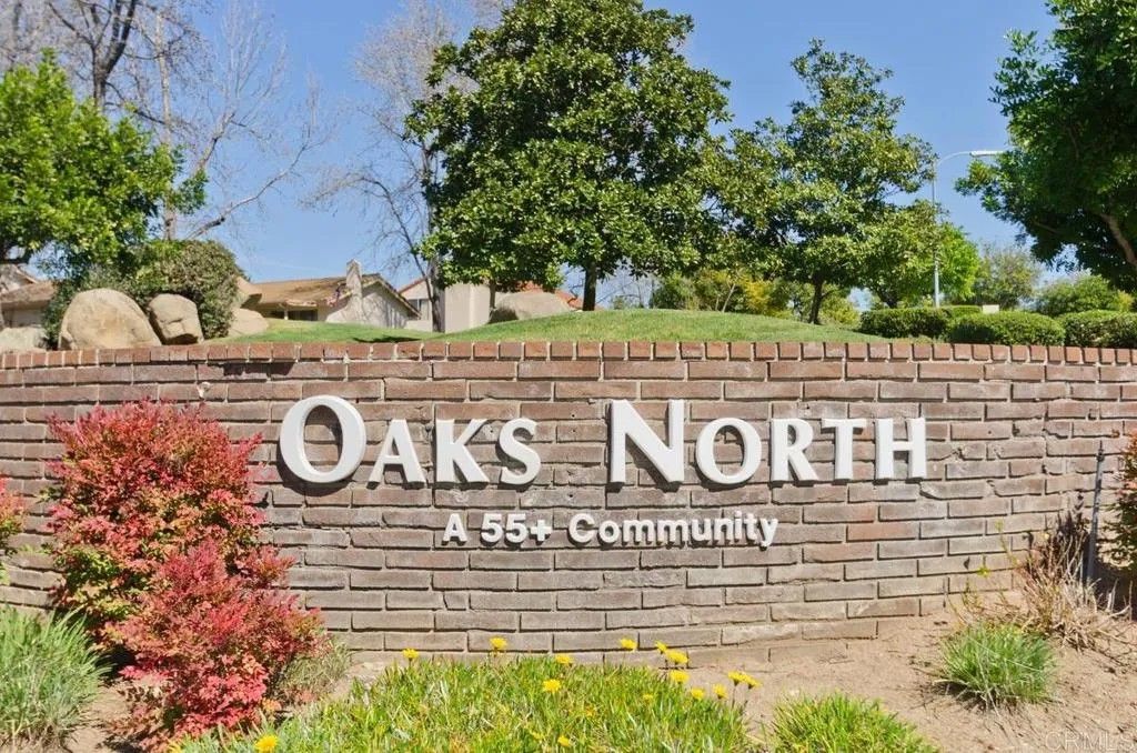 Welcome to this beautifully maintained single-story home! This inviting residence features 3 bedrooms (one is currently being used as an office, complete with built-in storage). The interior has been freshly painted and updated with brand-new carpet throughout, and plantation shutters adorn the windows. The spacious living room showcases vaulted ceilings, a gas fireplace, and abundant natural light, creating an inviting and open atmosphere. The kitchen is equipped with stainless steel appliances and ample cabinetry. The primary bedroom features a large walk-in closet and a sliding glass door that provides easy access to your expansive backyard, where you can relax and enjoy peaceful views of the community and surrounding nature. Experience the serene and active lifestyle that Oaks North, one of San Diegos most desirable 55+ communities, is known for with beautifully maintained grounds, friendly neighbors, and resort-style amenities.