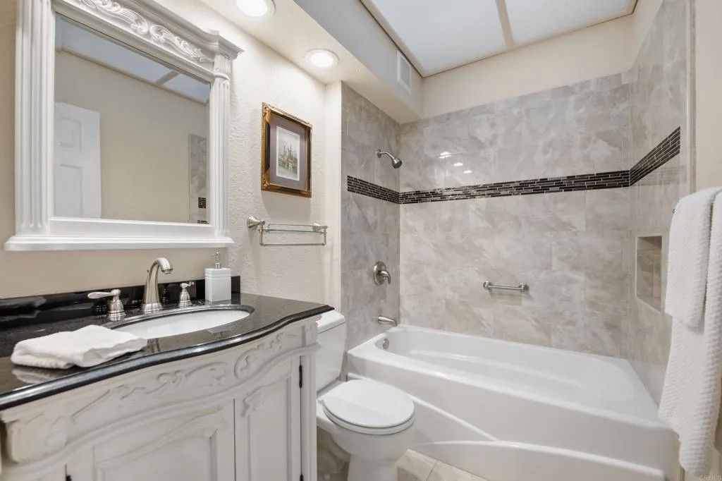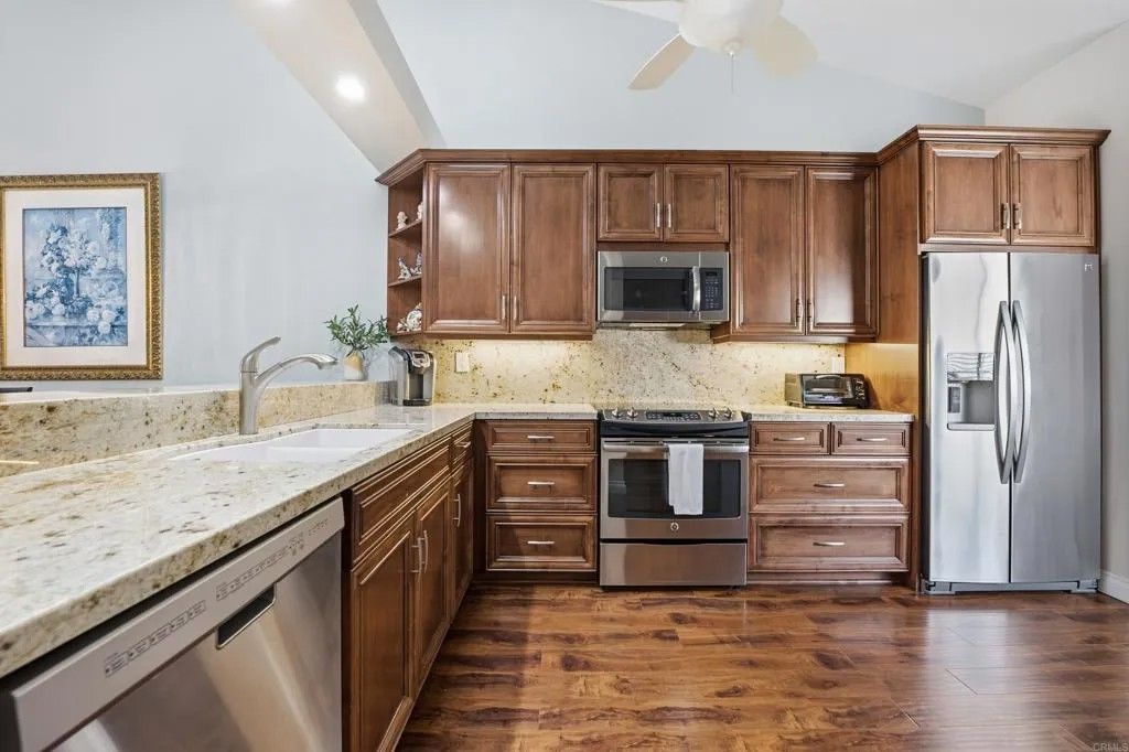 Oaks North, 55+ Active Adult Community, at it's finest! When you first walk in through gate you will notice a spacious, quiet private courtyard perfect for your morning coffee. Living room shows light, bright and open with vaulted ceilings, skylights and slider to back patio. There is upgraded wood flooring throughout home. The open kitchen floorplan will take your breath away with updgraded cabinetry, appliances, granite counter tops and direct access to the garage. Each bathroom has a beautiful vanity and custom features. The primary bedroom has ample space with slider to the back private patio. Back patio offers parklike setting with views of community grassy area. Oaks North is an active adult community that has community clubhouse, exercise room, pool & spa, tennis, pickleball and lawn bowling courts. Various classes are offered for all different interests. The Rancho Bernardo Winery is located approximately one mile to the East and the Oaks North Golf Course is one mile to the South.