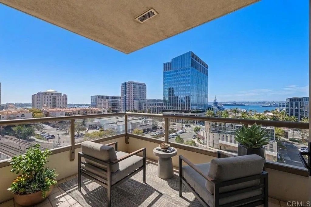 Perched on the 8th floor of the iconic Electra building, this beautiful home features 1315 square feet of meticulously designed living space with 2 bedrooms, 2 bathrooms PLUS a den. Nestled in the heart of San Diego's vibrant Columbia District, this property truly offers the ultimate urban lifestyle. Panoramic southwest-facing views of the bay, skyline, and the building's serene pool area! Upon entry, you're greeted by an abundance of natural light streaming through expansive windows, highlighting the open-concept layout. The living and dining areas seamlessly flow into a private balcony, perfect for al fresco dining or simply enjoying the views and coastal breezes. High-end finishes in the kitchen include stainless steel appliances and sleek slab granite countertops. The primary suite offers a tranquil retreat with two closets and a spacious spa-like bathroom featuring a soaking tub and separate shower. An additional bedroom and a versatile den provide flexibility for guests, a home office, or workout room. Additional features include fresh paint, new carpet in bedrooms, modern track lighting, and a cozy living room fireplace. Residents of this boutique building enjoy a range of amenities, including a heated pool, spa, fitness center, and 24-hour staffed lobby. With a Walk Score of 96, you're just steps away from the waterfront, Seaport Village, Little Italy, and and some of San Diego's best dining and entertainment. Dont miss your chance to call this exquisite residence home. Please note that select photos are virtually staged.
