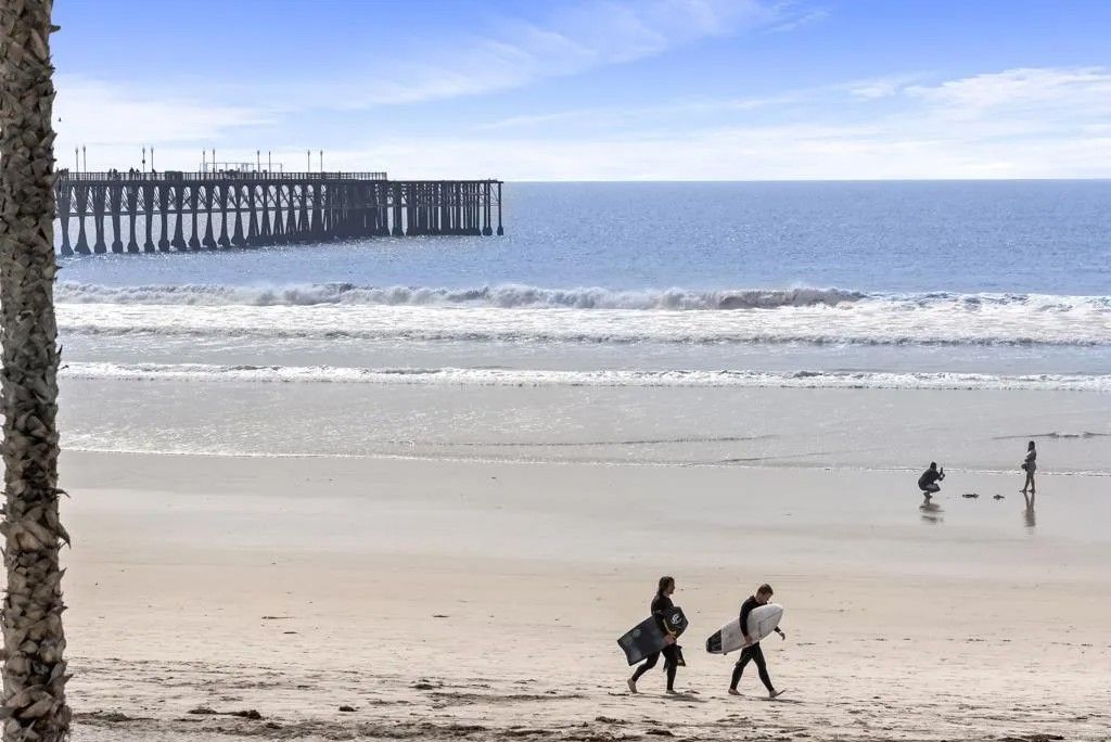 Experience breathtaking front-row coastal living at 400 N The Strand #27a beachfront gem in the coveted San Miguel III community. This rare ground-level unit offers no-stairs access, making beachside living both luxurious and effortless. Enjoy panoramic white water ocean views and the soothing sound of waves from the comfort of home! Inside, the condo features fresh paint and tastefully updated bathrooms, creating a clean and modern coastal vibe. The open-concept living space is filled with natural light and opens directly onto an ocean-view patioperfect for dining al fresco or soaking in the sunsets over the Pacific. As evening falls, take in the magical sight of the Oceanside Pier glowing against the night skyan unforgettable view right from your living room or patio. The spacious primary bedroom features a walk-in closet and dual sink vanity. Additional highlights include in-unit laundry, a cozy fireplace, and two assigned underground parking spaces in a gated garage with elevator access. Ideally located just a short stroll from the Oceanside Pier, marina, and vibrant downtown, this home puts you steps away from Oceansides best dining, coffee shops, and boutique shopping. San Miguel III is a well-maintained beachfront community featuring two spas, beautifully landscaped grounds, and multiple access points to the sand. Whether you're looking for a peaceful beachfront escape or an unbeatable location to enjoy all that Oceanside has to offer, this is your chance to own a front-row seat to Southern Californias iconic coastline.