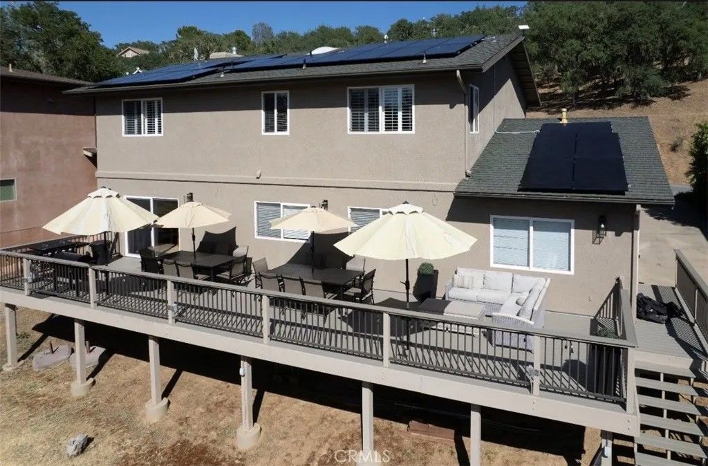 Your lake retreat awaits in this beautifully updated 4 bedroom, 2.5 bathroom TURN KEY lake house offering serene lake views and modern comfort inside and out! Step inside to an inviting open floorplan filled with natural light and tasteful updates throughout. The interior features new flooring, window shutters and updated LED lighting that enhance every room. The kitchen showcases stainless steel appliances including a propane range, microwave and dishwasher perfect for home chefs and entertainers alike. Upstairs and downstairs each feature their own AC unit for added year-round comfort. The exterior has been recently painted and the rear deck has been rebuilt with composite decking and is ideal for entertaining or relaxing while enjoying lake views. The property is designed with convenience in mind, offering boat parking along the side yard and a garage that can accommodate most ski and wake surf boats. The deepest point of the garage measures 30' deep. The front yard features low-maintenance artificial turf, while owned solar panels provide energy efficiency and savings. Experience lakeside living at its finest where every detail blends luxury, comfort, and recreation in perfect harmony.
