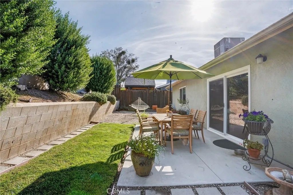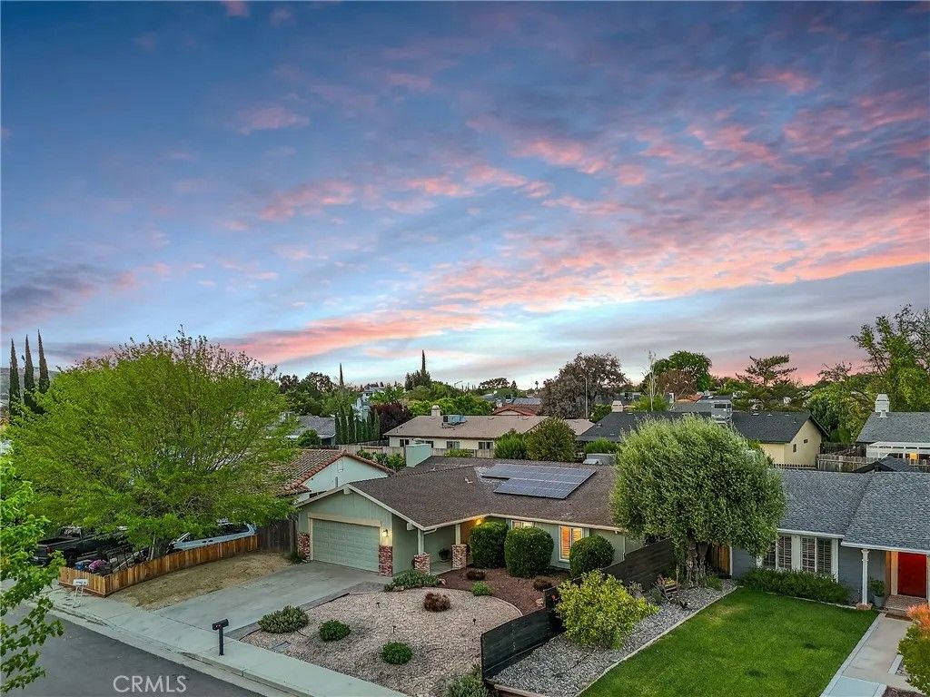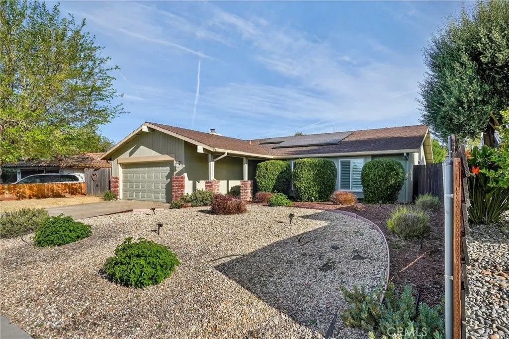 Located on a quiet circle drive, 615 Palomino welcomes you with attractive curb appeal and thoughtfully designed front yard landscaping that sets the tone from the moment you arrive. This inviting home offers a comfortable layout with well-appointed, renovated spaces and seamless indoor outdoor living. The spacious living room serves as a central gathering area, featuring a sliding glass door that opens to the backyard, creating an easy connection for everyday living and entertaining. The kitchen has been tastefully renovated with granite countertops, white cabinetry, and stainless steel appliances, offering both style and functionality. Just beyond, the dining room is anchored by a cozy fireplace and includes its own slider to the backyard, enhancing the natural flow of the home. The primary suite provides a relaxing retreat with a beautifully updated en suite bathroom showcasing quartz countertops, updated lighting, hexagonal tile flooring, and a glass enclosed shower finished with classic subway tile. Two additional guest bedrooms offer comfortable accommodations, while the hall bathroom mirrors the same thoughtful updates with quartz counters, updated lighting, hex tile flooring, and a tub shower combination. Follow the tour outdoors to a backyard designed for both relaxation and enjoyment. Garden boxes invite you to grow your own produce, while the lawn, patio, paver areas, and a peaceful hammock space create multiple areas to unwind or entertain. Additional features include a two car garage and leased solar for added efficiency. Conveniently located less than 10 minutes from downtown Paso Robles, you can enjoy local restaurants, wine bars, and community events, with shopping and schools just 5 minutes away. Imagine settling into this well cared for home and enjoying the ease of Central Coast living, schedule your showing today.