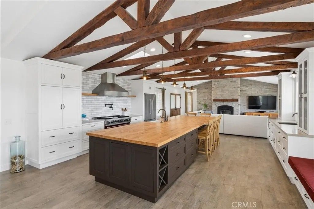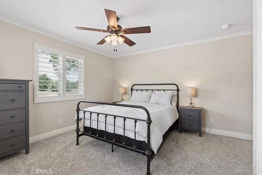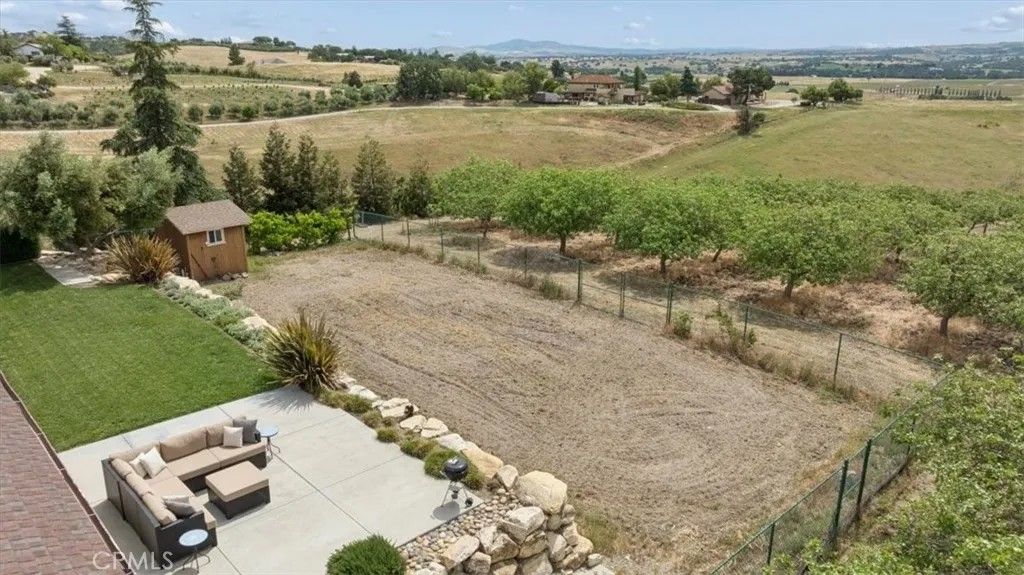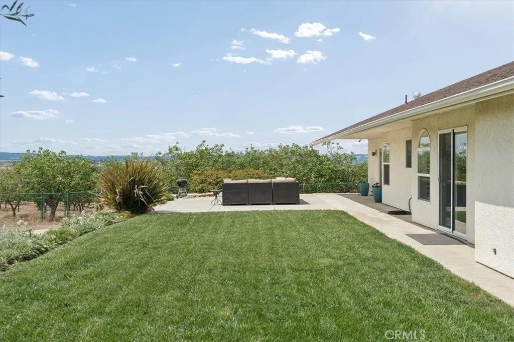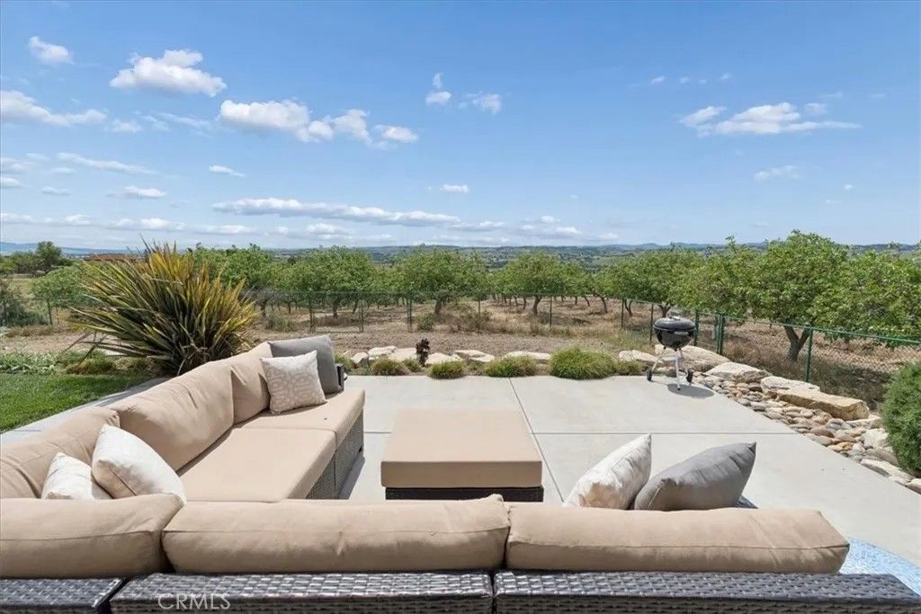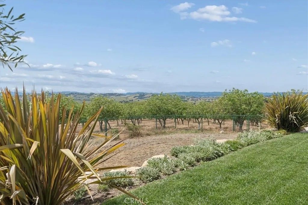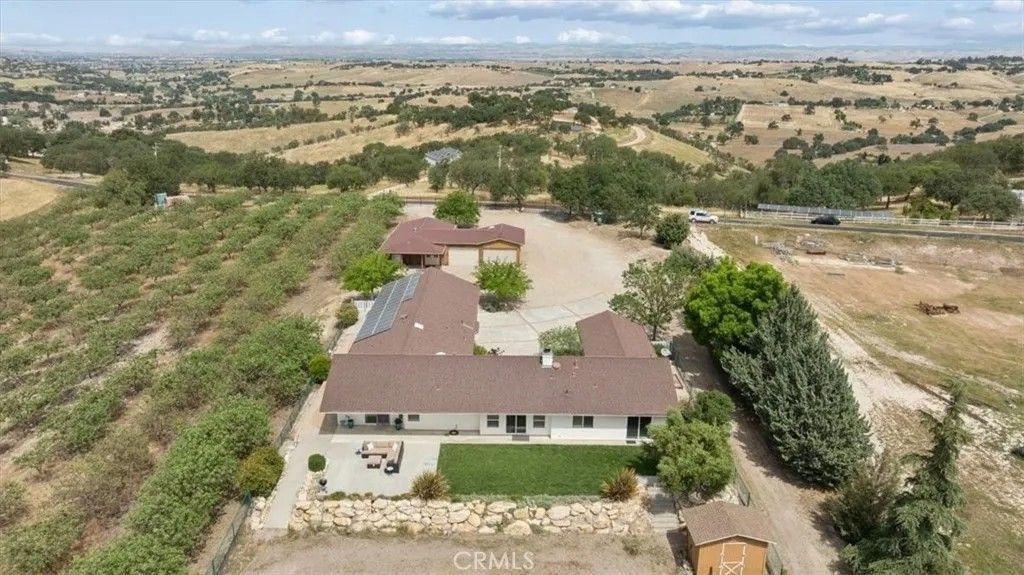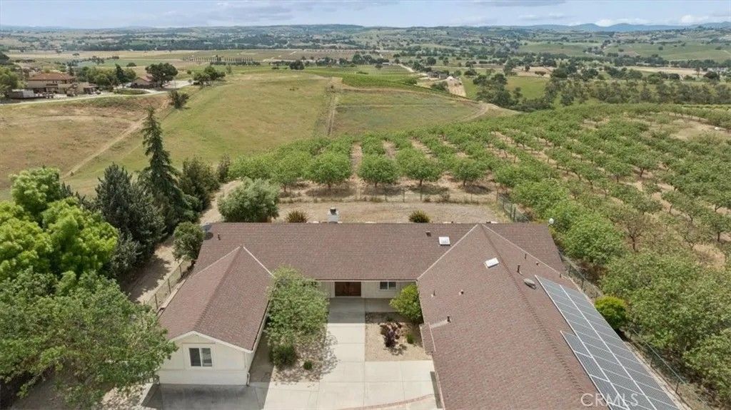 Stunning panoramic views and refined country living define this exceptional single-level estate on a picturesque 10+ acre hilltop parcel just minutes east of Paso Robles. The open-concept ranch-style home is designed for comfort and entertaining, with the living room, dining area, and kitchen flowing seamlessly together around a striking custom 20-foot island. The kitchen is further enhanced by a Viking range, while a wood-burning fireplace adds warmth and charm to the living room. Expansive windows frame the surrounding landscape and capture breathtaking views from nearly every room. The spacious floorplan includes three bedrooms, an office, bonus room, and large walk-in pantry/storage room. An attached three-car garage and substantial detached shop offer exceptional space for vehicles, equipment, hobbies, or agricultural use, with the shop featuring two roll-up doors, a large workroom, half bath, and walk-in cooler. Approximately six acres of mature organic pistachio trees create privacy and a beautiful setting. Owned solar, pipe fencing, and gated entry complete this remarkable Paso Robles area property.