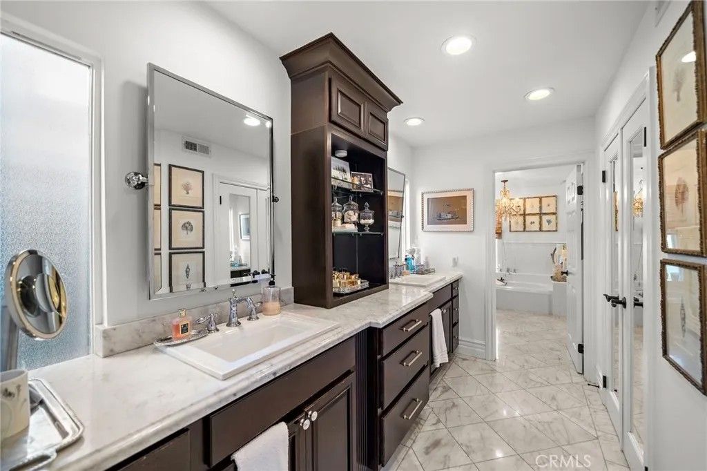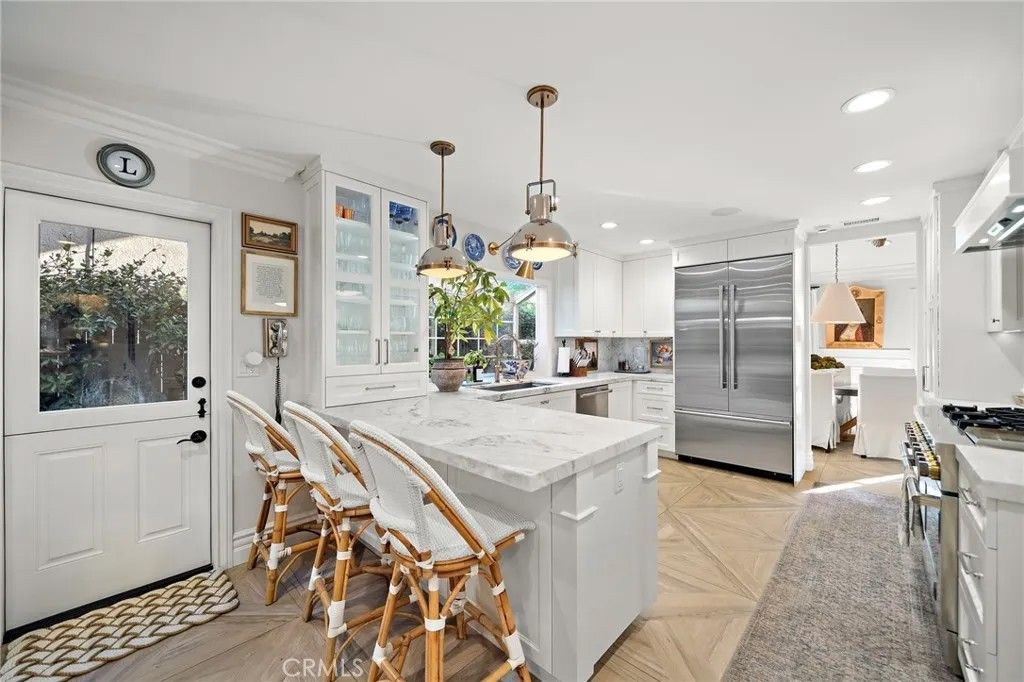 Don't miss out on this one-of-a-kind GEM! Located in the heart of Irvine's highly sought after Northwood community, this highly upgraded pool home with soaring vaulted ceilings offers 4 bedrooms, 2.5 baths, a large loft, and touches of custom design and quality craftsmanship that truly bring this unique, warm home to life! Elegant design elements include crown molding, wainscoting, skylights, romantic fireplace, custom wallpaper, dutch doors, high-end light fixtures, recessed lighting, and custom entertainment/closet built-ins throughout! Step outside into your own private oasis with NO HOMES BEHIND to find the real meaning of tranquility. Enjoy entertaining around the beautiful pool or relaxing under the gazebo while surrounded by the peaceful ambiance created by multiple water features, an abundance of greenery, incredible lighting, and the soothing aroma of jasmine. Recently remodeled, the luxurious kitchen is adorned with beautiful Calacutta marble, professional grade stainless steel appliances including a dual oven and large range hood, pot filler, oversized Rohl stainless steel sink, step-in pantry, and a peninsula with bar seating. Plenty of soft-close cabinetry, counter space, and bright light make this kitchen a living dream! The main floor primary suite is fit for royalty, with a custom built-in entertainment and storage system, french doors opening to the magnificent backyard, and a large bathroom with Pereira marble flooring and countertops, walk-in closet, oversized shower with dual shower heads, and a standalone tub. Head upstairs to find the large loft, three bedrooms, and a full bathroom. Other upgrades include: Nest thermostat; interior and exterior surround sound system; alarm system equipped with door, window, and motion sensors; newer dual paned vinyl windows. Dedicated laundry room and 2-car garage with epoxy flooring and overhead storage and cabinetry.