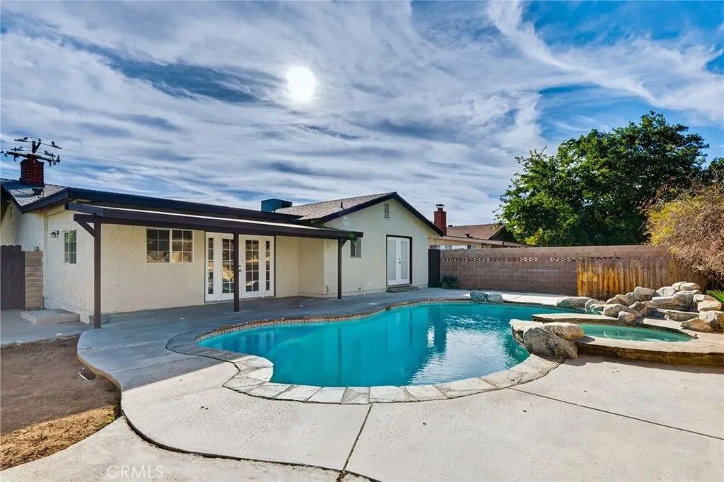 Inviting one-story home featuring 3 bedrooms, 2 bathrooms, and a 2-car garage. The living room offers a cozy fireplace and elegant French doors that open to the back porch. Enjoy outdoor living with a fenced backyard and a fenced in-ground pool perfect for relaxing or entertaining. A charming front porch adds great curb appeal. One or more photos have been virtually staged.