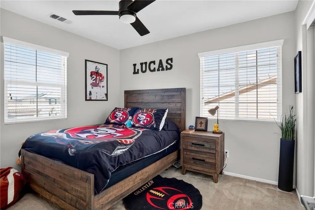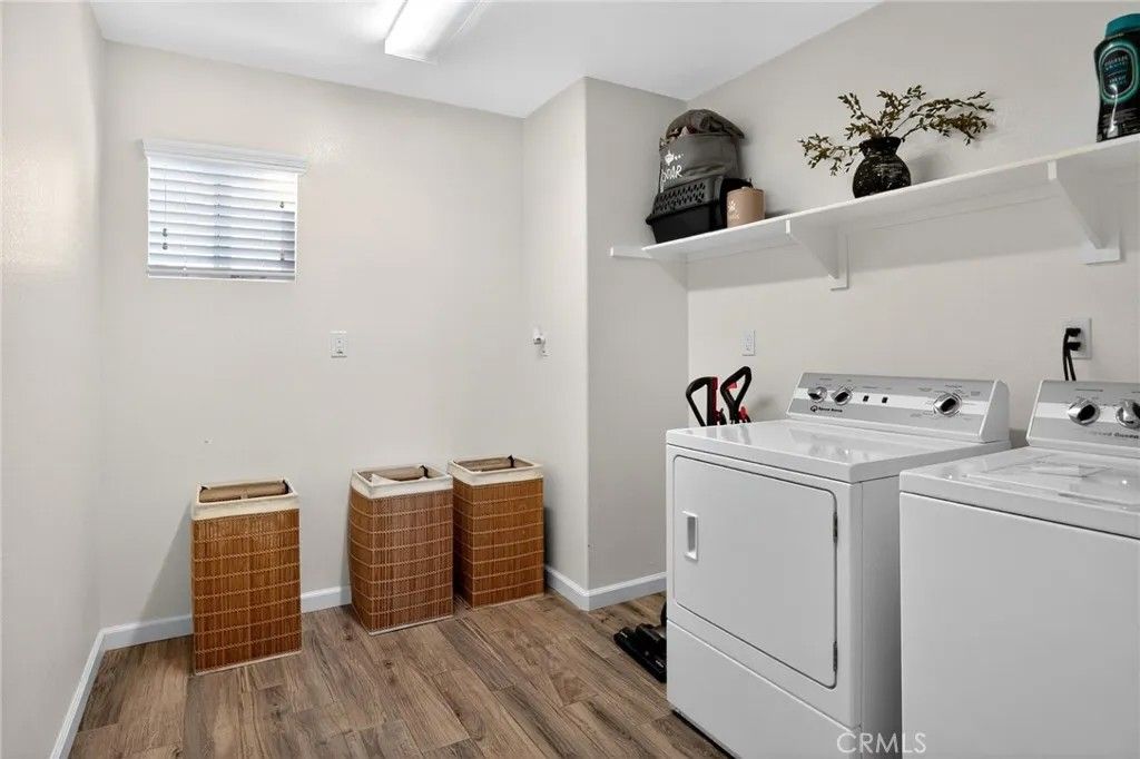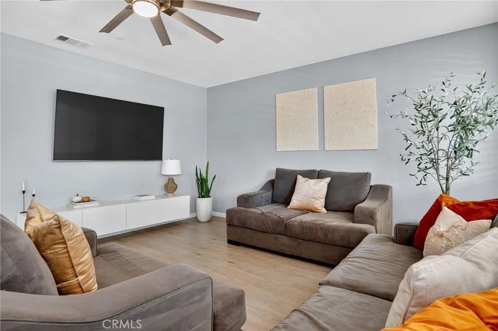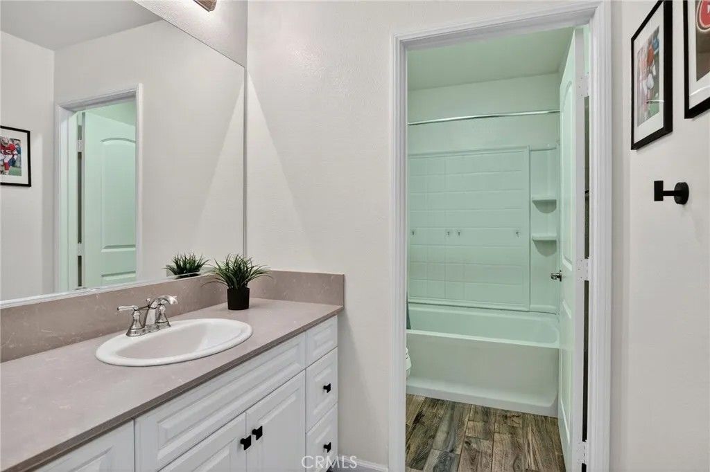 Highly upgraded like New home leaves little to be desired. Laminate Wood Flooring throughout all common areas, staircase, & upstairs landing. Bathrooms & Laundry room ceramic tile flooring. Foyer & hall welcomes anyone heading into Large open floor plan to accommodate guest while entertaining. Living/Family style Kitchen with oversize Granite top Island & counter tops, lots of prep space & storage. Upgraded Window Shutters. Media Room or future Guest Bedroom downstairs with full bathroom. Upstairs loft area excellent for a quiet time with a small desk for any home-schooling need. Two more bedrooms & Master Suite with Bathtub & Private Shower stall. Large walk-in closet. Laundry room upstairs. Custom Stamped Concrete patio & professionally installed Patio Cover, Ceiling Fans, & prewired speaker cable & electrical outlets. Completely finished garage with upgrade Epoxy Flooring, it offers a three Car tandem for Cars, Bikes, Toys or your own personal Gym.