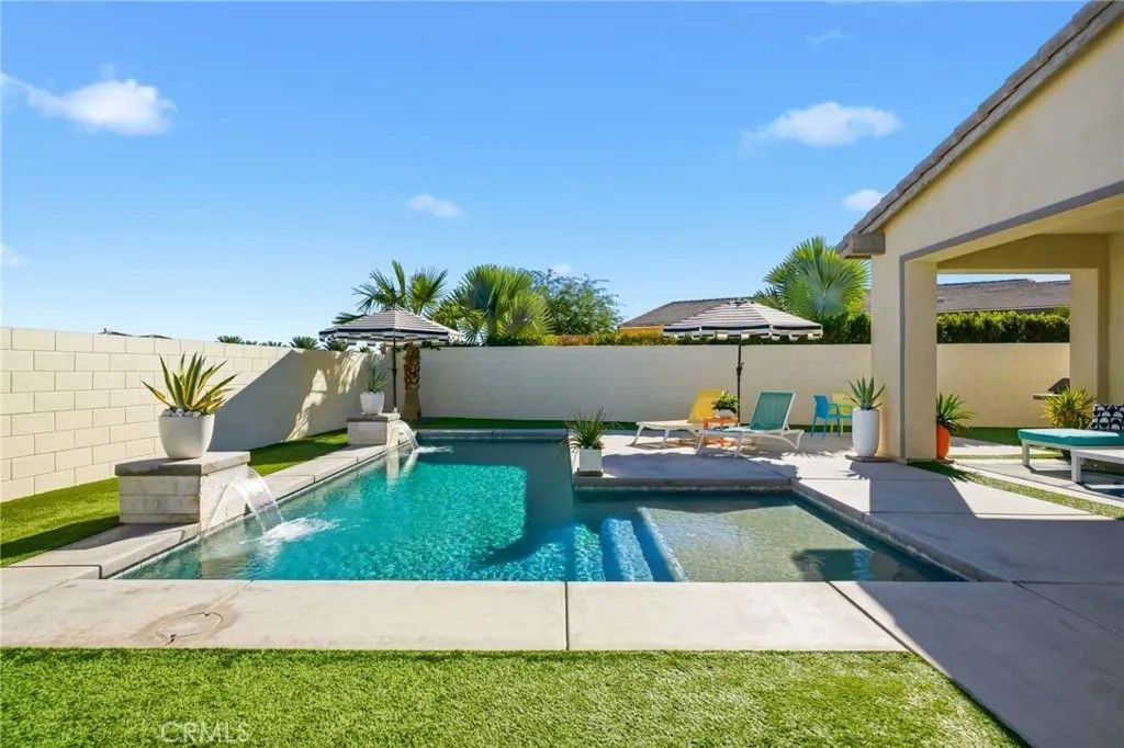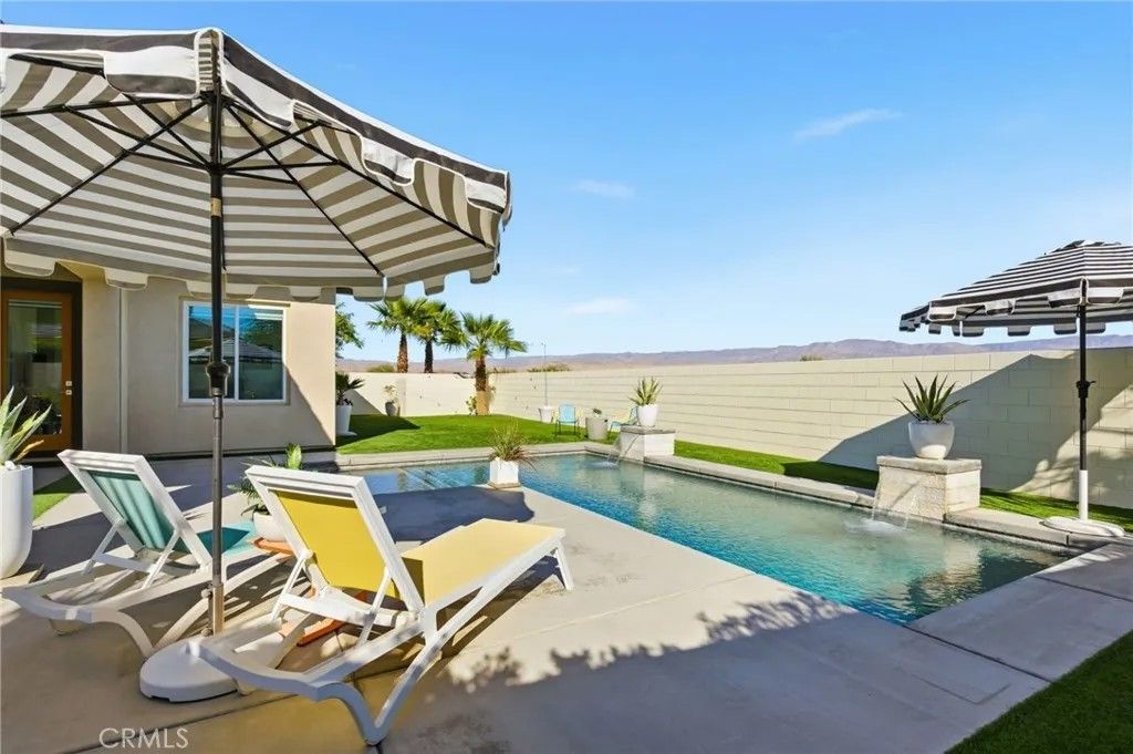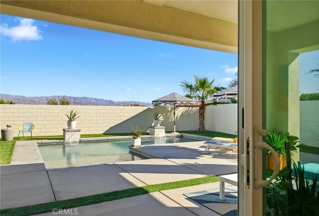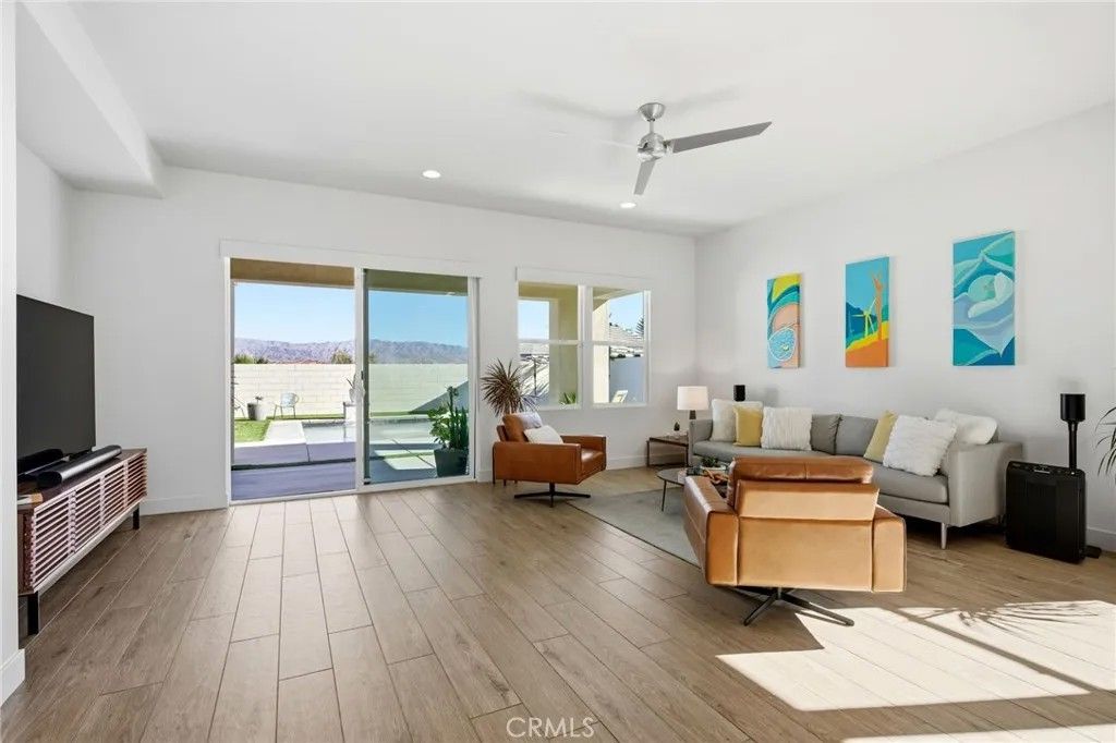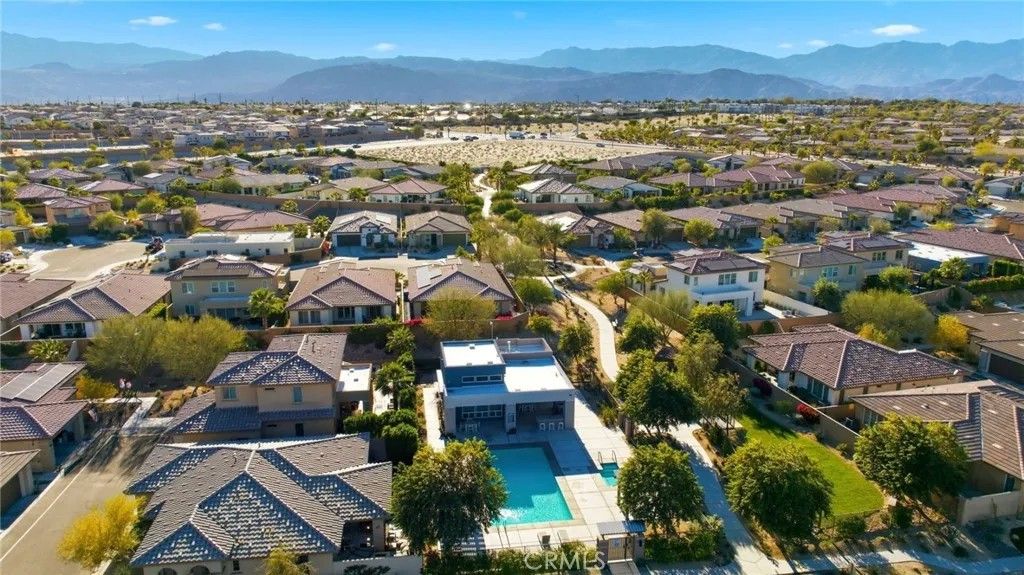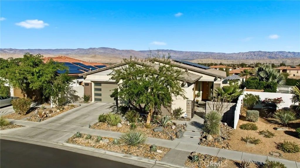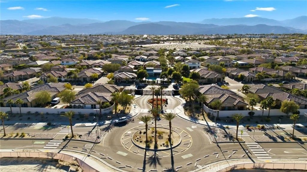 Welcome to 74376 Zeppelin Dr. in Genesis a 2018-built, single-level showpiece with a crisp, mid-centuryinspired aesthetic and the effortless livability of modern construction. Meticulously cared for, it presents like a nearly new build, with the added advantage of mature landscaping and a fully finished, move-in-ready setting so you can immediately enjoy the lifestyle. Inside, the home is bright, clean, and elevatedan airy open-concept layout is amplified by 10-foot ceilings and walls of natural light. The designer kitchen is equal parts function and style, featuring a quartz waterfall-style island with seating, stainless appliances, subway tile backsplash, and under-cabinet lightingperfect for both everyday living and effortless entertaining. The primary suite is a calm retreat with backyard access, UBLOCKOUT motorized blackout shades for true total darkness, and a generous custom closet. The spa-inspired bath features a walk-in shower, oversized soaking tub with quartz surround, and a dual quartz vanity. Two additional bedrooms each offer en-suite baths, plus a dedicated office/den, three full baths + a powder room, and smart storage throughout (including a hall closet perfect for luggage or seasonal items). A rare standout: the third-car garage, plus finished garages with epoxy flooring. High-value upgrades include 30 owned solar panels, a Tesla Powerwall, two EV chargers (NACS + J1772), a Nest wireless security system, and a Lutron Casta lighting system, along with a tankless water heater, A/C, and ceiling fans. Step outside and it becomes unforgettable: a private, resort-modern backyard with a saltwater pool featuring a tanning shelf, waterfalls, and Pentair ScreenLogic WiFi + Intellibrite color lightingall controlled from your phone. There's low-maintenance artificial turf, with plenty of room for games and pets. And then there are the views: breathtaking mountain panoramas stretching to the Coachella Preserve and Joshua Tree National Park. In Genesis, homes that capture these big, wide-open sightlines are the true crown jewelsa daily backdrop that never gets old. Genesis is a beautifully maintained gated community with a pool, spa, fitness center, walking paths, and security gatesand the low HOA is a standout value, including 1G fiber internet and DirecTV streaming. This is modern desert living at its best: design-forward, impeccably maintained, and framed by views that define the destination.