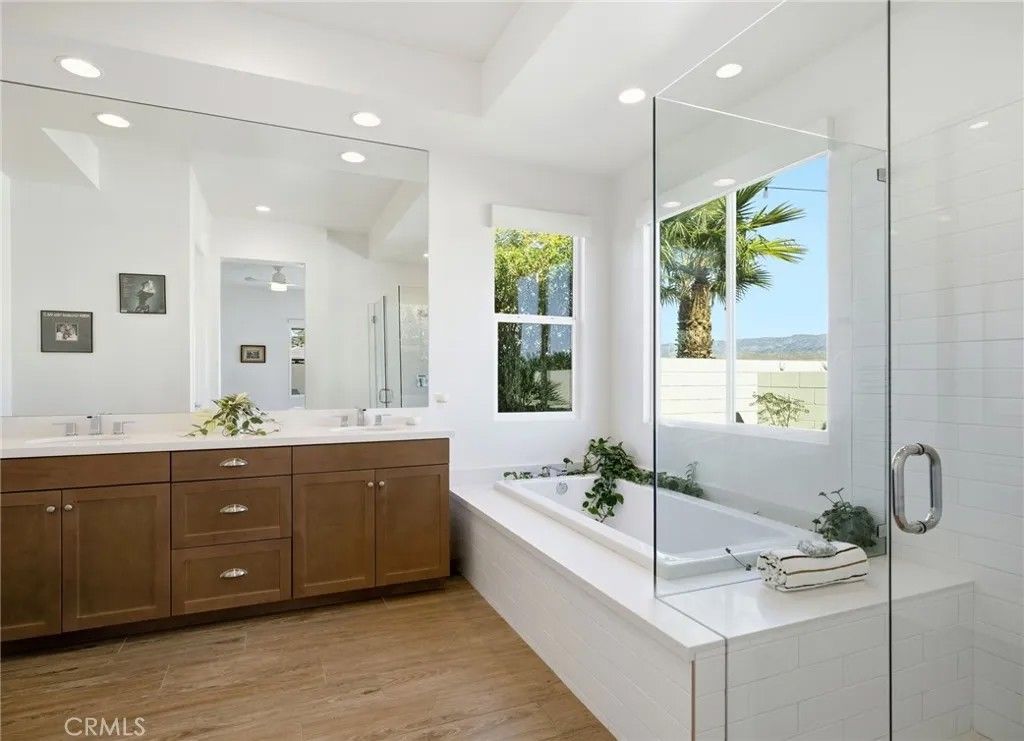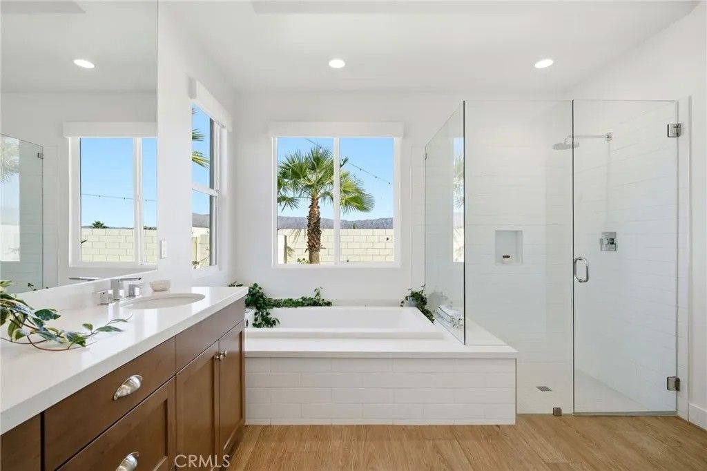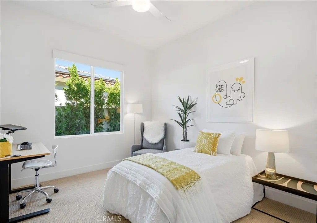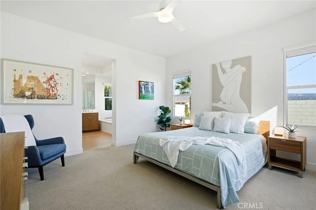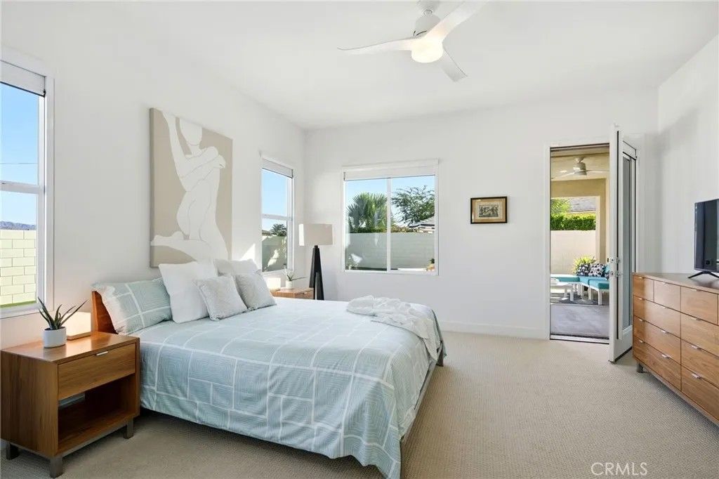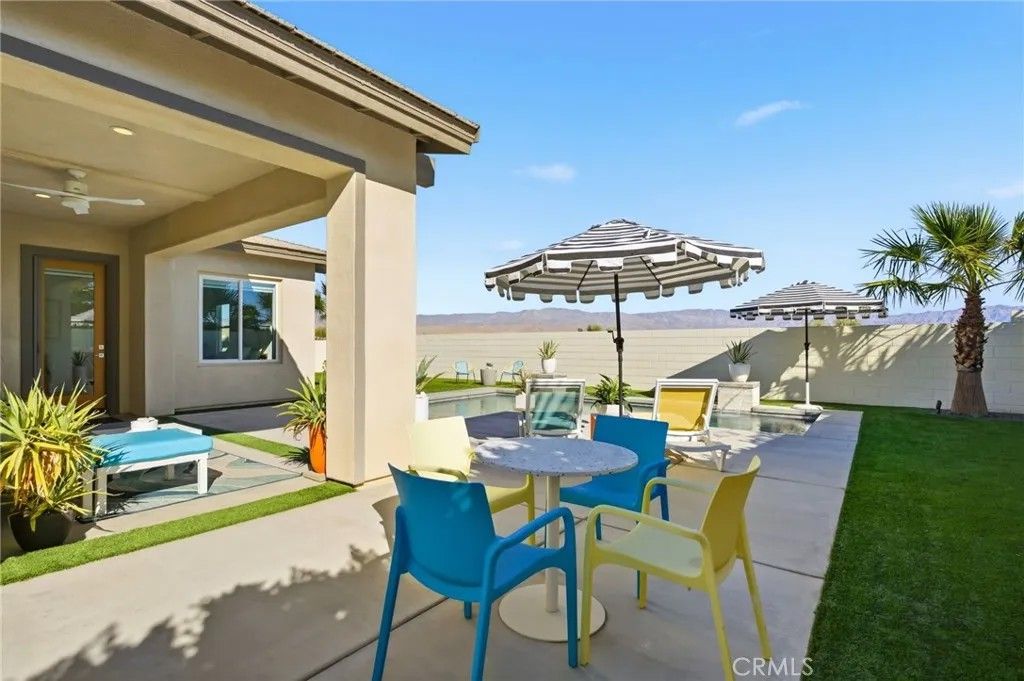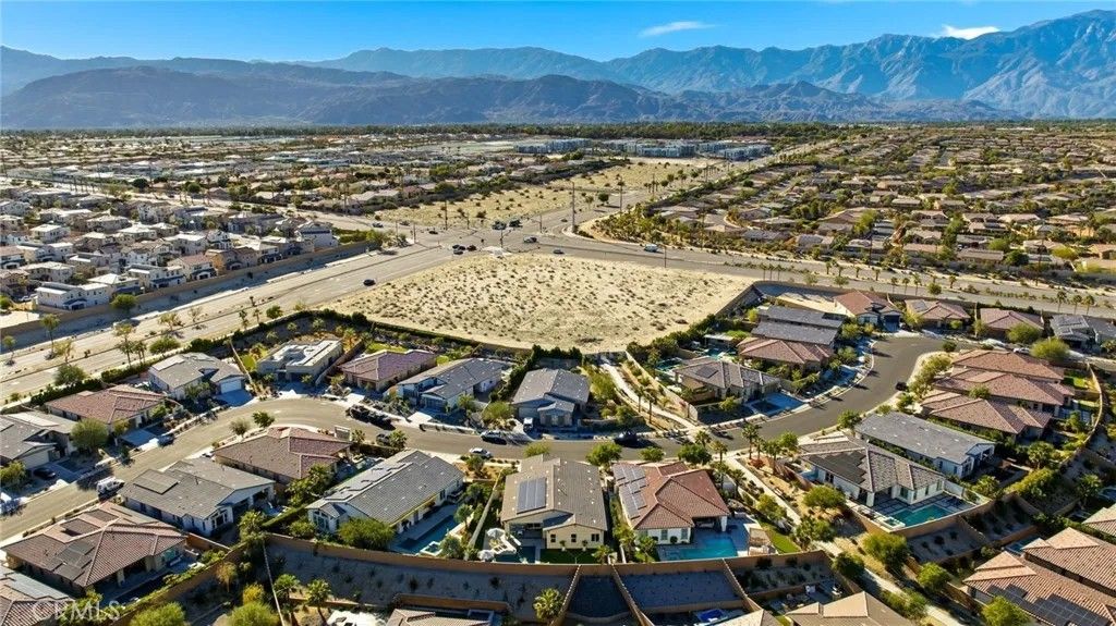 Welcome to 74376 Zeppelin Dr. in Genesis a 2018-built, single-level showpiece with a crisp, mid-centuryinspired aesthetic and the effortless livability of modern construction. Meticulously cared for, it presents like a nearly new build, with the added advantage of mature landscaping and a fully finished, move-in-ready setting so you can immediately enjoy the lifestyle. Inside, the home is bright, clean, and elevatedan airy open-concept layout is amplified by 10-foot ceilings and walls of natural light. The designer kitchen is equal parts function and style, featuring a quartz waterfall-style island with seating, stainless appliances, subway tile backsplash, and under-cabinet lightingperfect for both everyday living and effortless entertaining. The primary suite is a calm retreat with backyard access, UBLOCKOUT motorized blackout shades for true total darkness, and a generous custom closet. The spa-inspired bath features a walk-in shower, oversized soaking tub with quartz surround, and a dual quartz vanity. Two additional bedrooms each offer en-suite baths, plus a dedicated office/den, three full baths + a powder room, and smart storage throughout (including a hall closet perfect for luggage or seasonal items). A rare standout: the third-car garage, plus finished garages with epoxy flooring. High-value upgrades include 30 owned solar panels, a Tesla Powerwall, two EV chargers (NACS + J1772), a Nest wireless security system, and a Lutron Casta lighting system, along with a tankless water heater, A/C, and ceiling fans. Step outside and it becomes unforgettable: a private, resort-modern backyard with a saltwater pool featuring a tanning shelf, waterfalls, and Pentair ScreenLogic WiFi + Intellibrite color lightingall controlled from your phone. There's low-maintenance artificial turf, with plenty of room for games and pets. And then there are the views: breathtaking mountain panoramas stretching to the Coachella Preserve and Joshua Tree National Park. In Genesis, homes that capture these big, wide-open sightlines are the true crown jewelsa daily backdrop that never gets old. Genesis is a beautifully maintained gated community with a pool, spa, fitness center, walking paths, and security gatesand the low HOA is a standout value, including 1G fiber internet and DirecTV streaming. This is modern desert living at its best: design-forward, impeccably maintained, and framed by views that define the destination.