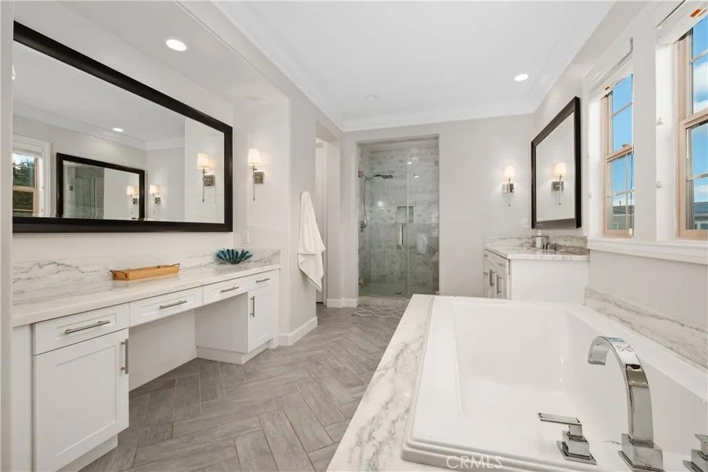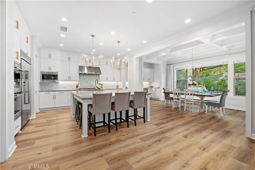 Nestled within the coveted Esencia community of Rancho Mission Viejo, this exceptional 5-bedroom, 5.5-bath Aubergine Plan 3 residence has been thoughtfully upgraded and meticulously designed. Refreshed with new exterior paint, the home offers impressive curb appeal. A charming courtyard welcomes you and separates the home from the casita, ideal as an office or guest suite with its own entrance, newer AC, and full bathroom. Inside, wainscoting frames the grand staircase and elegant foyer. Fresh interior paint and new luxury vinyl flooring on the first level create a bright, contemporary aesthetic. Every window features custom casing, complemented by 10" crown molding and dimmable smart switches. A flexible downstairs den offers endless possibilities. The open-concept living space is the heart of the home, where the kitchen seamlessly connects to the family and dining areas. The kitchen showcases white cabinetry with new champagne gold hardware, an oversized granite island, and premium stainless-steel appliances including a built-in refrigerator, double oven, 6-burner cooktop, and microwave. Coffered ceilings and new chandeliers elevate the dining area, while the extended dry bar has dual beverage refrigerators. A walk-in pantry and timeless backsplash complete the space. Stackable sliders open to a serene California room, where you can enjoy fireplaces both inside and out. The private backyard features low-maintenance turf with app-controlled sprinklers, pavers, apple trees, and a saltwater pebble tech spool with waterfall and fire pit. Upstairs, the primary suite offers beautiful views and a coffered ceiling. The upgraded bathroom includes herringbone tile flooring, marble countertops, a soaking tub, walk-in shower, and dual walk-in closets. Three additional bedroomstwo with ensuite bathsplus a hallway bath, laundry room, and bonus/movie room complete the upper level. The bonus room includes projector wiring, 5.1 surround sound, and movie screen paint creating a 115" viewing wall. Additional highlights include a 3-car garage with epoxy flooring, overhead storage, and two prewired EV outlets. The home also features two tankless water heaters and fully paid solar panels for energy efficiency. Residents enjoy top-rated schools and resort-style amenities including pools, spas, playgrounds, fitness centers, tennis and pickleball courts, bocce ball, an arcade, and moreoffering an unparalleled lifestyle in one of Orange Countys most desirable communities.