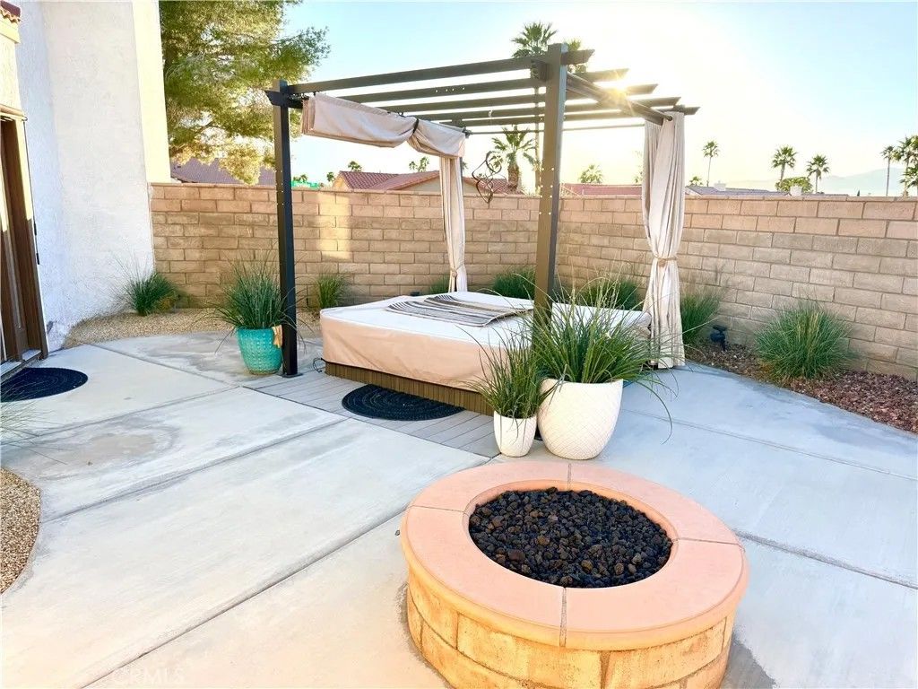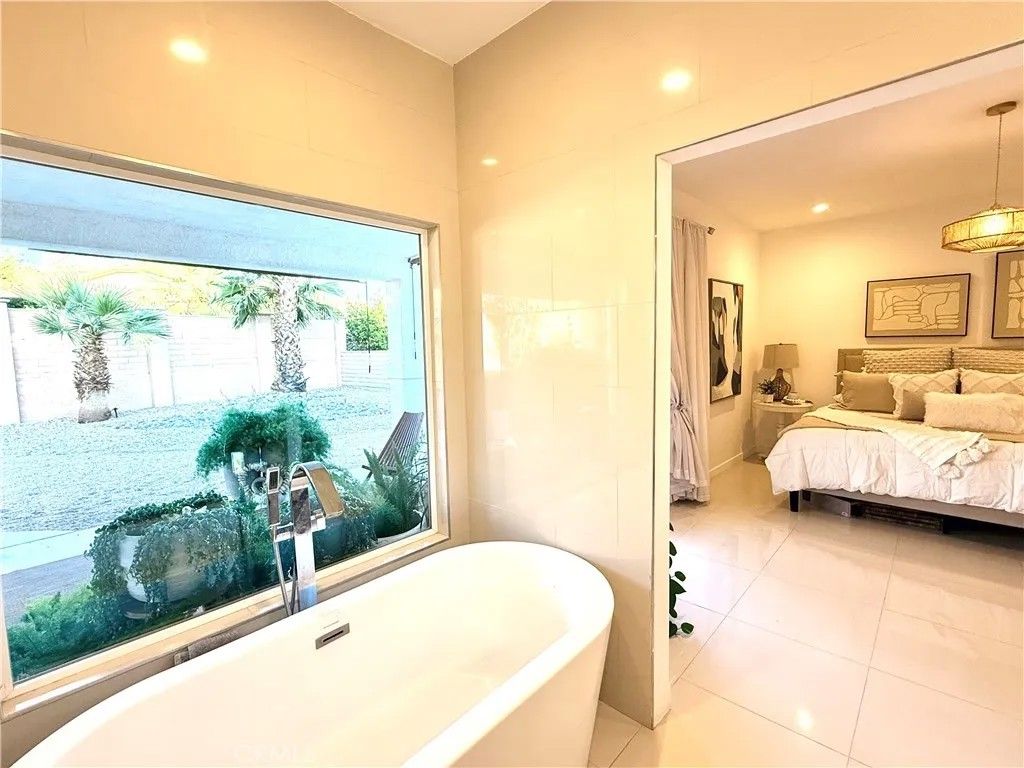 COMPLIMENTARY UNLIMITED GOLF FOR TWO on the Ted Robinson award-winning golf course is included with HOA dues, and downtown Palm Springs is just 20 minutes awayoffering true resort living with convenient downtown access. This 1,822 square foot residence presents a contemporary, chic, and transitional aesthetic with seamless indoor-outdoor flow, creating an environment that feels both refined and welcoming. Soaring wood ceilings crown expansive living spaces filled with natural light, enhanced by an abundance of French doors and updated windows that frame dramatic mountain views throughout. High-gloss, large-format modern cream-colored tile floors beautifully reflect the light, pairing effortlessly with smooth-coat, flat museum-white walls and rich mahogany doors to create a clean, gallery-like backdrop ideal for modern living. The thoughtfully designed layout includes three bedrooms and two baths, anchored by a serene primary suite featuring a statement vessel tub and a generous walk-in closet. A fireplace defines the main living area, while a newer A/C system ensures year-round comfort and leased solar adds energy efficiency. Outdoors, the front, back, and side yards are thoughtfully curated with distinctive local desert rock landscaping, blending natural textures with low-maintenance design. The fully fenced backyard offers exceptional privacy along with mountain views, a solid covered outdoor patio, and a private jacuzziperfect for relaxing, entertaining, or stargazing beneath the expansive desert night sky. Mission Lakes Country Club is a 54-year-old country club with a rich history, located in unincorporated Desert Hot Springs approximately three and a half miles from town off of Indian Canyon and Mission Lakes Boulevard, surrounded by open desert and mountains on all sides and known for its clean, close-knit community atmosphere. Residents enjoy golf holes set at the highest elevations in the Coachella Valley, offering sweeping views across the valley floor. HOA amenities include an aquatic center, tennis and pickleball courts, a six-room inn, the Sand Wedge caf, and fine dining at the San Gorgonio Room, completing a truly resort-style lifestyle. The community does not allow short-term rentals under 30 days, preserving a quiet, residential environment. Select furnishings may be included by separate arrangement.