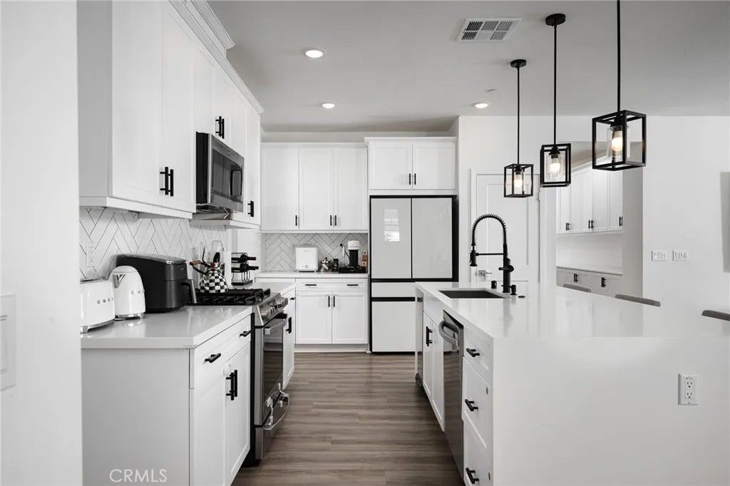 Welcome to your dream home in the highly sought-after Saddleback Place with NO MELLO ROOS and PAID SOLAR! Built in 2023, this turnkey condo offers 3 bedrooms/2 bathrooms, 1,952 sq ft of upgraded living space, and a 2-car tandem garage combining modern luxury with energy efficiency. From the moment you enter through the keyless entry, youll notice the thoughtful upgrades and designer finishes throughout this single story home located on the third level, with extra cabinetry in the entry walkway provides both style and functionality. The bright, open-concept great room is ideal for entertaining and everyday living. Built-in speakers with receiver and subwoofer create an immersive sound experience, while recessed lighting over the oversized island enhances the homes warm, inviting ambiance. The chefs kitchen is truly a showstopper, featuring: Dual waterfall countertops with matching surfaces throughout, Elegant backsplash, Quartz countertops & Shaker cabinetry, Upgraded oven/stove and microwave, Upgraded hardware and faucet, and spacious pantry. The living and dining areas open to a sunny private balcony perfect for BBQs and relaxing evenings. Upstairs, all bedrooms are filled with natural light and include upgraded lighting in bedrooms and closets. The primary suite offers an extra-large double-sink vanity and a generous walk-in closet. The guest bath features sleek glass shower doors. Additional premium touches include plantation shutters in the front and blackout shades in the bedrooms for added comfort and privacy. More highlights include: Paid solar system, Tankless water heater, and Extra cabinetry for added storage. Enjoy resort-style amenities including a pool, spa, tot playground, walking paths, and BBQ areas. Located close to top-rated schools, parks, restaurants, shopping, and the year-round events at Lake Mission Viejo. This is the turnkey, energy-efficient, upgraded home buyers are searching for and it wont last long. Make it yours today!