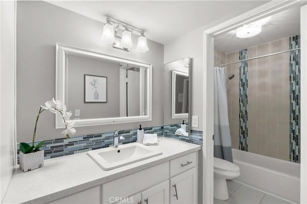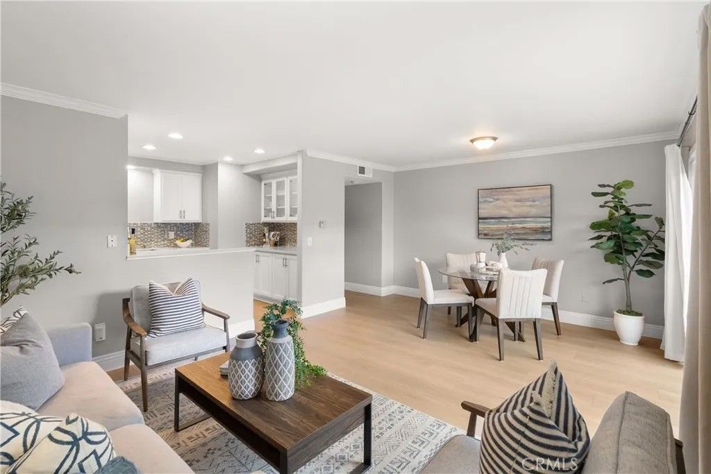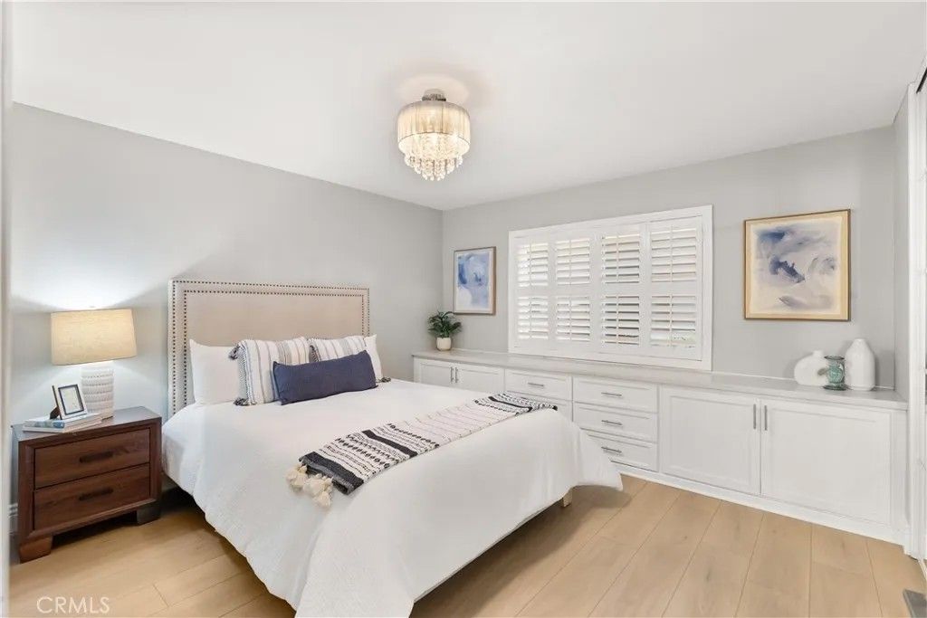 Huntington Beach move in ready downstairs unit with a large enclosed patio and no stairs, featuring brand new luxury vinyl flooring, recessed lighting, smooth ceilings, fresh designer paint, and crisp 5 inch baseboards with crown molding for a bright, finished look throughout. The updated quartz kitchen is both stylish and functional with custom cabinetry, stainless steel appliances, a farmhouse sink, designer tile backsplash, and a decorative chandelier that sets the tone for everyday living and entertaining. The spacious primary bedroom offers excellent storage, including three full sized mirrored closet doors plus built in dresser and cabinetry for effortless organization. The private ensuite bathroom showcases designer fixtures and custom tile finishes, creating a clean, spa inspired retreat. One of the standout lifestyle advantages is the ground level location, delivering easy access and a large enclosed patio that feels like an extension of the living space. Perfect for morning coffee, quiet evenings, or a bit of outdoor living without the upkeep. Additional storage adds everyday convenience. Residents enjoy community amenities including a sparkling pool, recreation room with pool table, and on site laundry. Monthly utility costs are simplified and often reduced because HOA dues include gas, water, trash, and sewer, offering meaningful built in savings and easier budgeting. Ideally located near the best of Huntington Beach, including a short drive to world renowned beaches, wetland walking trails, epicurean dining, and shopping. Enjoy quick access to Meadowlark Golf Course and driving range, plus neighboring parks for outdoor time year round. A great opportunity to enjoy comfort, style, and a low maintenance coastal lifestyle.