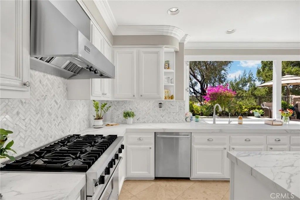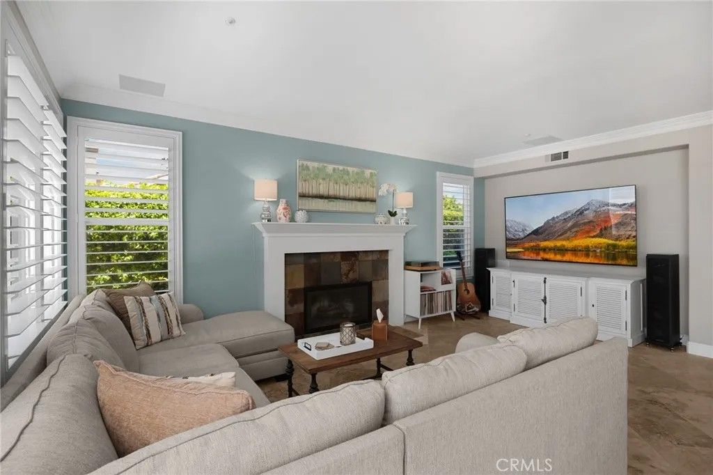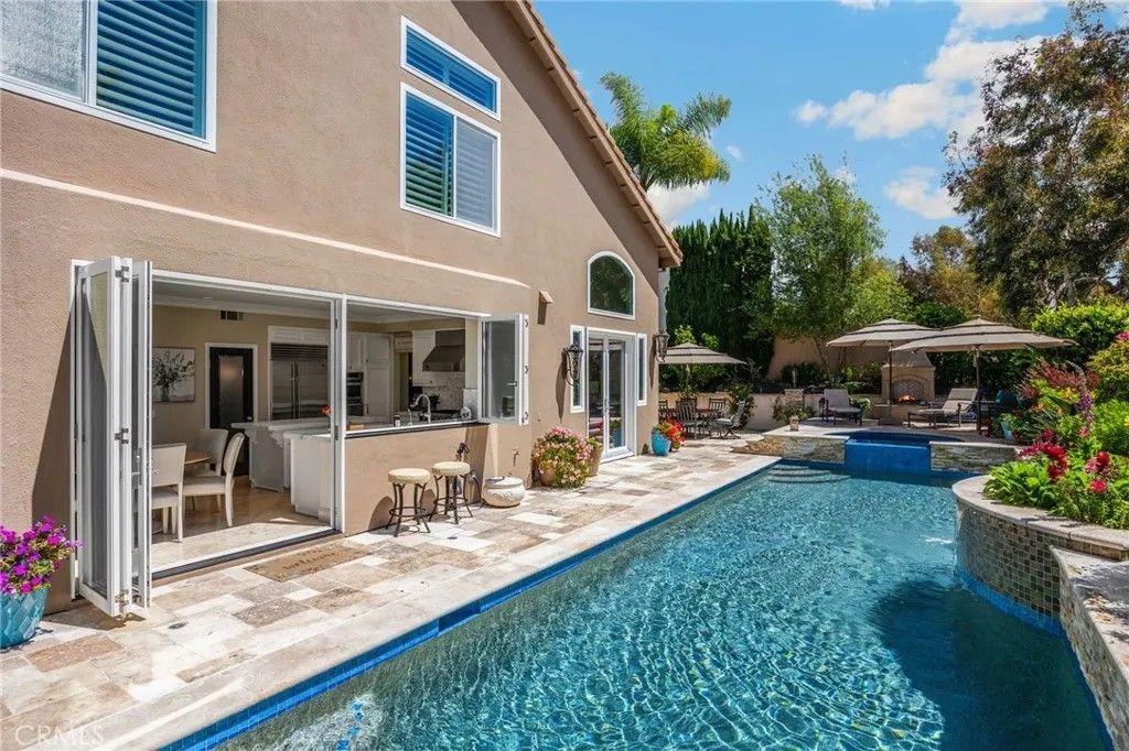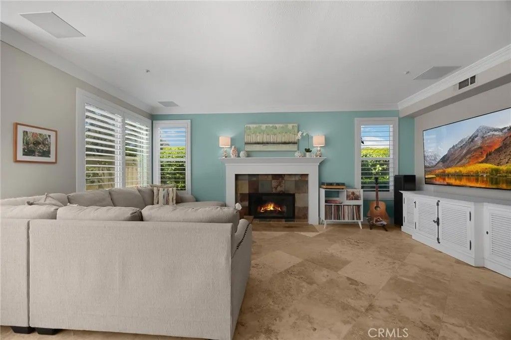 A rare find at the private end of a cul-de-sac, this beautifully upgraded 4-bedroom+office, 3 bath, 3317 sq ft coastal residence captures the essence of elevated San Clemente living. A very open, light-filled floor plan is enhanced by luxury vinyl flooring, custom shutters, vinyl windows, designer selected paint, crown moulding, and a fully prepaid solar lease-combining style, comfort, and efficiency. The entry opens to soaring vaulted ceilings and an elegant, updated fireplace in the living room, where natural light pours through large windows and flows into the dining room. French doors frame the resort backyard and sweeping views, bringing in ocean breezes and a bright, airy coastal ambience. The family room continues the open concept with travertine floors, a second updated fireplace, and a seamless connection to the kitchen. The chefs kitchen is a true coastal showpiece with porcelain countertops on all surfaces, herringbone marble backsplash. Viking professional range, Thermador convection oven+warming drawer, Sub-zero refrigerator, Bosch dishwasher, RO water system under the kitchen sink, and a walk-in pantry. A dramatic bi-fold window, and bi-fold doors open the entire kitchen and breakfast area to the pool, panoramic views. A downstairs office/optional bedroom, full upgraded bath, and laundry room with sink. The primary suite offers vinyl flooring, crown moulding, custom shutters, walk-in closet, and a zen retreat area with fireplace. The spa-inspired bath features a stand-alone soaking tub, quartz counters, dual sinks. Secondary bedrooms feature vinyl flooring, mirrored doors, shutters. Step outside to your private resort backyard, where sweeping views and total privacy create a serene coastal escape. Enjoy a Revco solar-heated, salt-water PebbleTec lap pool with spa and waterfalls, enhanced by night lighting, an outdoor fireplace, a BBQ grill with generous seating, an elevated view lounge, and an outdoor dining terrace surrounded by lush landscaping. The 3-car garage is fully finished with epoxy flooring, built-in cabinets, and a Wen clean air system, offering a pristine space. Minutes from beaches, coastal trails, boutique shopping, dining, and top-rated schools, this home delivers the bright, open, private coastal lifestyle that defines San Clemente. This property is Stunning!