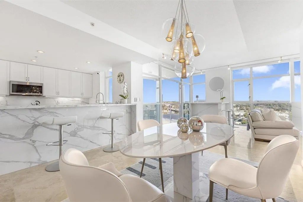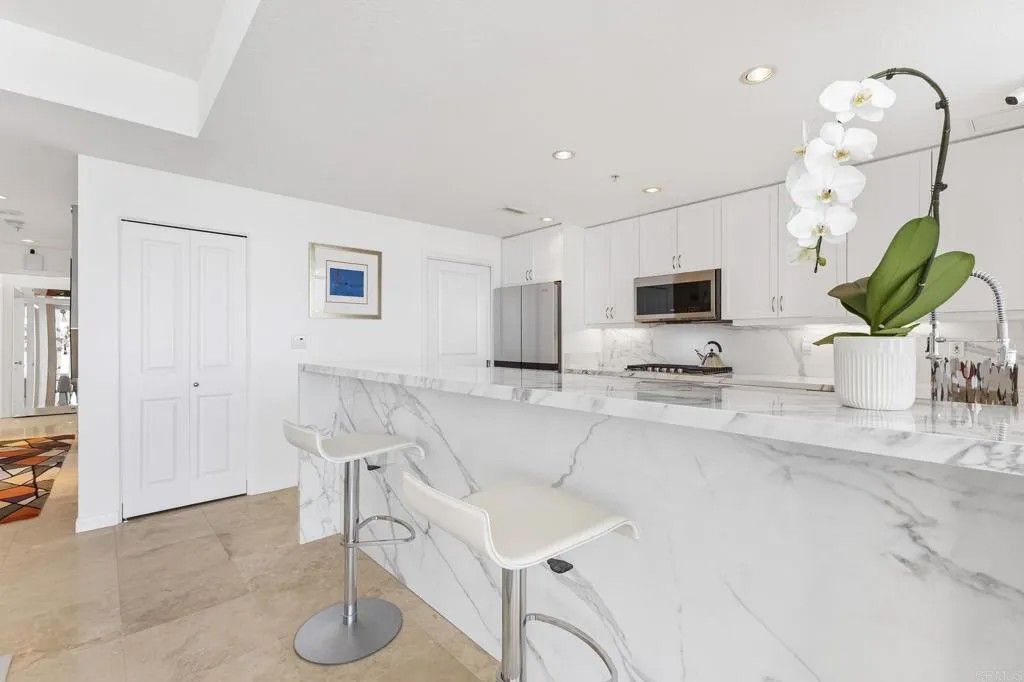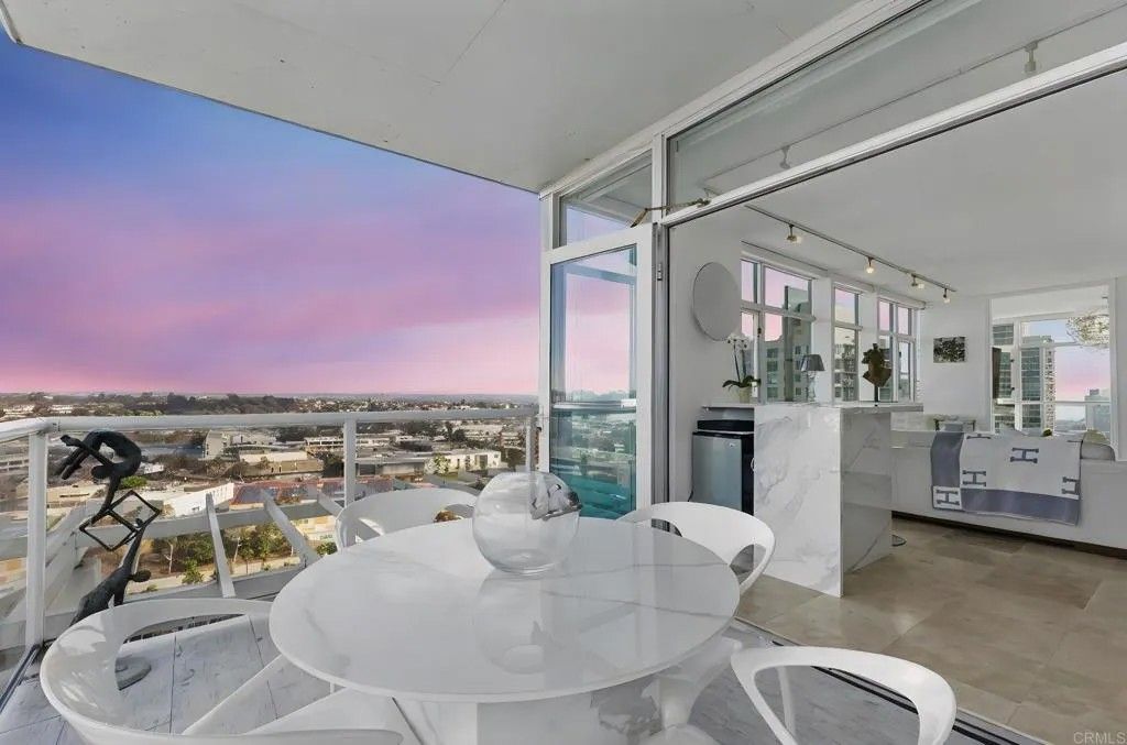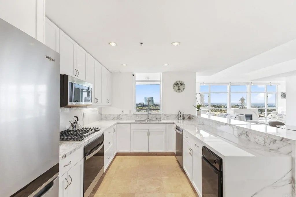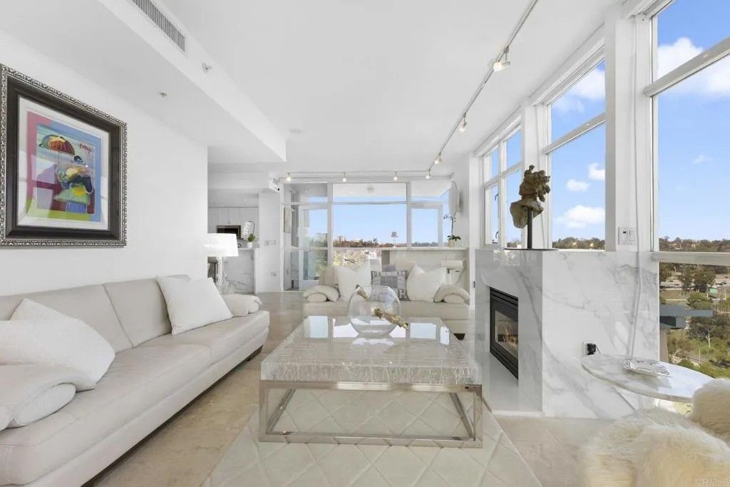 Experience the height of modern elegance in this impeccably designed 2Br 2Ba residence with den, offering the perfect blend of style and urban sophistication. Discovery at Cortez Hill is a contemporary full service luxury building offering residents comfort, convenience, and security. Expansive open-plan living areas flow seamlessly across honed travertine floors, illumilnated by statement lighting and spectacular views framed by floor to ceiling windows with automated roll-down shades and a beautiful gas fireplace. Entertain guests at the elegant bar or move to the private balcony with views of Balboa Park and the beautiful mountains to the east. Peek bay views to the west and south add to the ambiance. The chefs kitchen is both beautiful and functional, featuring sleek Italian porcelain countertops, custom cabinetry, and top-tier stainless steel appliances; an entertainers dream that anchors the homes refined aesthetic. The serene primary suite invites relaxation with blackout shades and drapes, for a restful night's sleep and a spa-inspired bath with dual marble vanity, soaking tub, walk-in shower and generous storage. The 2nd bedroom and bath provides comfort for family or guests while the versatile den provides the ideal setting for a home office, media lounge, or creative space. An in-unit laundry and walk-in pantry provide storage and convenience. The building features 24-hour concierge, a state of the art fitness center with separate weight room and cardio equipment, steam room, and sauna. The rooftop lap pool, spa, barbecues, fire-pit, and outdoor dining area are like living at a private resort. A bicycle room, business center, conference room, deeded storage and 2 secure side by side underground parking spaces round out the building amenities. This residence delivers an effortless lifestyle in one of the quietest downtown neighborhoods; placing the best of urban living, fine dining, and vibrant culture right at your doorstep.