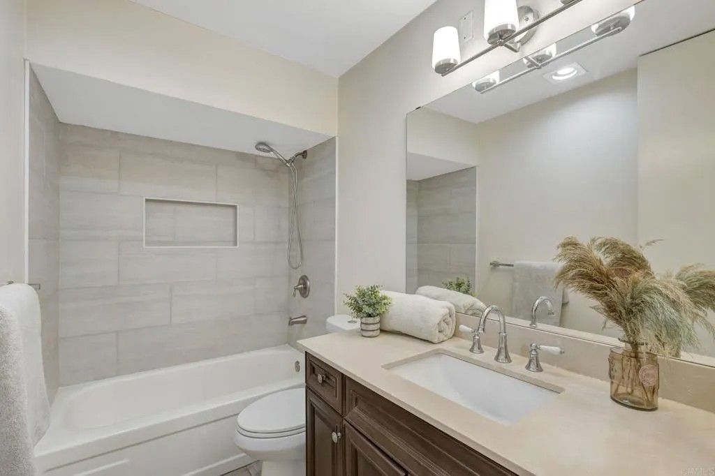 Beautifully updated and move in ready 2 bedroom 1 bath residence at Pacific Isle offers resort-style living in North Point Loma includes stunning upgrades and finishes. Modern kitchen with refinished cabinets, new counters, sink, faucets, stylish cabinet handle pulls and stainless appliances. Relax and refresh in the gorgeous remodeled bathroom with coastal colored vibes, including neutral sleek shower-tub tile surround, new vanity, counters, mirror, lighting, flooring and fixtures. Both bedrooms with views of the courtyard include large closet with plenty of wardrobe space. Secondary bedroom ideal size for guest room, home office or both! The open layout flows to an amazing spacious patio where you may lounge, dine and enjoy the skies of San Diego. A rare find, this patio location, is over looking the lush courtyard, sparkling pool and tennis courts. Use of the gym, club house, volley ball, grilling, game room, community laundry all included! Unwind with the sounds of the tranquil waterfall pond in a tropical setting and stroll the peaceful walk ways. Not only private and gated, this community includes 2 tandem parking spaces in the detached carport style garage with easy quick access to the second floor either take the elevator or stairs! Other extras include AC wall unit, vertical window blinds, mirrored closet doors with oversized hall closet perfect for pantry, wine or coffee bar and storage. This central living quarter near to SD Airport, Mission Bay, Sea World, downtown, Fashion Valley, beaches, and Cali sunsets. Grocery, shopping, banking, transportation, eateries all at your finger-tips! A true coastal retreat with modern comfort and lifestyle, perfect for a primary residence or vacation home!