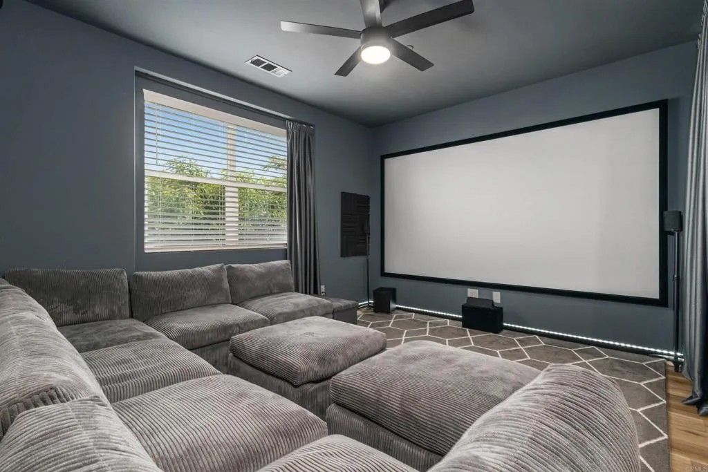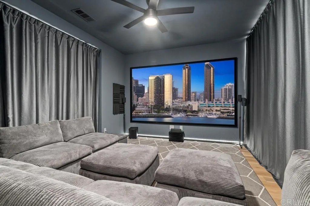 Step into this exceptional tri-level townhome in the Village of Montecito, a rare opportunity to own one of the most thoughtfully upgraded homes in the community. This 4 bedroom, 3.5 bathroom residence offers 2,342 square feet of beautifully designed living space created for modern living and effortless comfort. The open-concept main level welcomes you with luxury vinyl flooring, high ceilings, and abundant natural light. The chef-inspired kitchen features Samsung smart appliances, quartz countertops, a large island with bar seating, and custom cabinetry that provides exceptional storage. Perfectly connected to the living and dining area, this inviting space is ideal for entertaining or relaxing at home. Upstairs, the primary suite offers a serene retreat with a spa-style bathroom, dual sinks, an oversized shower, and a walk-in closet. Two additional bedrooms, a full bathroom, and a generous laundry room complete this level, combining practicality and style for everyday living. The third floor is a true highlight, featuring a private bedroom with its own full bathroom and a professionally designed home theater loft that conveys with the home. Its the perfect space for guests, extended family, or movie nights. Every detail has been curated for convenience and peace of mind, including smart-home technology, solar panels, an EV charger, and all appliances included. The attached two-car garage offers additional storage and direct access. Located in the highly sought-after Village of Montecito, residents enjoy resort-style amenities such as a pool, spa, clubhouse, fitness center, playgrounds, and BBQ areas. All of this is just steps from Grove Park and within walking distance to highly rated schools. This stunning home delivers the perfect blend of modern design, comfort, and location... truly one of a kind in Otay Ranch.