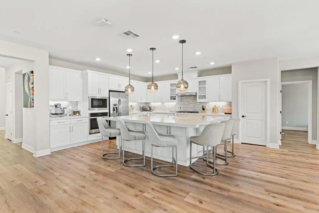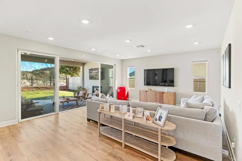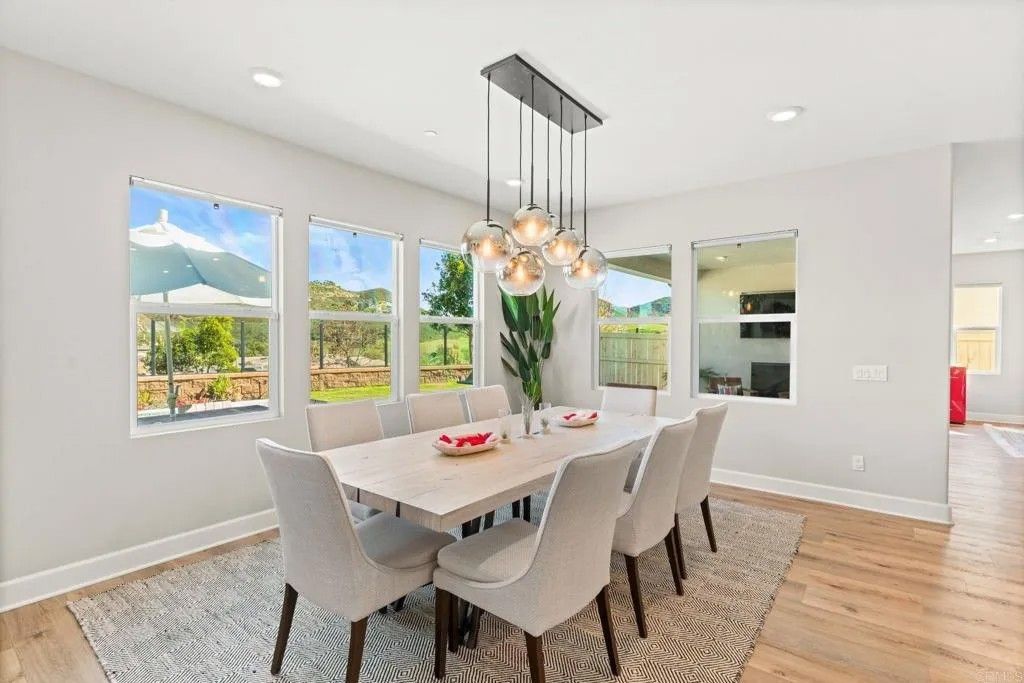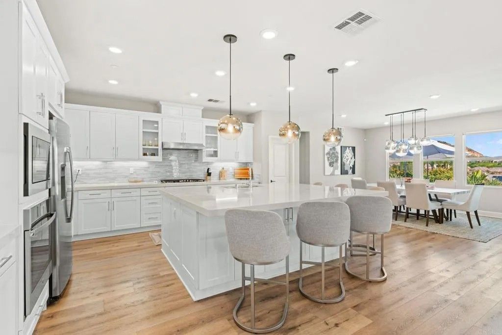 SPECTACULAR PANORAMIC VIEWS define this exceptional residence, gracefully positioned on a cul-de-sac in the highly sought-after Harmony Grove Village. Designed to capture sweeping vistas and effortless indooroutdoor living, this remarkable home showcases a fully landscaped backyard with a sparkling saltwater pool, a spa, and glass fencing to take in the impressive views - an entertainers dream. Offering 5 bedrooms and 4.5 bathrooms, the thoughtfully designed 3,465 square-foot floor plan includes a downstairs bedroom with en-suite perfect for guests and a home office with custom built-in cabinetry, ideal for todays flexible lifestyle. The kitchen is beautifully appointed with an oversized center island, walk-in pantry, crisp white shaker cabinetry, and designer backsplash upgrades that extend throughout the kitchen and baths. Upstairs, an expansive bonus room provides versatile living space, while the luxurious primary suite features sweeping views from the large windows, an en-suite bath, and walk-in closet. Secondary bedrooms include en-suite baths, offering comfort and privacy for family and guests alike. Luxury vinyl plank flooring flows seamlessly throughout the home, complemented by elegantly tiled bathrooms. Dual-zone air conditioning ensures year-round comfort. Energy-efficient enhancements include fully paid solar, a Tesla EV charger, and a storage battery system. An upgraded security system with Ring doorbell camera adds peace of mind. Harmony Grove Village residents enjoy exceptional community amenities including a resort-style pool, BBQ areas, multiple parks, scenic walking and biking trails, playgrounds, and a dedicated dog parkembracing the very best of San Diego County living!