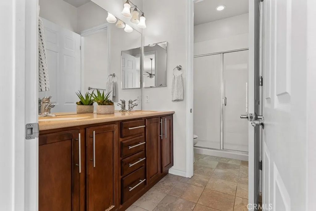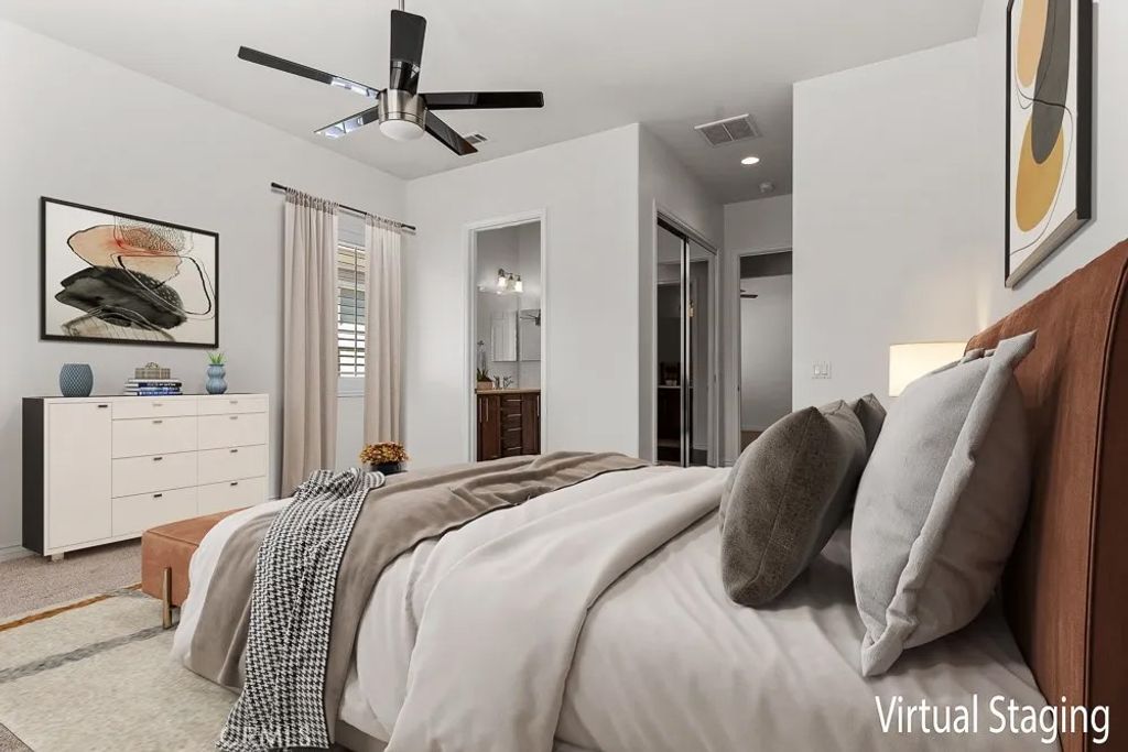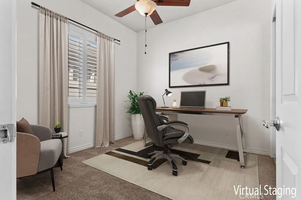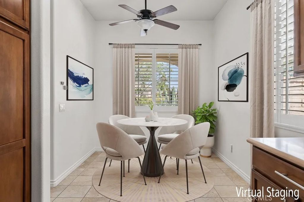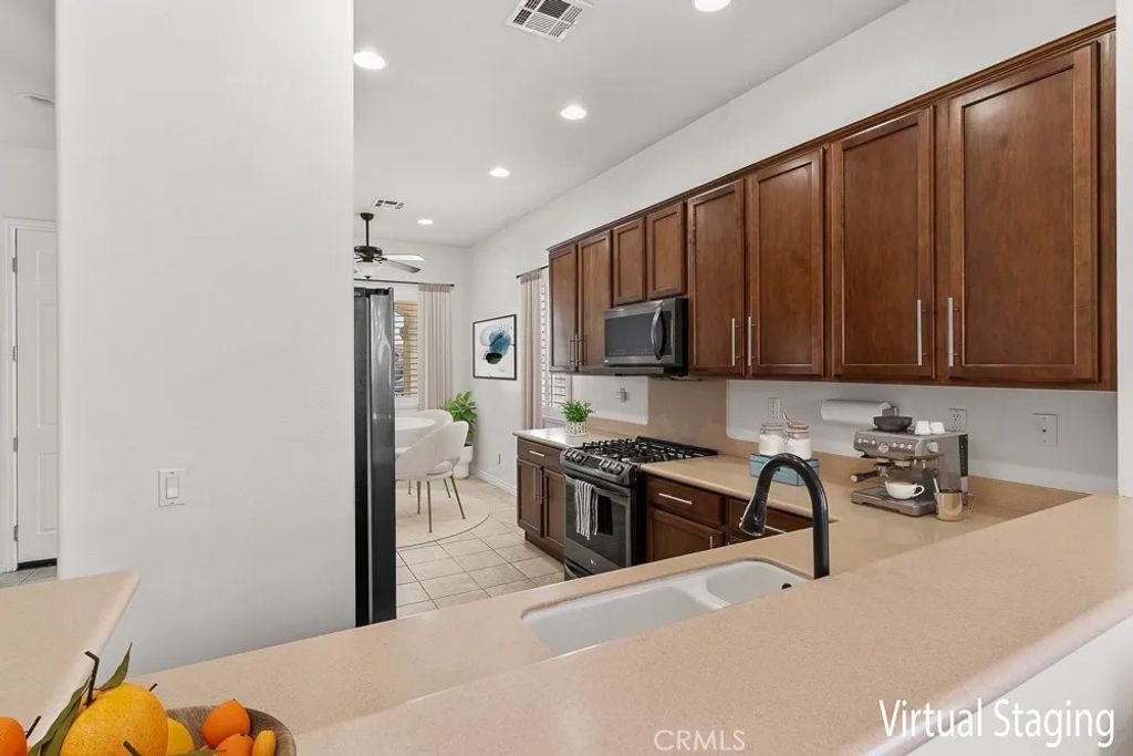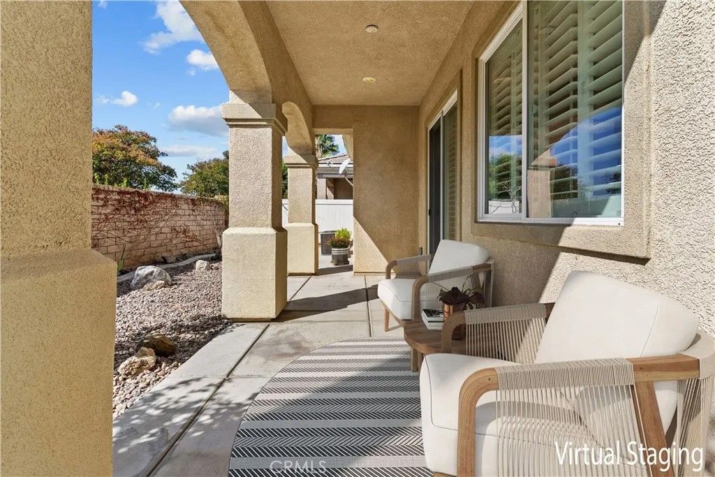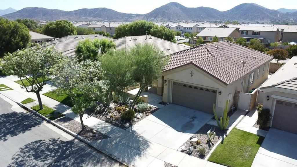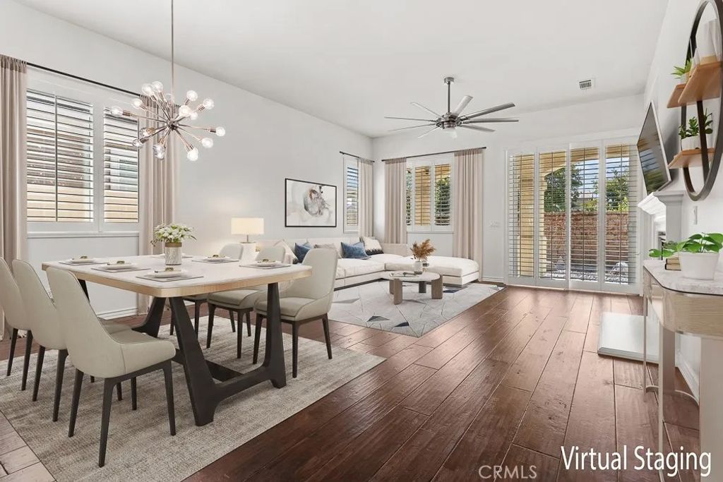 Welcome to Solera Diamond Valley by Del Webb 55 + community. This single-story, 2-bed/2-bath home pairs easy, low-maintenance living with resort amenities. Interior highlights include high ceilings, window shutters, high-end wood floors, new interior paint, carpet, a gas fireplace and an open great room that extends to covered patio. The kitchen offers Corian counters, a gas range, and a separate breakfast nook perfect for morning coffee and afternoon shade. The primary suite features dual sinks, a walk-in shower, and two closets (one walk-in, one standard). The garage adds three overhead storage racks for extra space. Friendly, pet-accommodating community. Enjoy the Lodge with indoor lap pool & spa, two outdoor pools, fitness center, courts, clubs, and trailsminutes to Diamond Valley Lake, shopping, and dining.