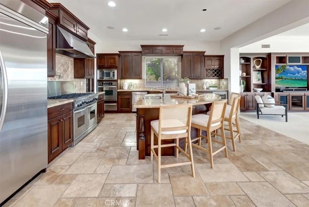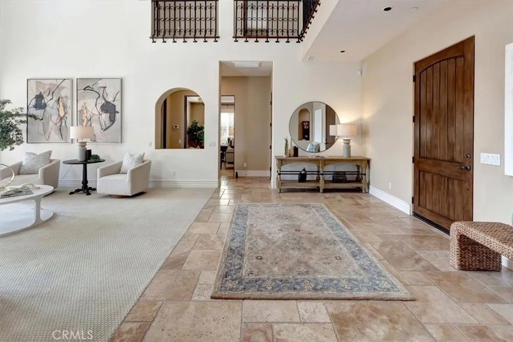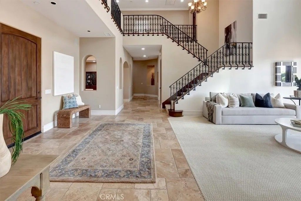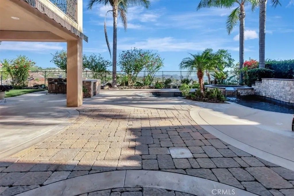 Tuscan Elegance with Panoramic City Views in Guard-Gated Hillcrest. Discover timeless sophistication in this stunning Tuscan-style estate built in 2005, offering 6,468 sq ft with 5 bedrooms, 5.5 baths, and a 4-car garage. The open-concept design connects the family room and gourmet kitchen featuring custom cabinetry, granite counters, prep sink, and professional-grade stainless appliances. A main-floor bedroom with en-suite bath provides ideal guest or multi-generational living. The primary suite includes a sitting area, double-sided fireplace, spa bath, and large deck with sweeping valley views. Enjoy resort-style outdoor living with a sparkling pool, spa, and built-in BBQ island surrounded by lush landscaping. Set on a cul-de-sac within the exclusive Hillcrest guard-gated community, this home defines refined Orange County.