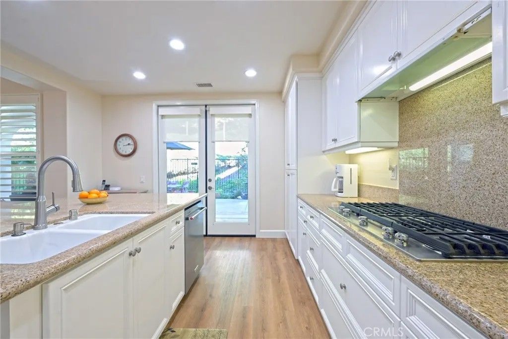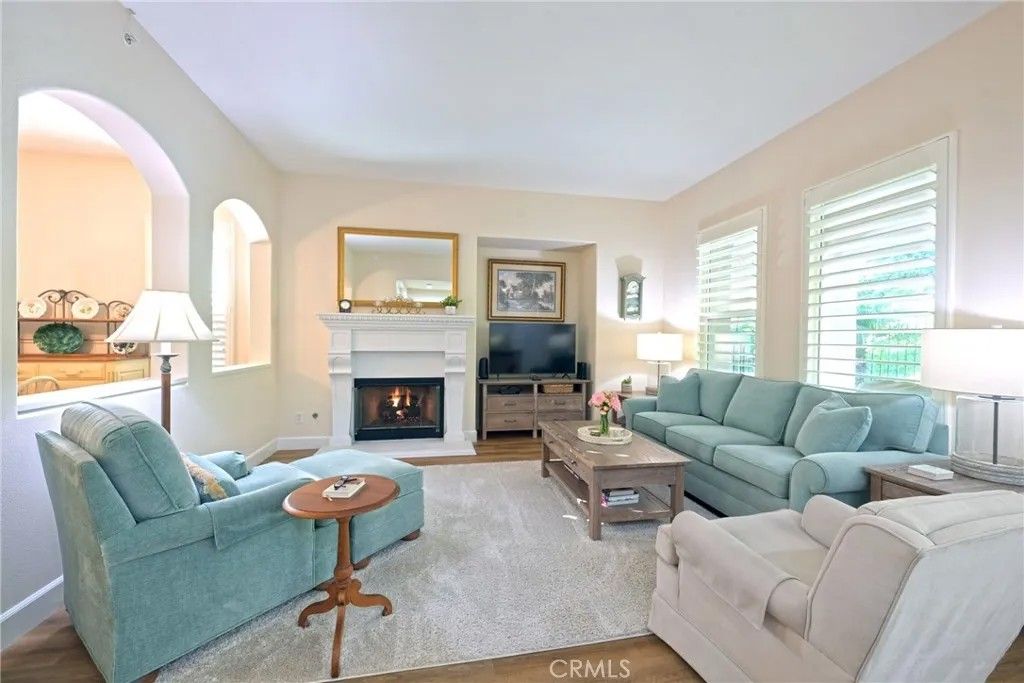 Welcome to luxury living in the prestigious San Lorenzo community of Yorba Linda. This fabulous single-level corner-unit townhome offers 1,702 square feet of beautifully appointed living space, three bedrooms, two-and-a-half bathrooms, and an attached two-car garage. The interior features luxury vinyl plank flooring and plantation shutters throughout, creating a warm and sophisticated atmosphere. The stunning gourmet kitchen features granite countertops, a large island with bar seating, stainless-steel KitchenAid appliances, including a five-burner cooktop, LED recessed lighting, and an abundance of cabinetry. The kitchen opens to an inviting family room enhanced by high ceilings and a charming gas fireplace with logs. The dining room offers high ceilings and a new chandelier. The spacious primary bedroom features an elegant arched window and leads to a luxurious primary bathroom appointed with dual sinks, Corian countertops, a tile backsplash, a large wall-sized mirror with upgraded fixtures, a soaking tub, a frameless glass shower, and a generous walk-in closet with a chandelier. The secondary bedrooms are equally inviting, offering high ceilings and mirrored closet doors. The hall bathroom includes a tub/shower combination with Corian countertops, while the powder room provides a pedestal sink and updated fixtures. Additional conveniences include an inside laundry room with built-in cabinetry and a two-car garage with epoxy flooring and a workbench area. A spacious backyard space with updated landscaping includes a lemon tree and a newer gazebo. Recent upgrades completed in 2020 include the water heater, interior paint, flooring, baseboards, kitchen faucet, garbage disposal, several appliances, and refreshed backyard landscapingenhancing both comfort and curb appeal. HOA amenities include a swimming pool, spa, and clubhouse. This exceptional property offers upscale living in a serene community close to shopping, dining, and award-winning schools.