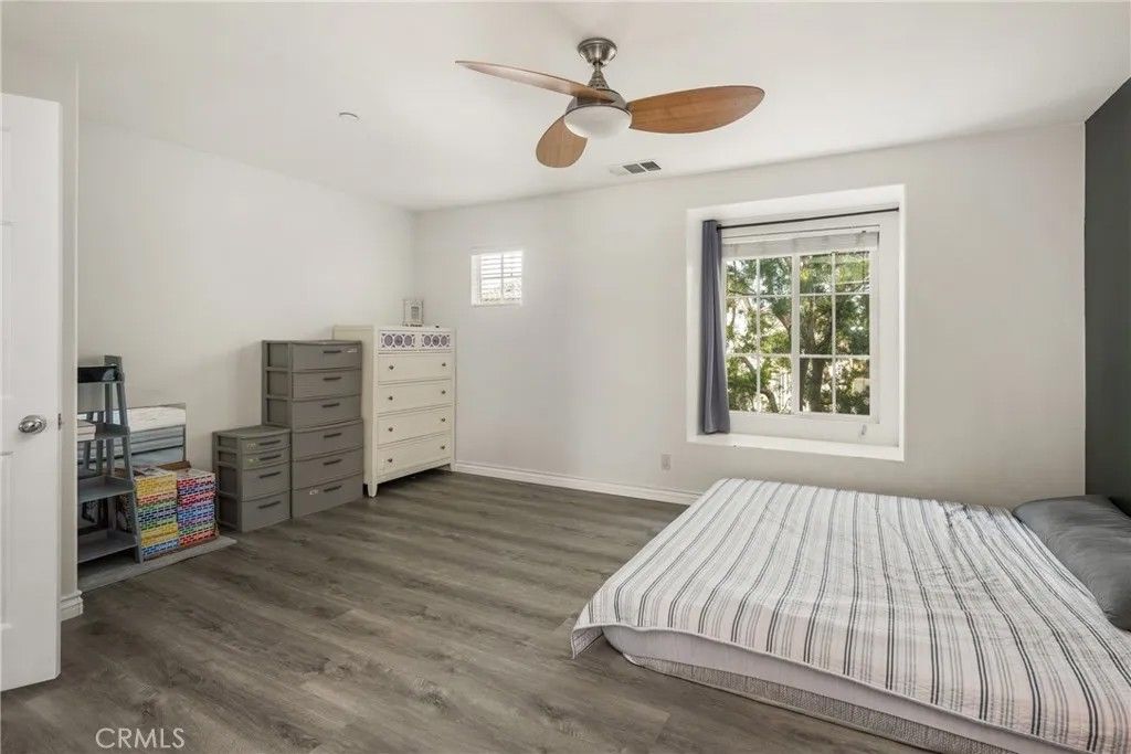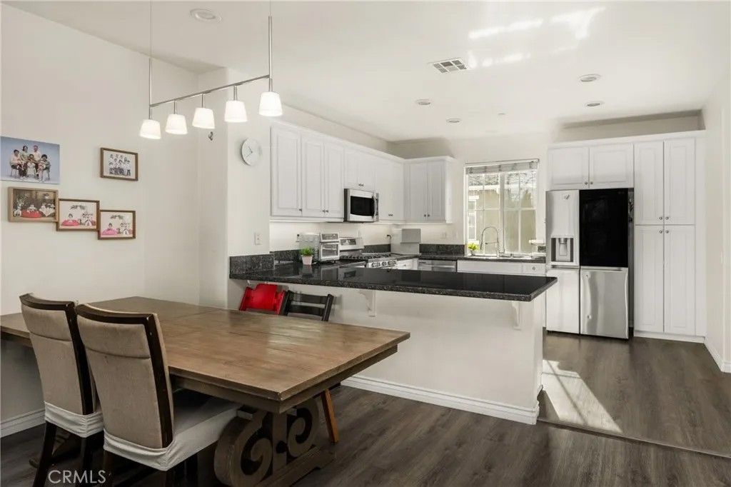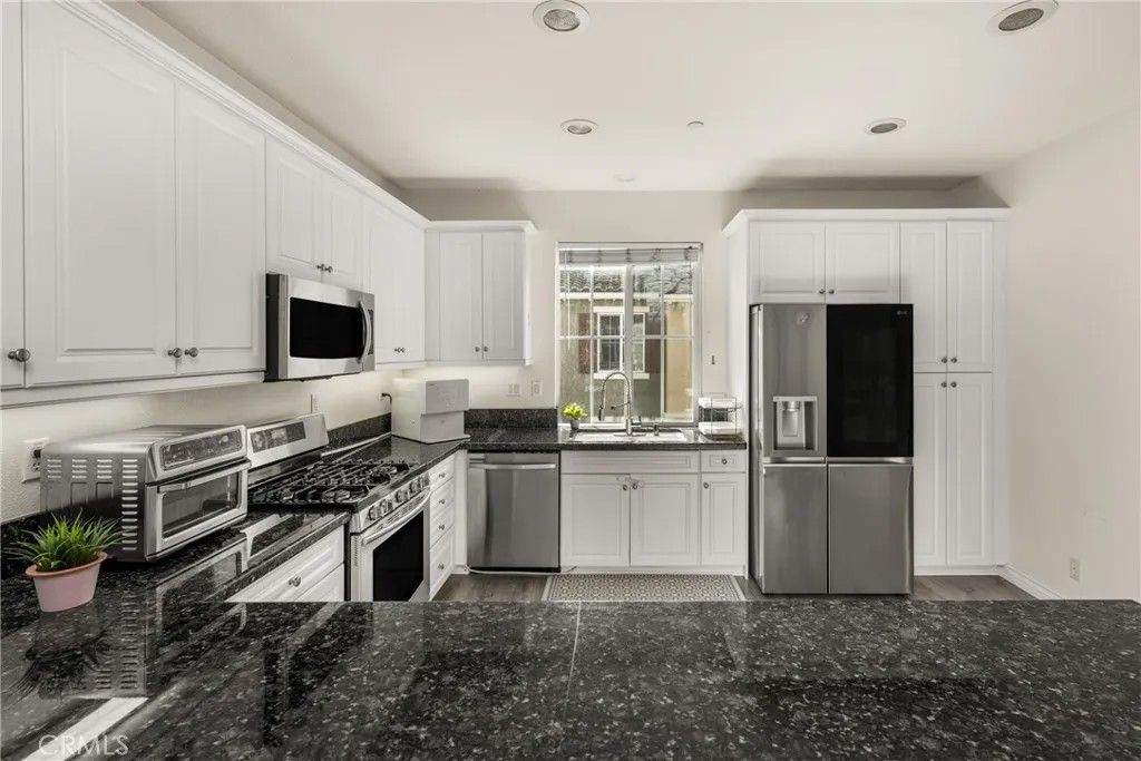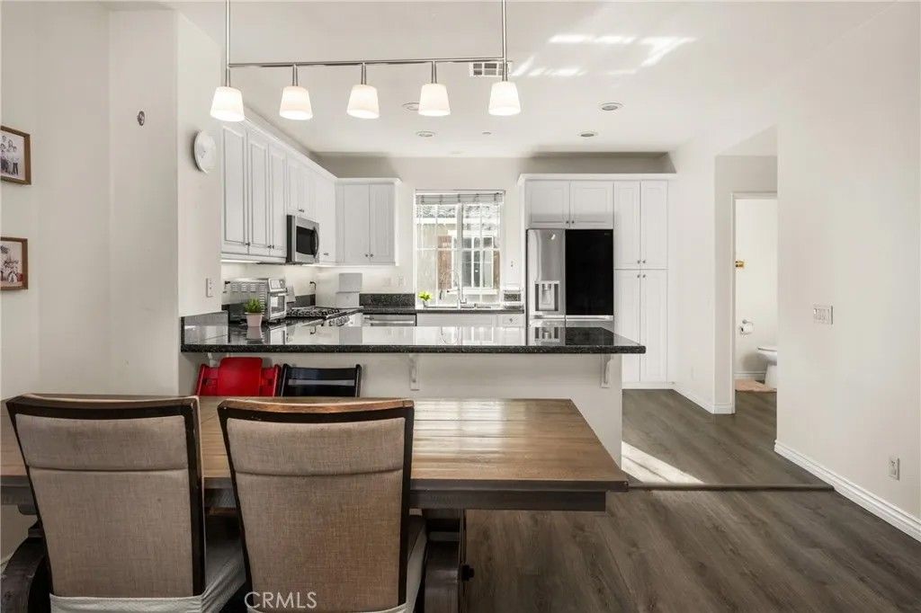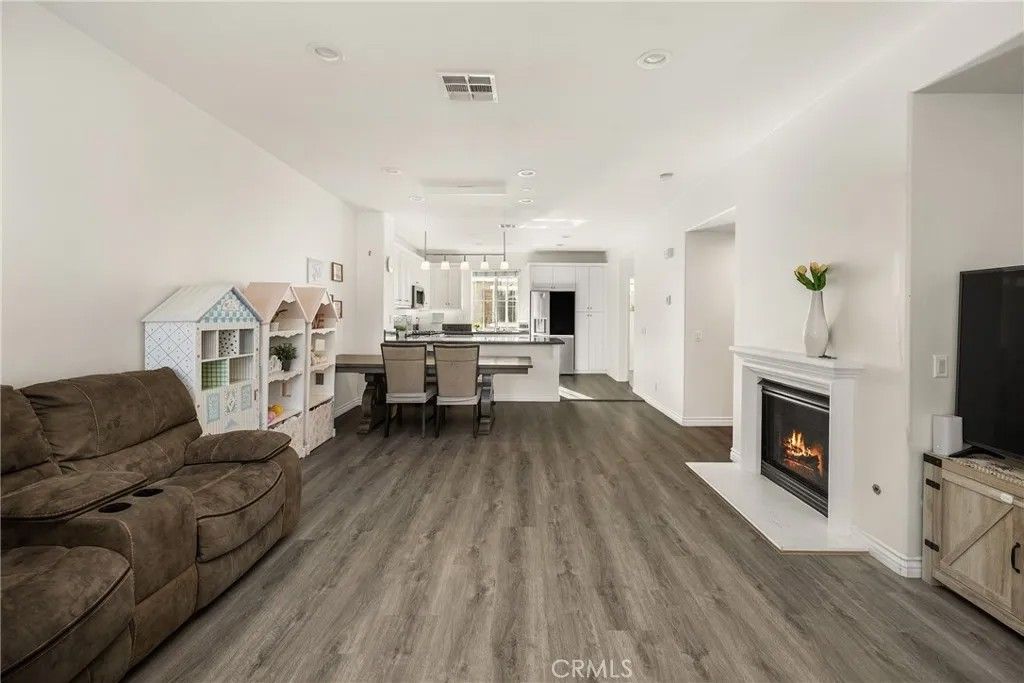 Welcome to this beautiful 2-bedroom, 2.5-bath condo in the highly desirable, gated Serafina community, situated in a quiet area away from the front gate. Offering approximately 1,550 square feet of thoughtfully designed living space, this home features handsome wood laminate flooring throughout and a versatile, multi-level layout ideal for todays lifestyle. The entry level includes a spacious bedroom with a full bathroom and direct access to the attached two-car garageperfect for guests, a home office, or an ideal mother-in-law suite. The main living level is an entertainers dream, showcasing a large open-concept design with a generous kitchen featuring granite countertops, white cabinetry, stainless steel appliances, an oversized breakfast bar, and abundant counter space. The kitchen flows seamlessly into the dining and living areas, where a cozy fireplace creates a warm and inviting atmosphere. A convenient half bath and laundry room complete this level. Upstairs, youll find a spacious primary bedroom with an en-suite bathroom featuring dual sinks and a walk-in closet. The third level also offers an open loft space, ideal for a home office, nursery, or even the potential for a third bedroom. Residents of Serafina enjoy resort-style amenities including 24-hour security, a pool and spa, basketball court, BBQ areas, and playgrounds. The HOA also covers water, trash, and landscaping, making for easy, low-maintenance living. Conveniently located near shopping, dining, and major freeways, this is a wonderful place to call home.