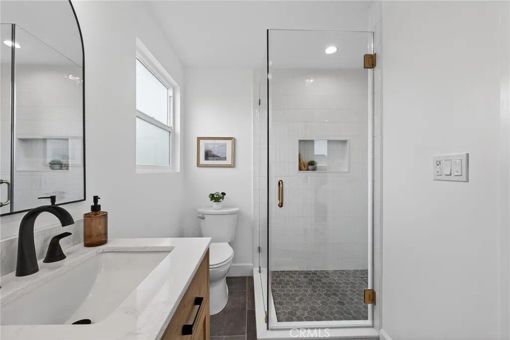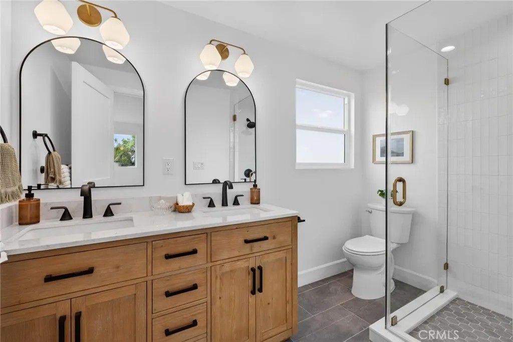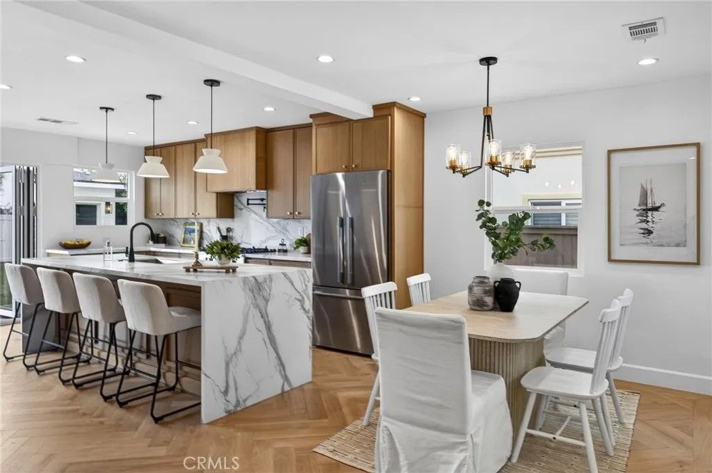 From its full-scale renovation to its light-filled layout and prime Manhattan Beach location, 1167 Magnolia Ave is a beautifully reimagined 4-bedroom, 3-bathroom home offering comfort, style, and a coveted Liberty Heights address. Inside, the open-concept living area flows seamlessly from the living room to the dining space and into a designer kitchen featuring a large quartz island with waterfall edges, matching quartz backsplash, Fisher & Paykel appliances, and a 6-burner range with pot filler. Accordion-style 8-foot bifold doors lead out to a newly built all-weather Trex deck and a spacious, flat backyard, perfect for effortless entertaining and play. Two downstairs bedrooms and a remodeled full bathroom offer flexibility for guests or a home office setup, while upstairs features another generous bedroom, an updated full bath, and a serene primary suite complete with a walk-in closet and a beautifully remodeled ensuite bath with dual vanities and an oversized shower. Throughout the home, engineered hardwood floors and energy-efficient windows bring warmth and light to every corner, while thoughtful tech touches like a Google Nest smart thermostat and doorbell offer modern convenience. The detached, front-facing garage is fully drywalled, EV-ready, and positioned at the back of the lotopening up additional possibilities for creative use or future expansion. Additional improvements include a brand-new roof, upgraded 200-amp electrical panel with all-new wiring, new plumbing throughout, and a new high-efficiency heat pump HVAC system. Freshly landscaped front and back yards with automatic sprinklers complete this move-in-ready package. Located just 1.4 miles from the beach and Manhattan Beach Pier, and only blocks from Meadows Elementary, Manhattan Beach Middle, Polliwog Park, and local shops and dining, this home delivers the best of Manhattan Beach living with nothing left to do but move in and enjoy.