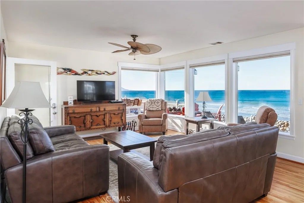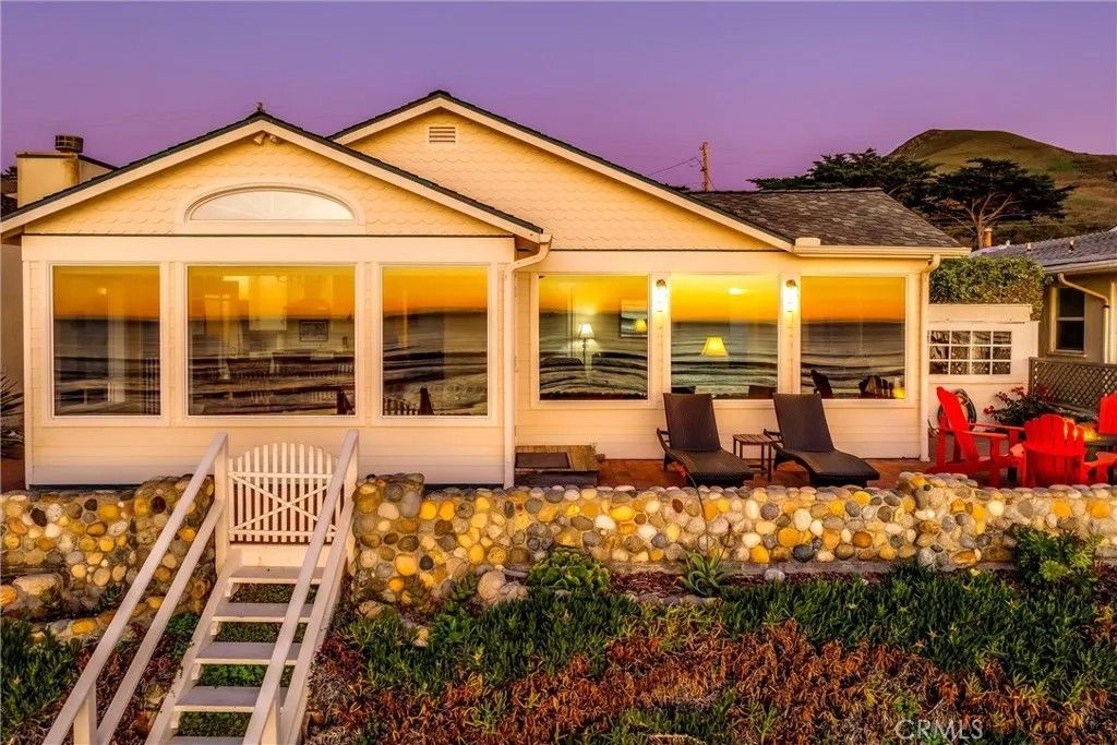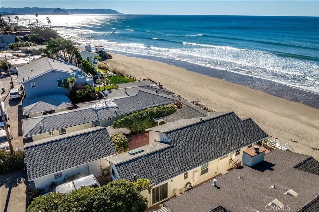 Rare oceanfront offering. This distinctive two-lot parcel comprises approximately 7,400 square feet, with 50 feet of ocean frontage and over 145 feet of depth. Situated closer to the bluff edge than neighboring residences, the property enjoys sweeping point-to-point coastline views and dramatic white-water vistas, enhanced by offshore rock formations. A set of finely crafted private stairs descends through an ice plantcovered bluff to a broad sandy beach below. The property includes a street-side two-car garage with additional storage, along with separate guest quarters, offering flexibility for visitors, extended family, or private accommodations. Beyond the garage is a sheltered interior patio well suited for container gardening, a spa, or outdoor entertaining. The main residence is accessed from the patio and opens into a full-width great room featuring vaulted ceilings, expansive glass, and an open-concept living, dining, and kitchen area. Wood flooring and detailed ceiling insets contribute warmth and architectural interest, while ocean views are enjoyed throughout the primary living spaces. The main living area includes a fireplace, ceiling fan, and a stackable washer/dryer discreetly located in a living room closet. The efficient kitchen is appointed with granite countertops, updated cabinetry, and stainless steel appliances. The dining area is highlighted by an arched window and plank-style ceiling. The main residence offers two bedrooms with ample natural light, including one generously sized to accommodate twin beds, along with a full bathroom featuring a pedestal sink. A wide bluff-top patio extends from the living area and provides direct access to the private beach stairs. This rare oceanfront parcel, combined with private beach access, expansive views, and separate guest quarters, presents a truly unique coastal opportunity