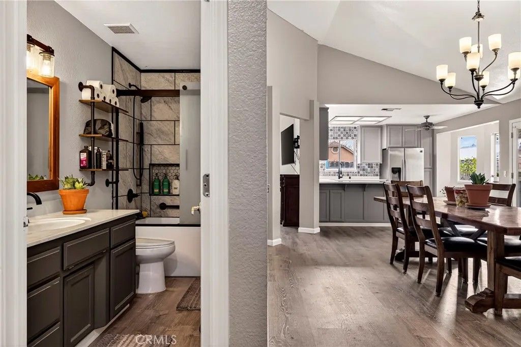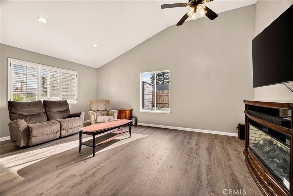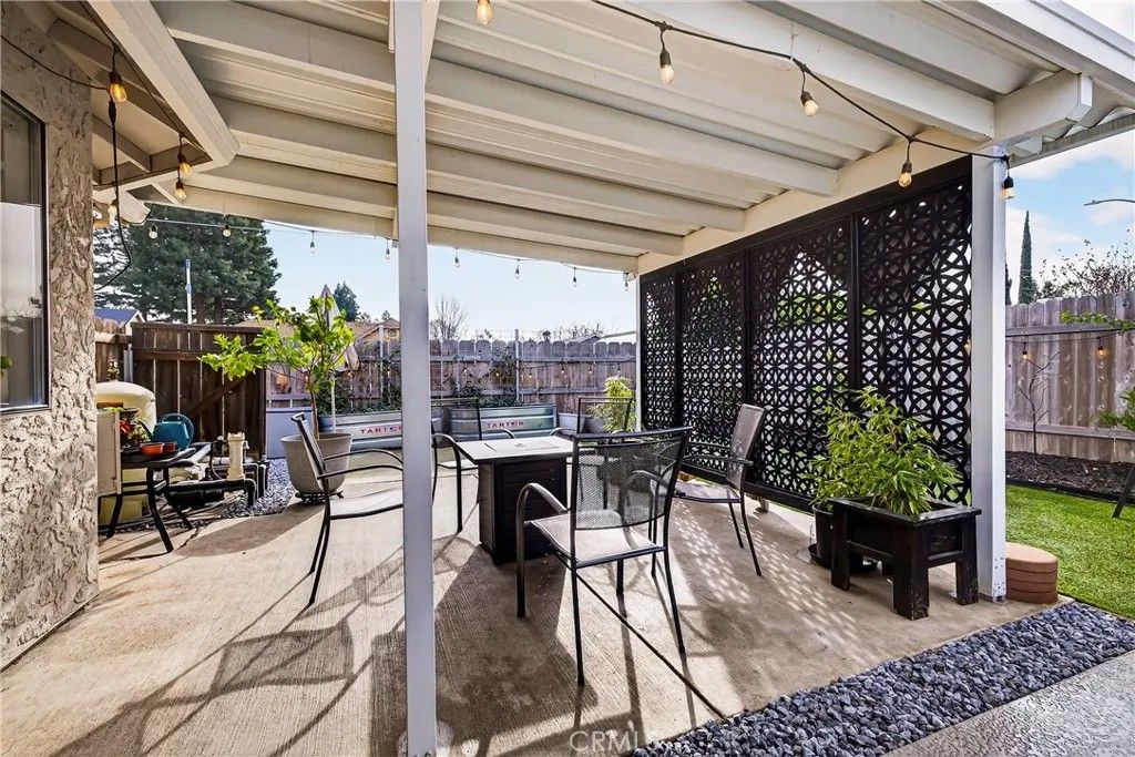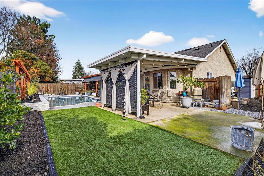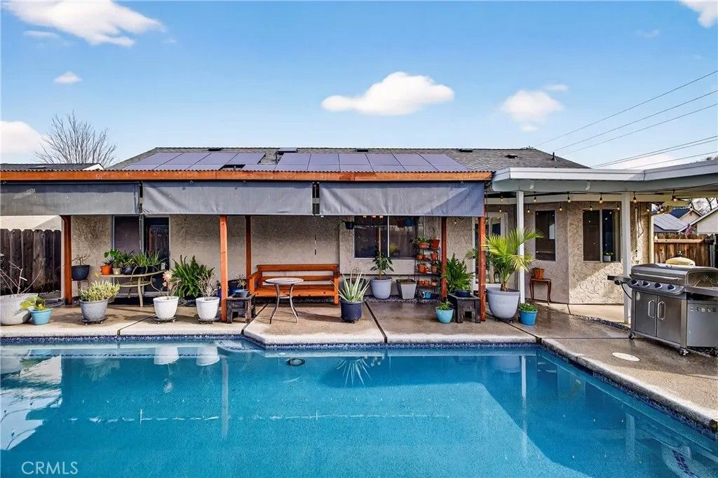 Beautifully Upgraded Home with Owned Solar and Resort-Style Backyard! This stunning home offers an owned 8.082 kW solar system with 28 micro-inverter panels, keeping energy costs low all year long. The seller has recently completed an extensive backyard renovation featuring a Pebble Tech resurfaced in-ground pool, elegant ledger stone and marble accent wall, and a stylish planter areacreating an unforgettable outdoor living space. Inside, youll find comfort and modern luxury with a new high-end Lennox central heat and air system and 2025 luxury plank flooring throughout. The upgraded kitchen showcases Cambria Quartz countertops, a beautiful tiled backsplash, Samsung stainless steel appliances, freshly painted cabinets, a deep 10" farm sink, and a cozy bay window breakfast nook. The 6-foot eating bar provides additional space for dining or entertaining. The spacious living room impresses with vaulted ceilings, recessed lighting, plantation shutters, and a new ceiling fan/light fixture. Off the kitchen, an additional living or dining area offers vaulted ceilings, a pantry closet, and glass door access to the backyard retreat. The primary suite features vaulted ceilings, a slider to the backyard, and mirrored closets. The primary bathroom includes dual sinks, a solid surface countertop, a new toilet, and a sleek step-in shower with glass doors. The guest bathroom has been upgraded with a luxurious 17" deep soaking tub, Carrara marble tile walls, glass enclosure, and a new toilet. The backyard is an entertainers dream, featuring the resurfaced Pebble Tech pool, granite and marble ledger stone accent wall, and large 30-ft covered pergola with roll-down sunshades. A second covered patio adds 170 sq. ft. of shaded relaxation space. On the south side, a cross-fenced garden area with raised garden beds. Currently growing are a lemon, orange, lime, and tangerine trees which takes full advantage of the beautiful southern sunperfect for homegrown enjoyment! This property truly blends energy efficiency, style, and resort-quality livingyour personal paradise awaits!